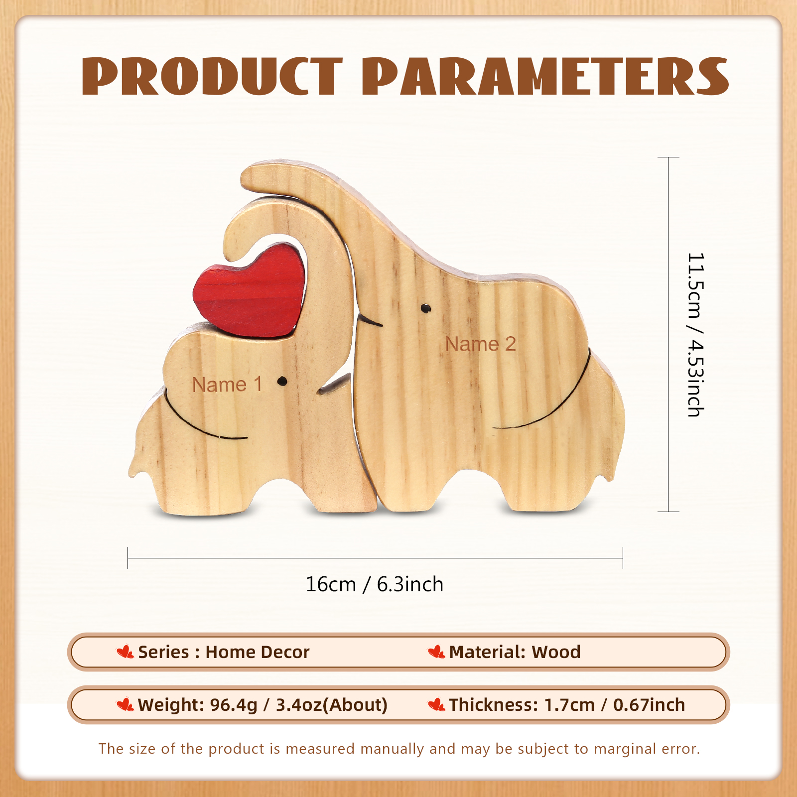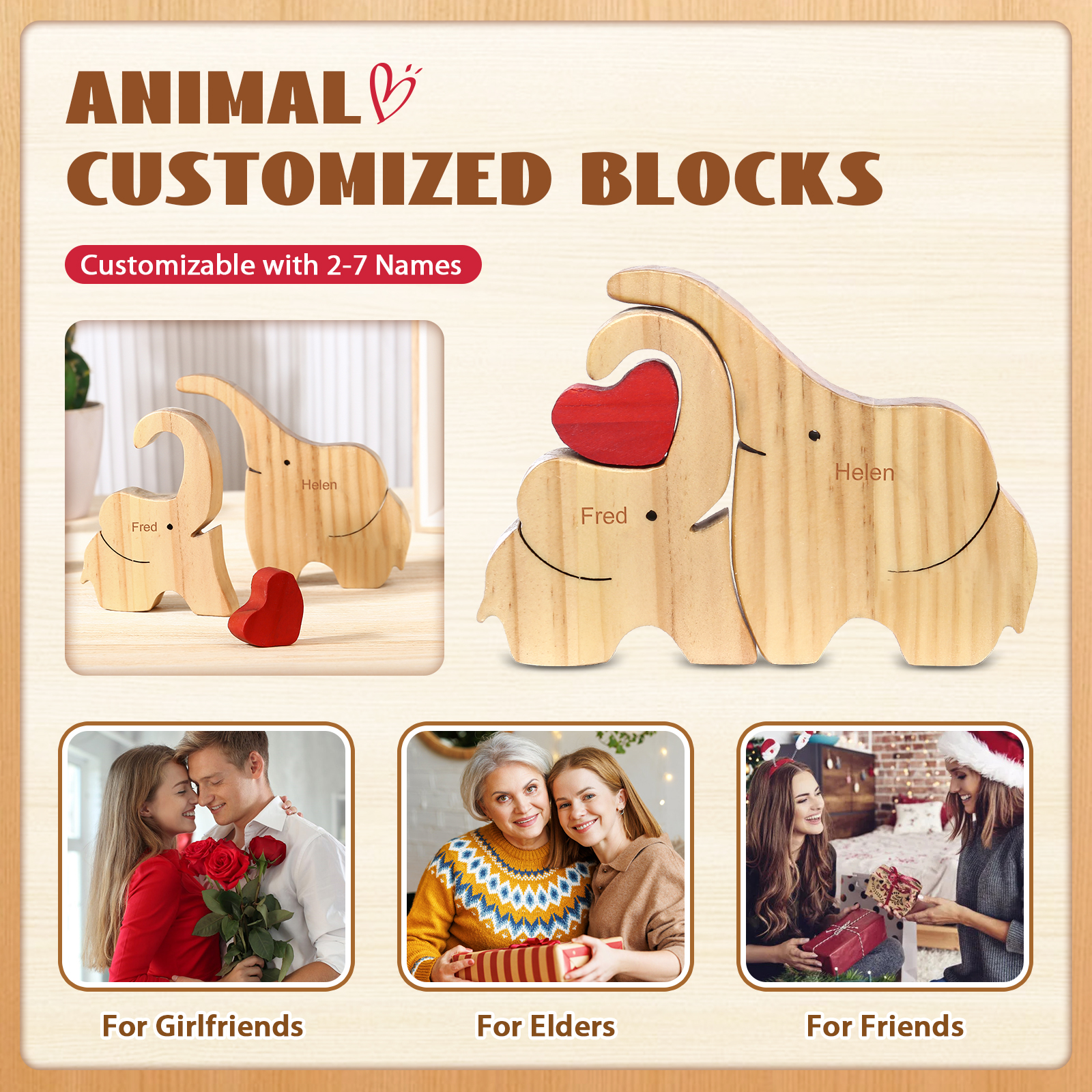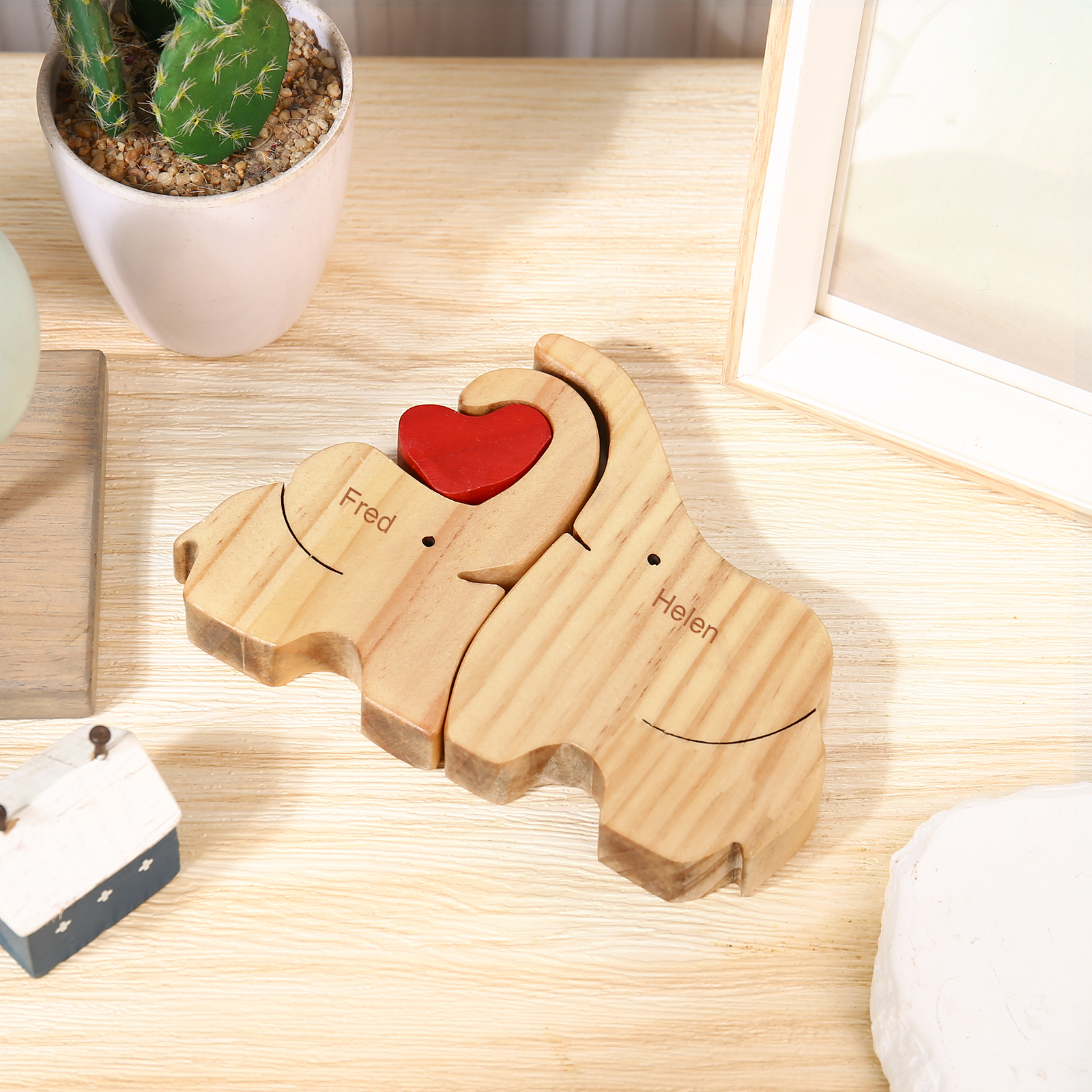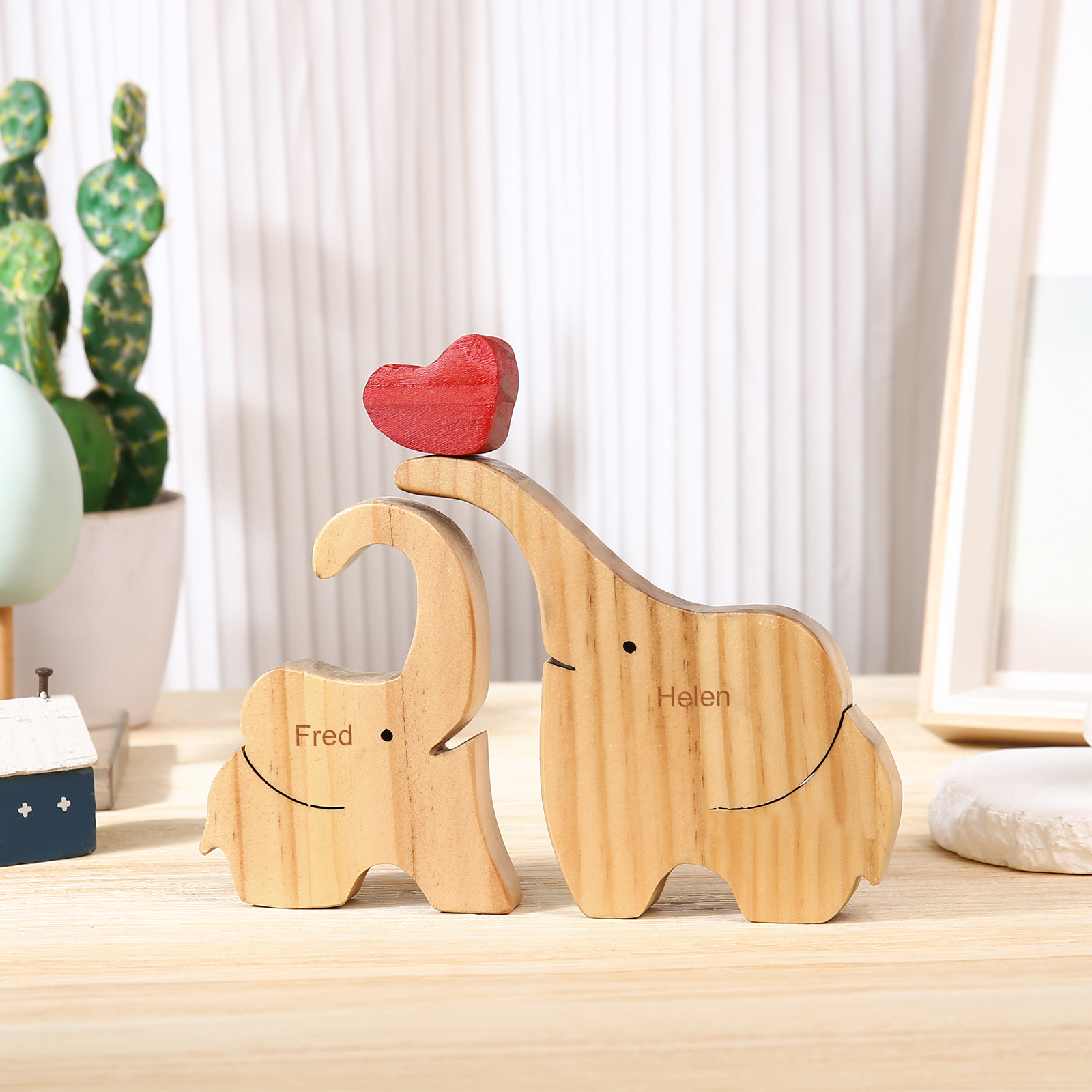 Holzskulptur-Personalisierte 2 Namen Elefanten Familien Holz Deko für Familie