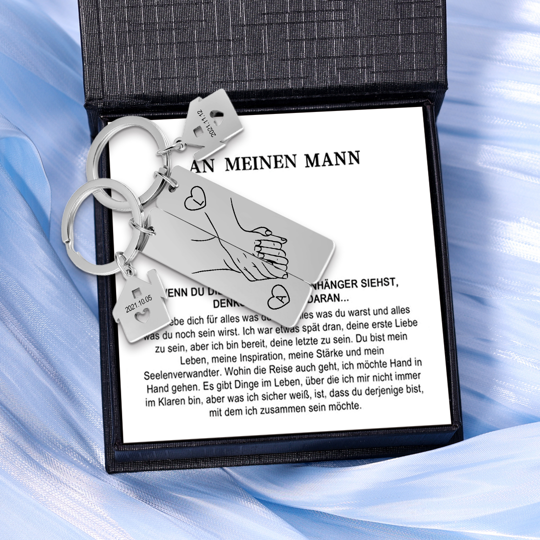 Personalisierbar 2 Buchstaben & 2 Datum- Hand in Hand Zuhause Paar Metall-Schlüsselanhänger-An meinen Mann-Geschenk mit Nachrichtenkarte