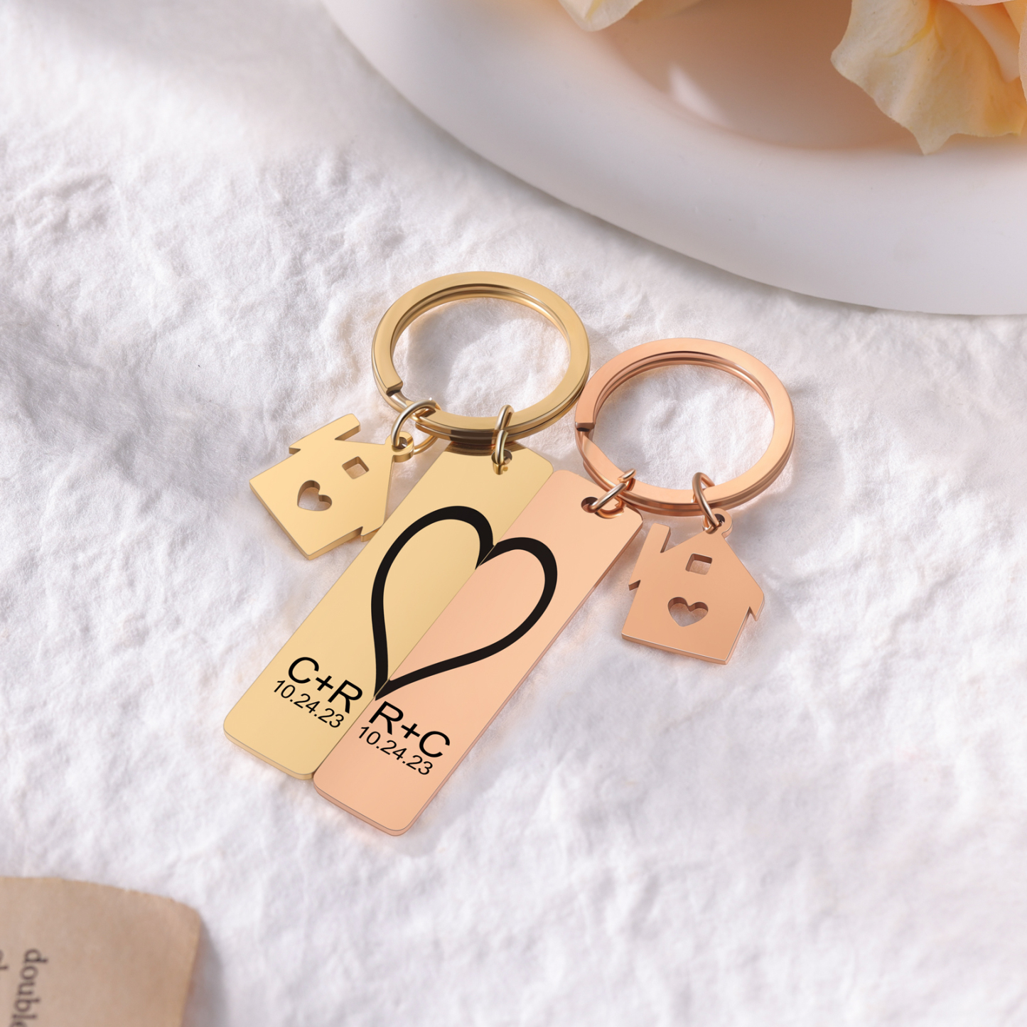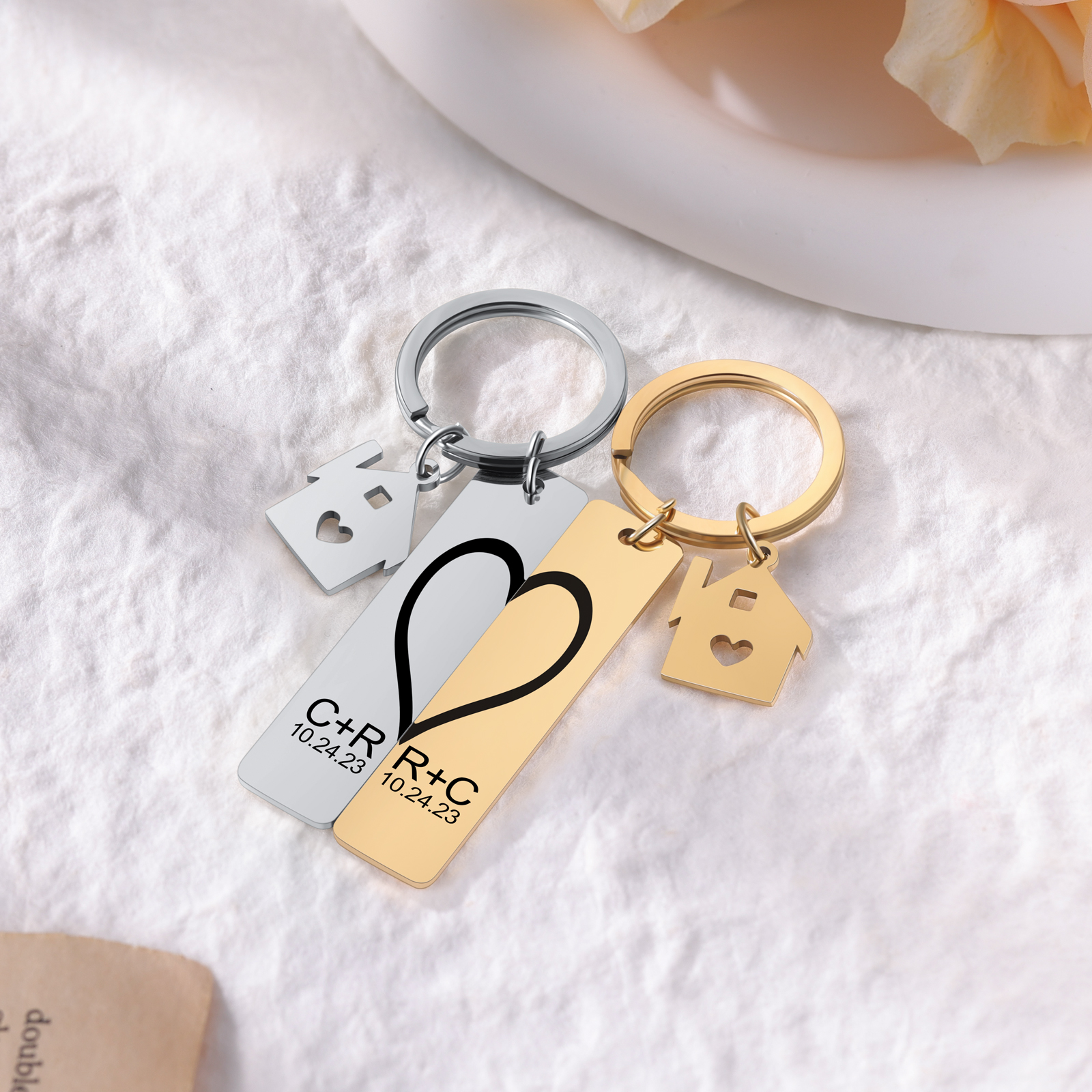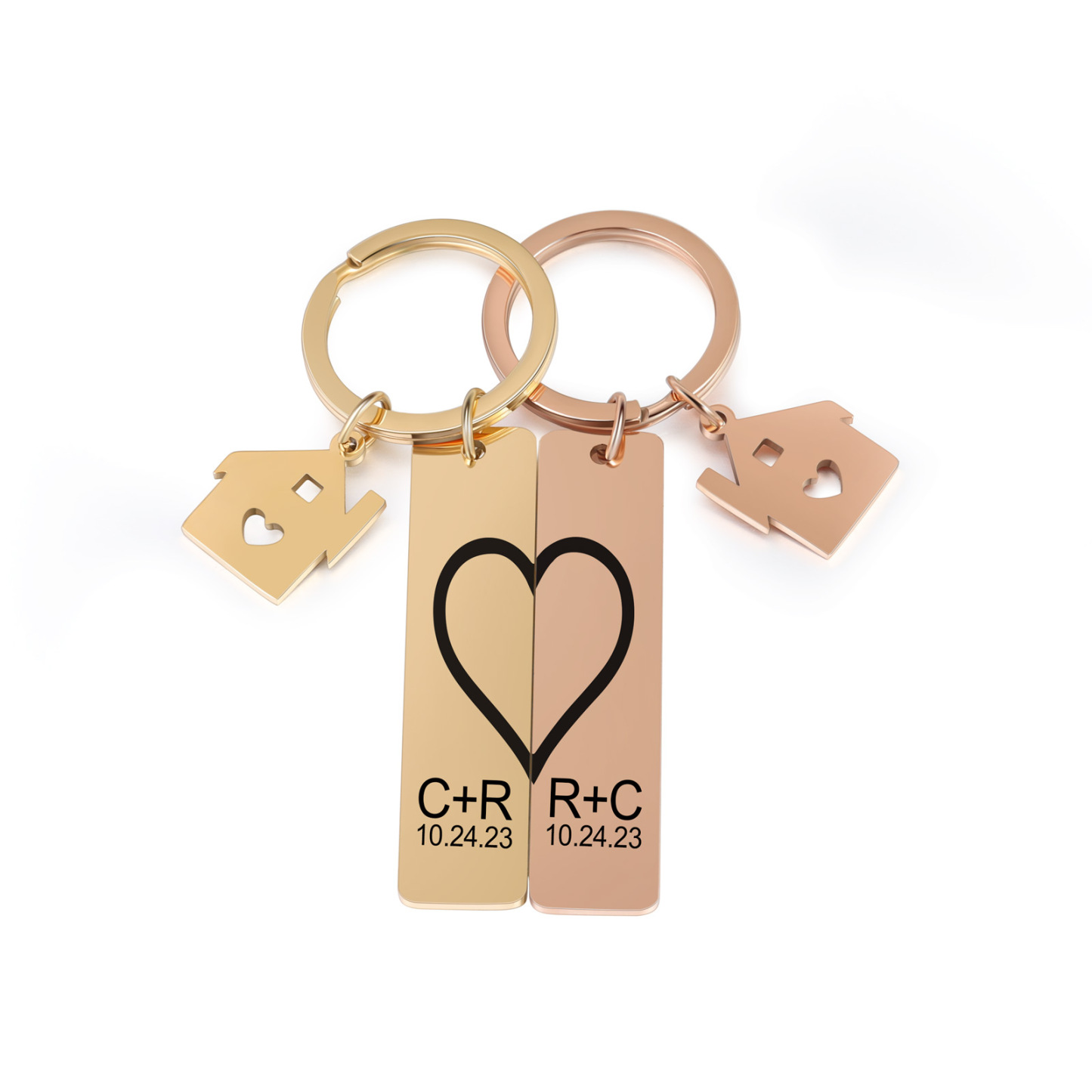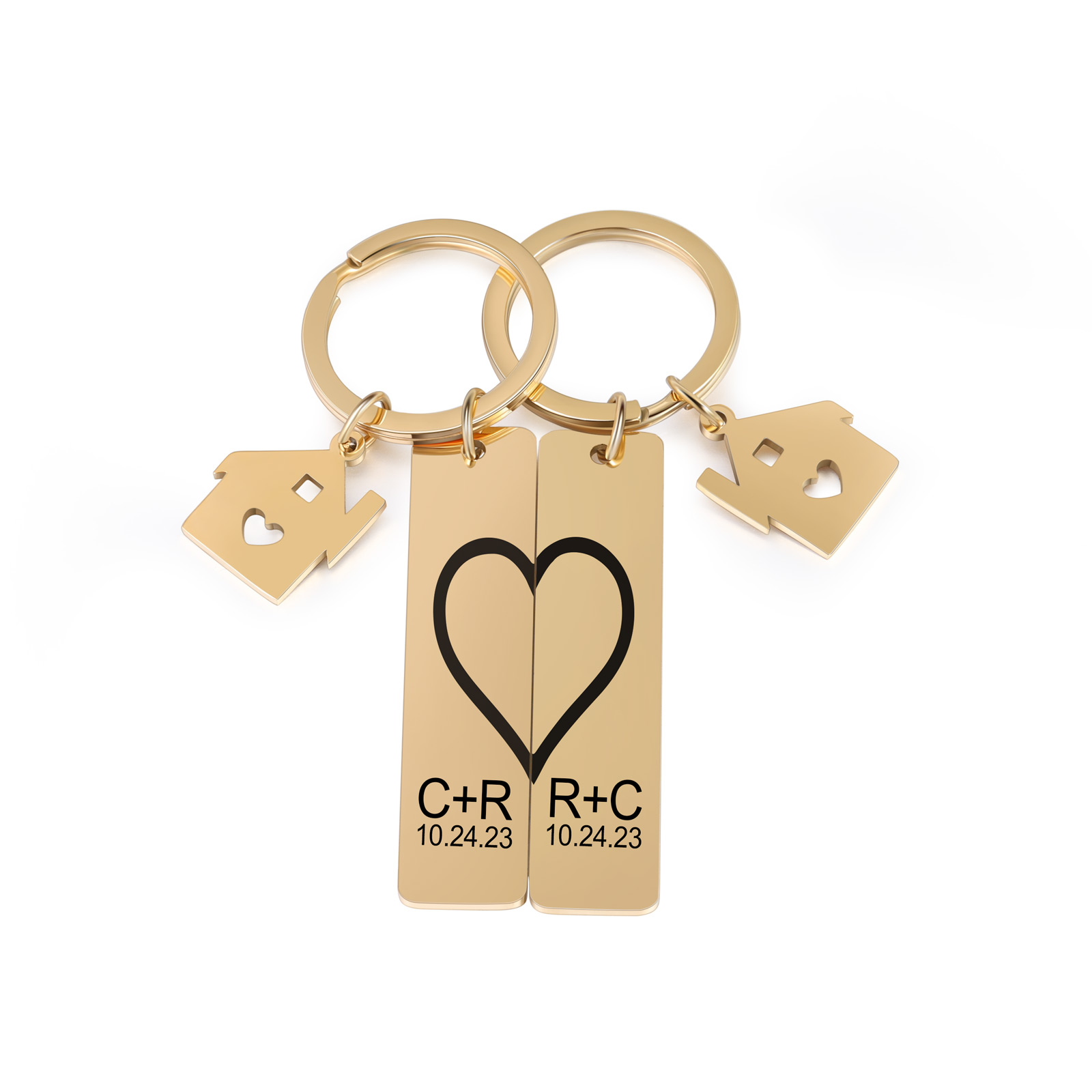 Personalisierbar 2 Buchstaben & 2 Datum- Herz und Herz Zuhause 🏠 Paar Metall-Schlüsselanhänger