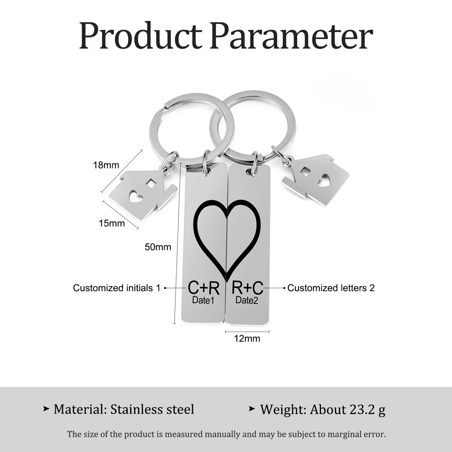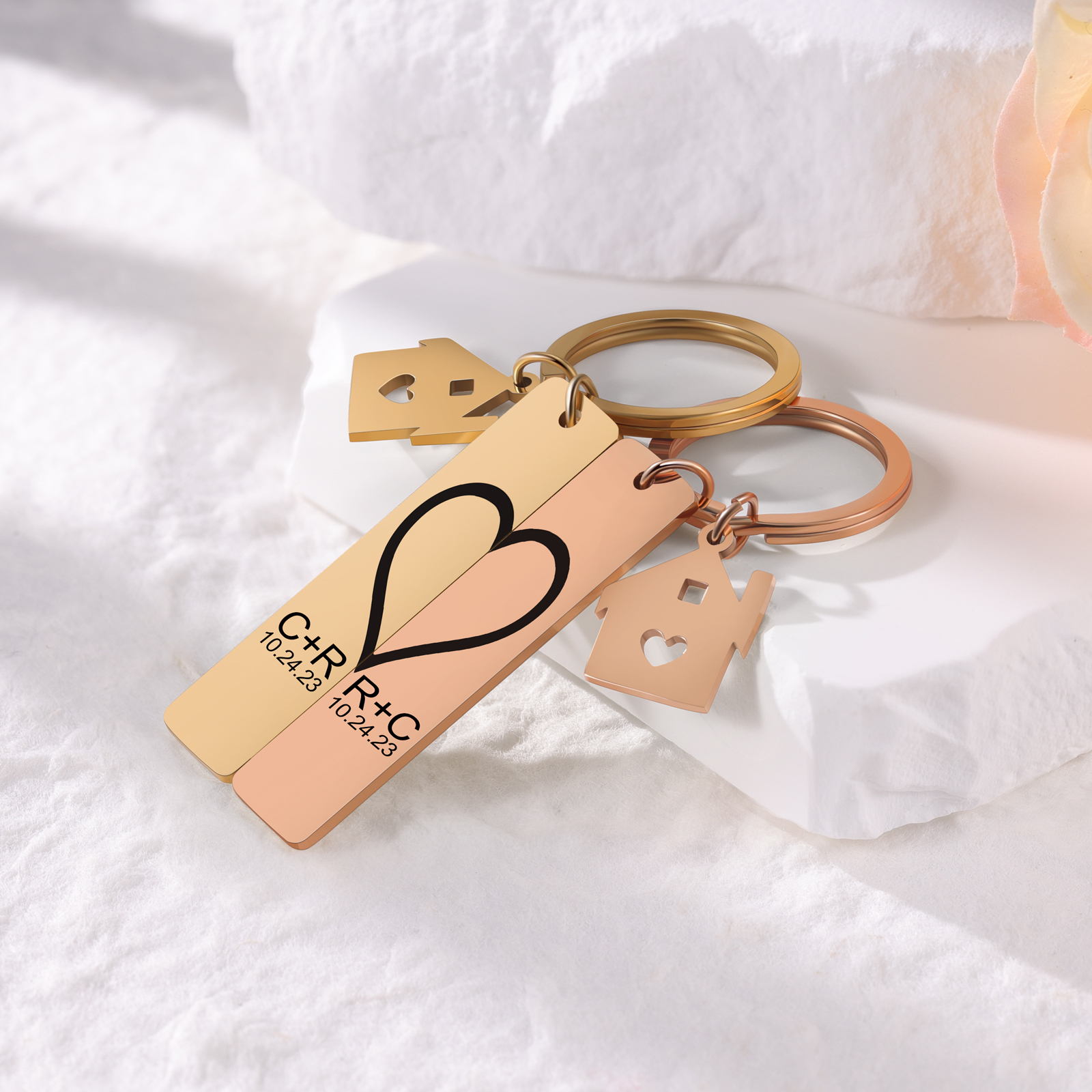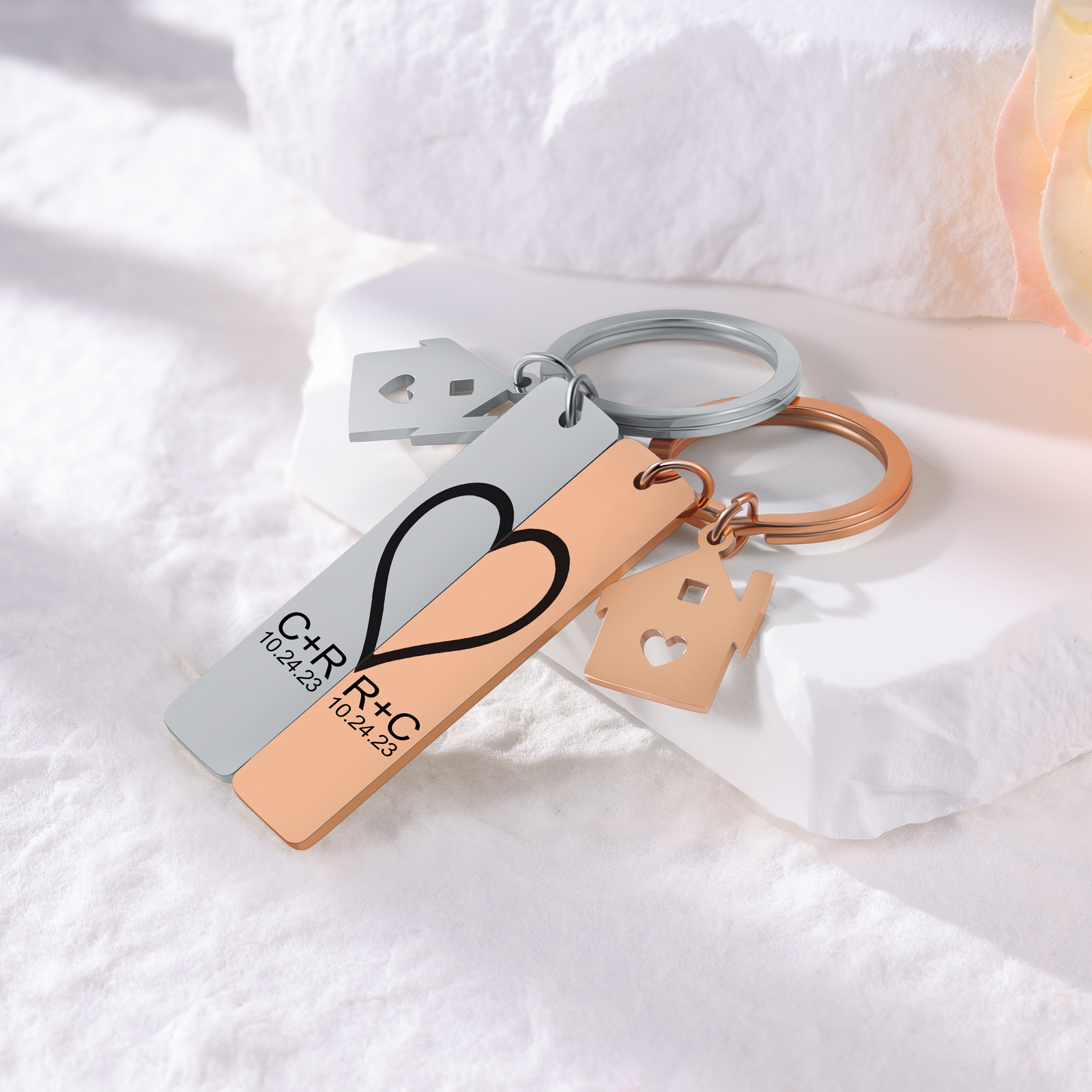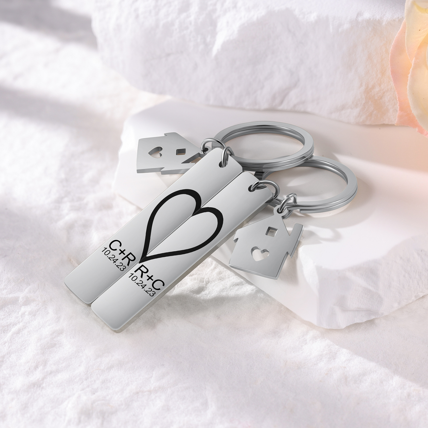 Personalisierbar 2 Buchstaben & 2 Datum- Herz und Herz Zuhause 🏠 Paar Metall-Schlüsselanhänger