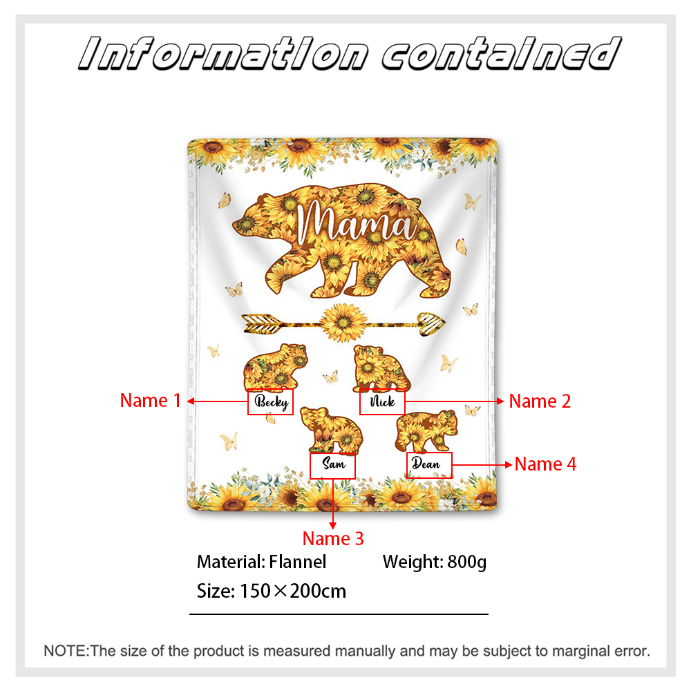 Personalisierbare 4 Namen Sonnenblume Mama Bär Decke - Geschenk für Mutter