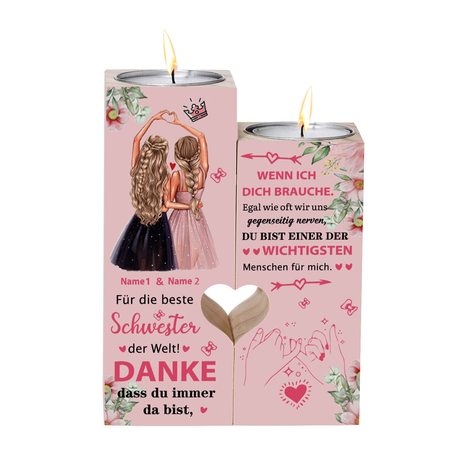 Es gibt viele Möglichkeiten, Ihre besonderen Gefühle für Ihre beste Schwester auszudrücken. Sie können diese Kerze anzünden und ihr sagen, wie besonders sie für Sie ist. Die Botschaft wird per Lasergravur in das Holz eingraviert, damit sie ewig hält. Ein perfektes Andenken, das sie lieben wird.