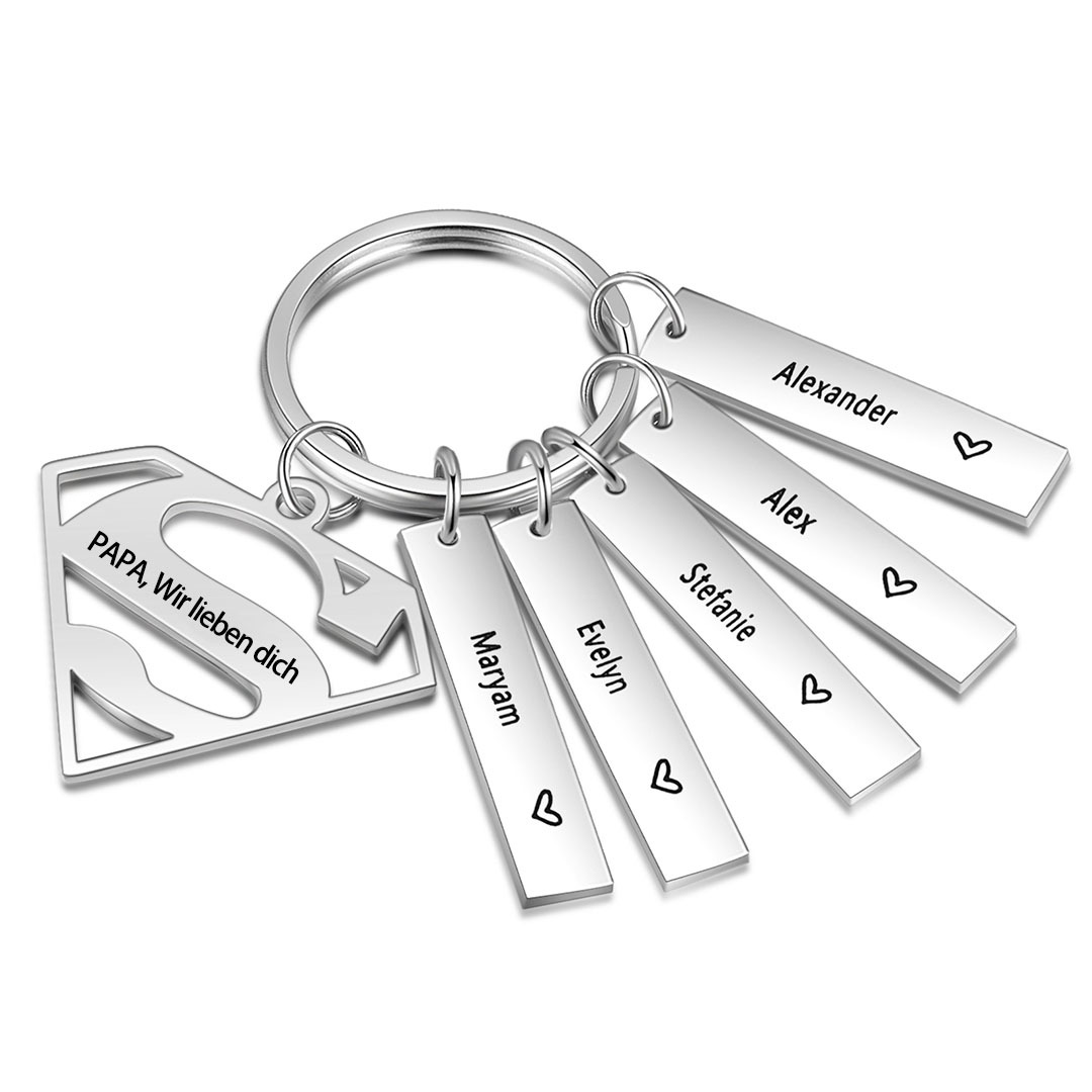 Personalisierbarer 5 Namen & 1 Text Supermann Schlüsselanhänger-Geschenk für Vater