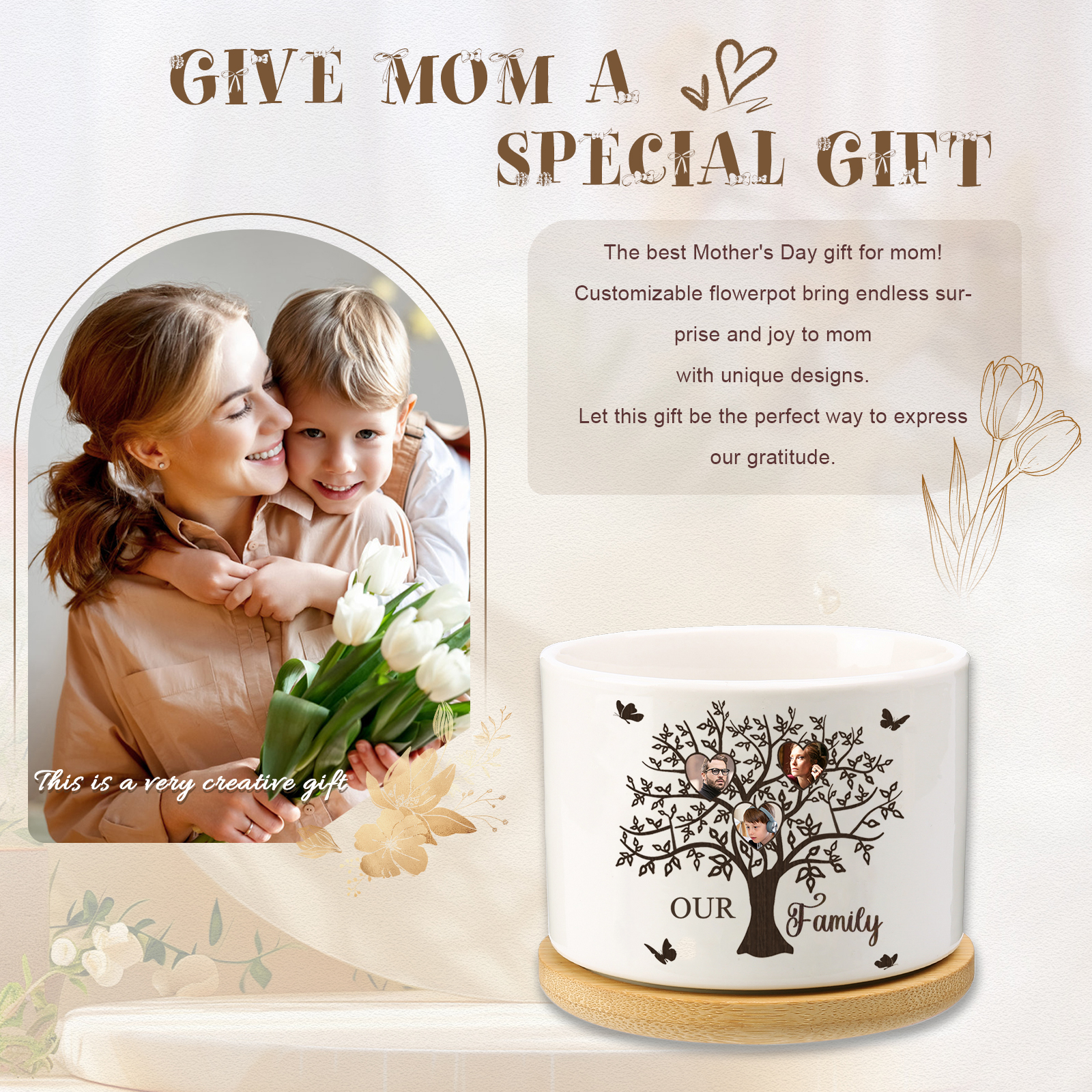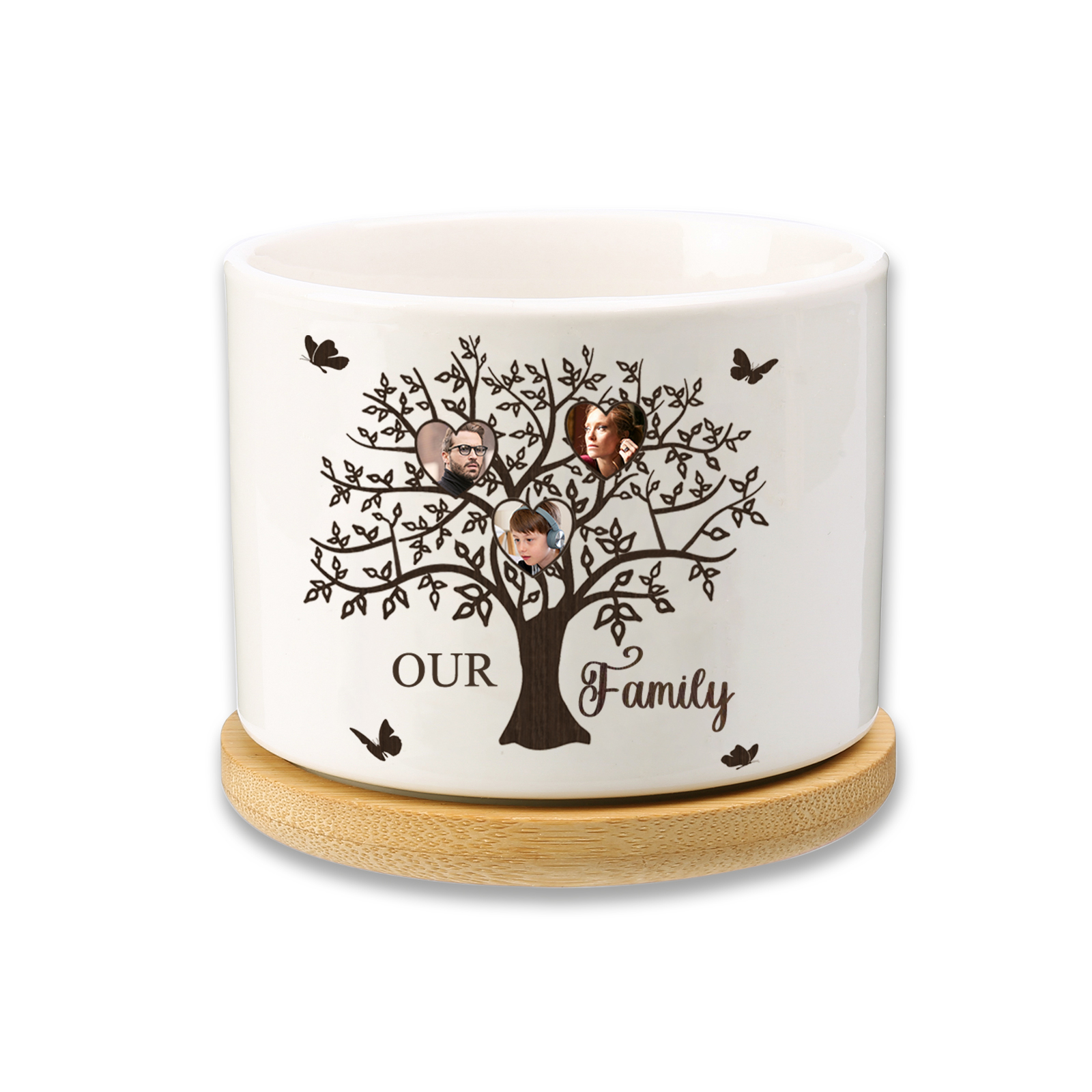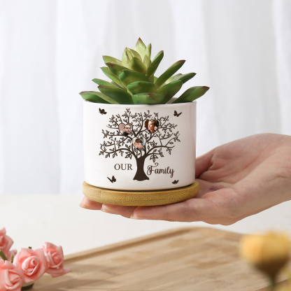 Personalisierbarer Text & 3 Fotos Familienbaum Familie Blumentopf