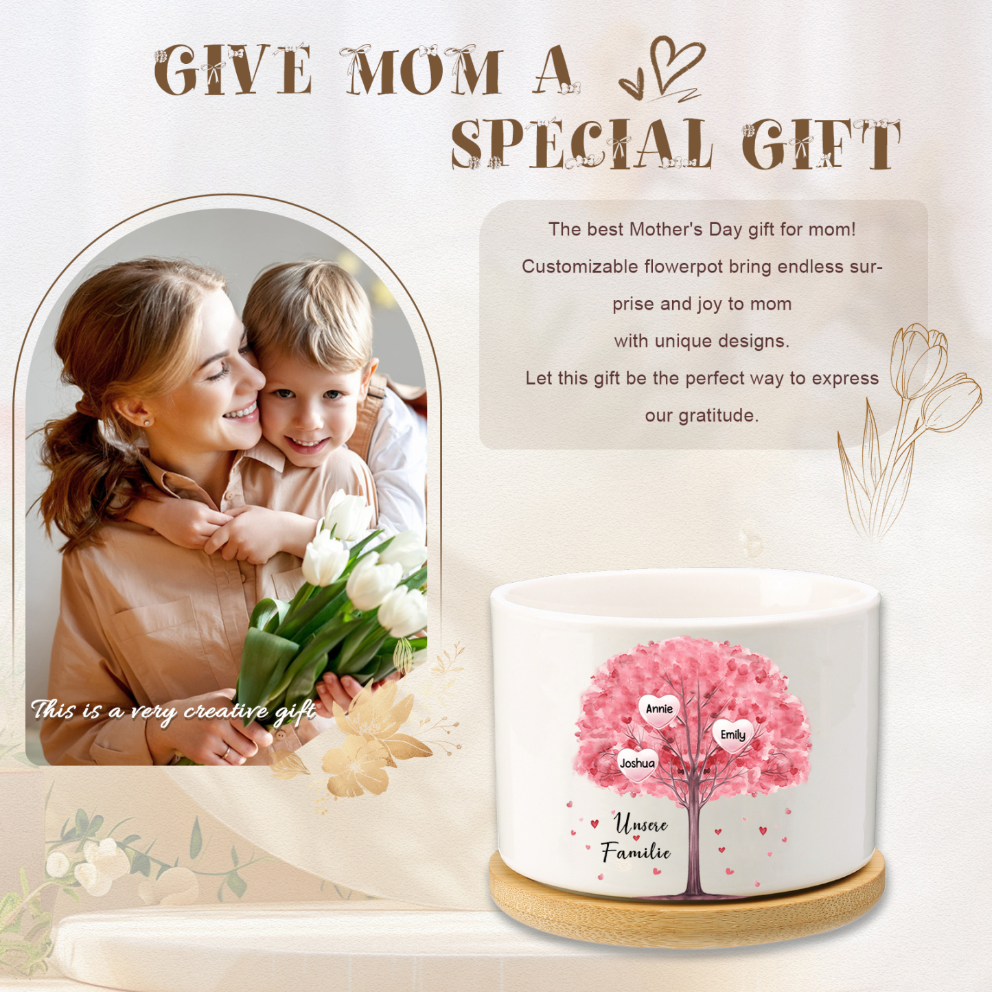 Personalisierbarer Text & 3 Namen Rosa Familienbaum Familie Blumentopf