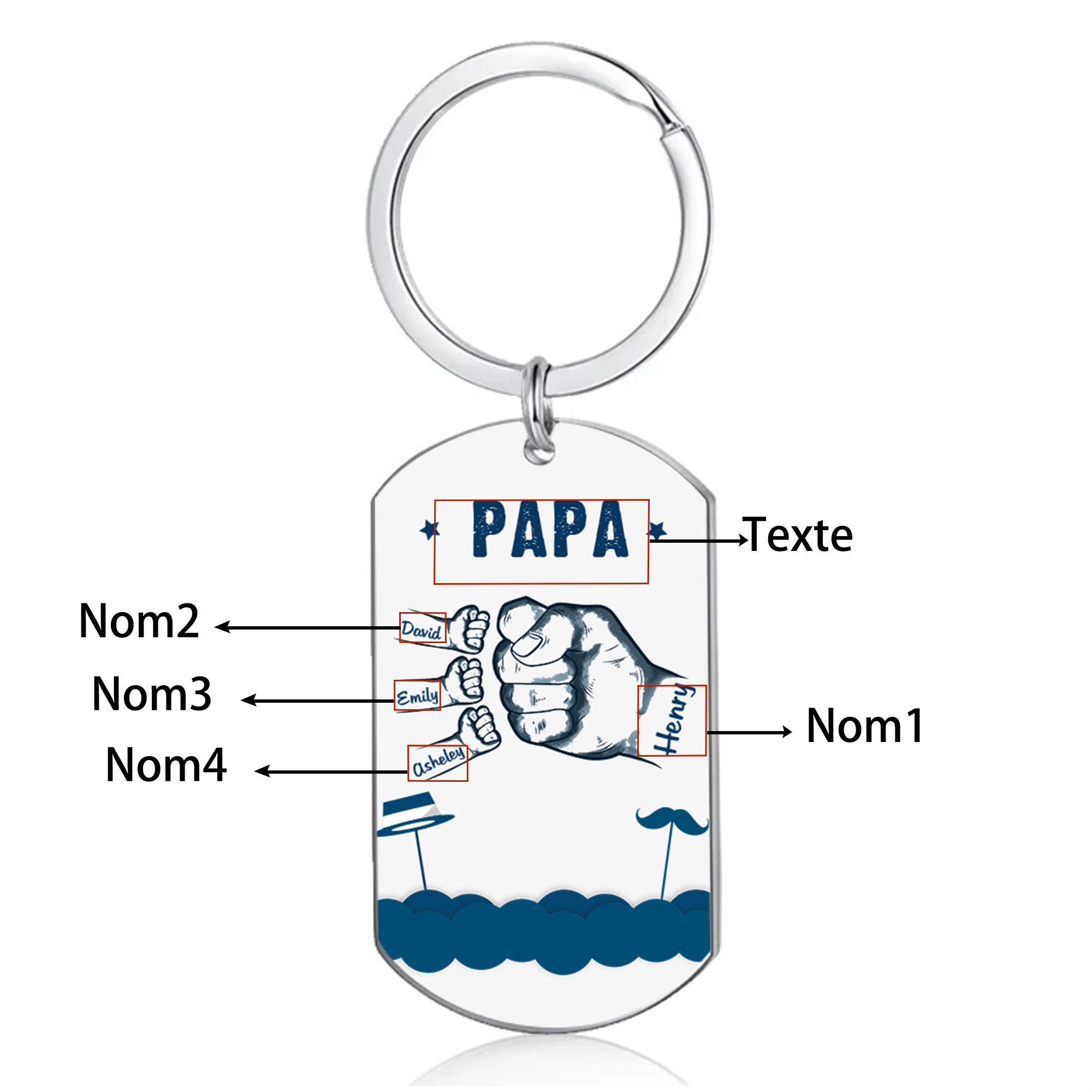 Personalisierbarer Text & 4 Namen Blau Fauststoß Metall Schlüsselanhänger-Geschenk für Vater/Großvater