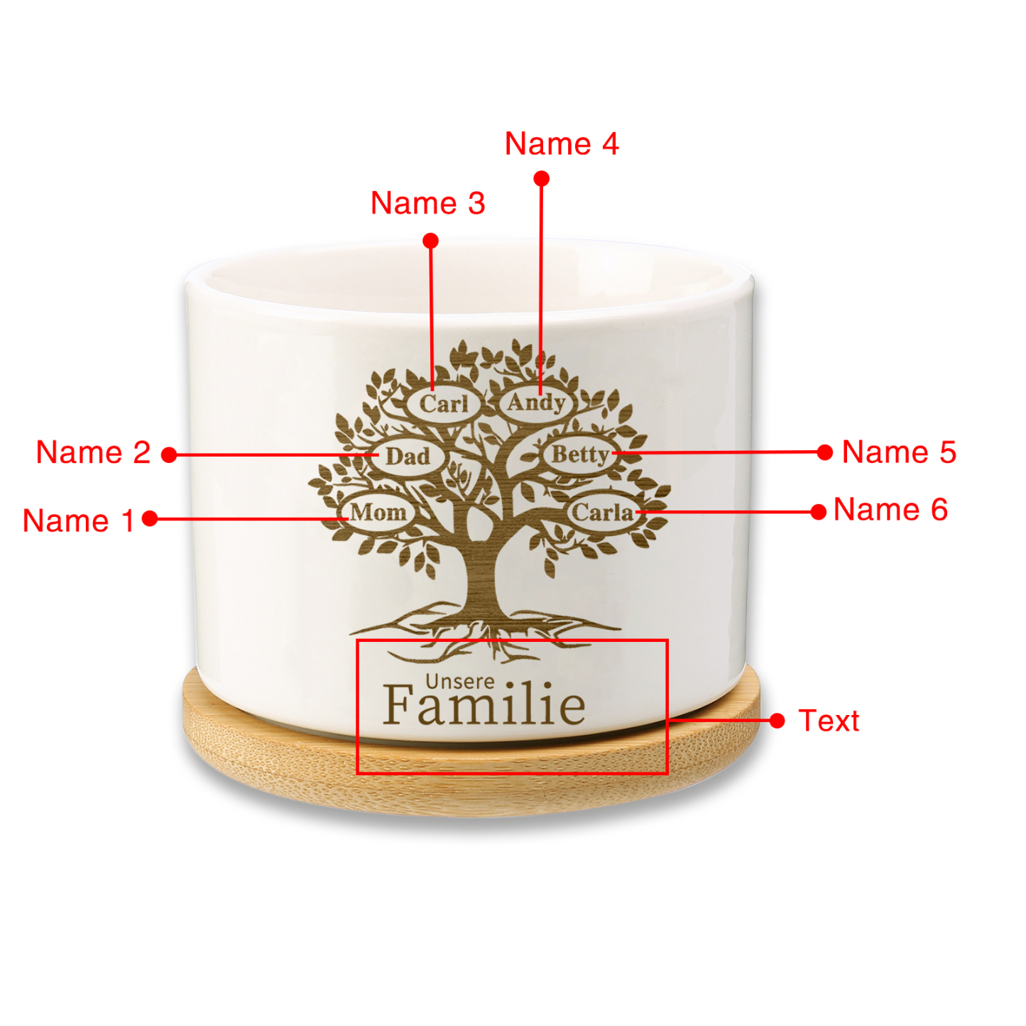 Personalisierbarer Text & 6 Namen Familienbaum Familie Blumentopf