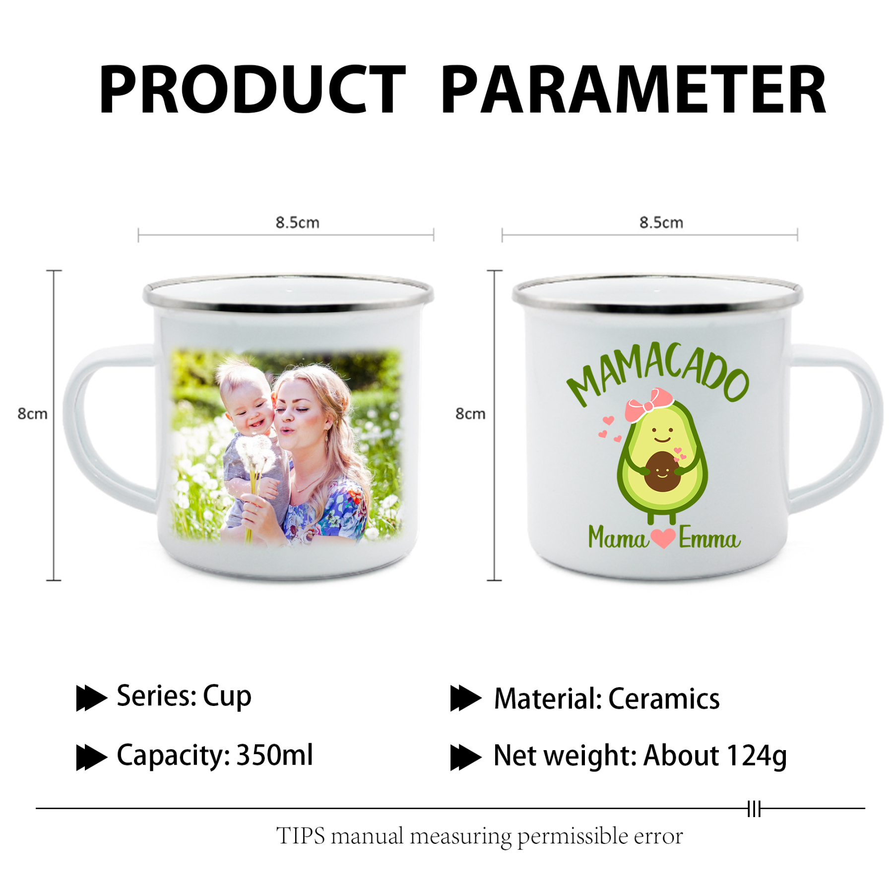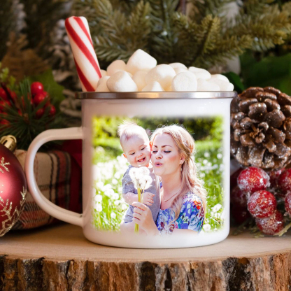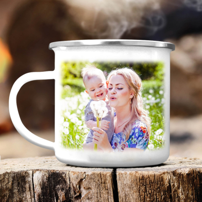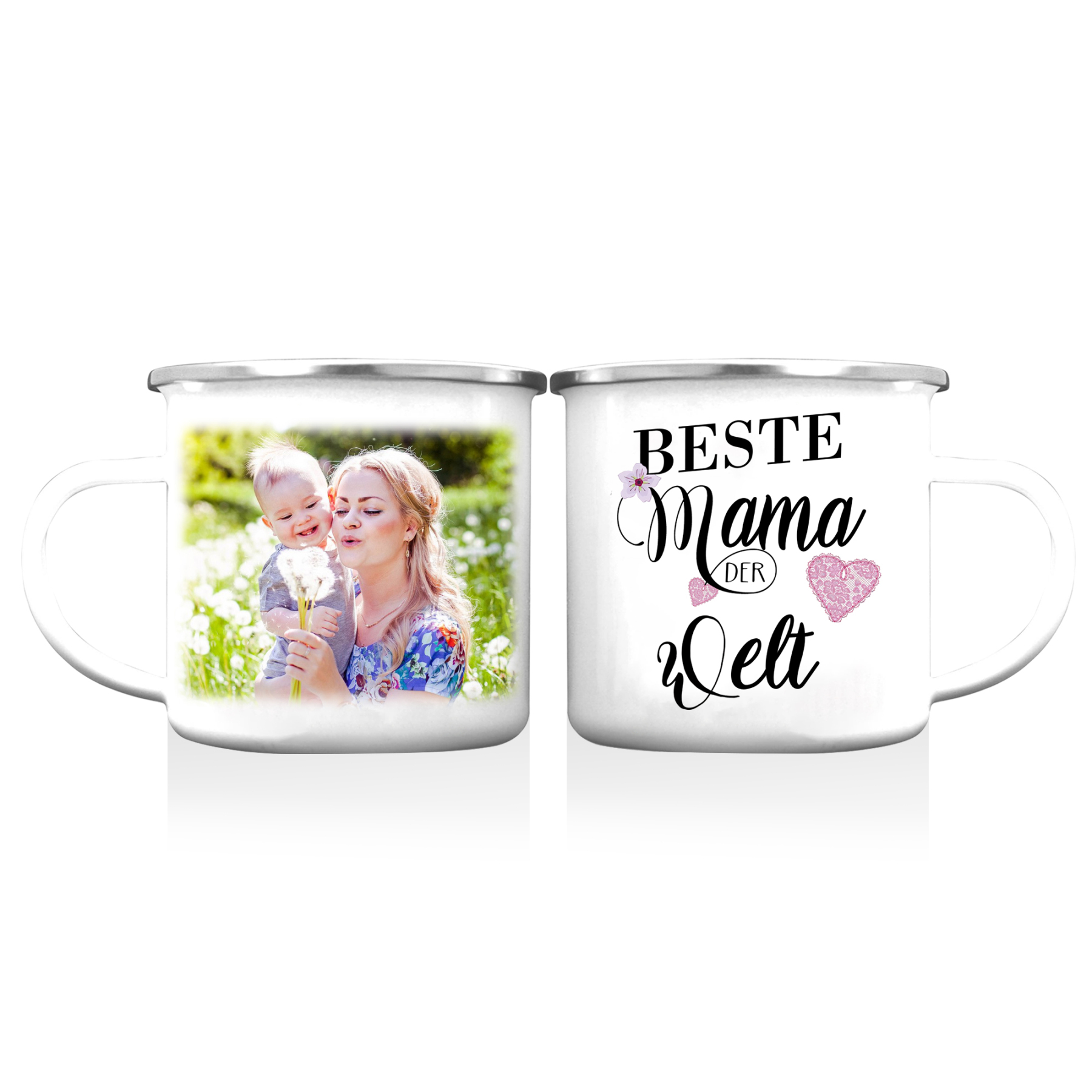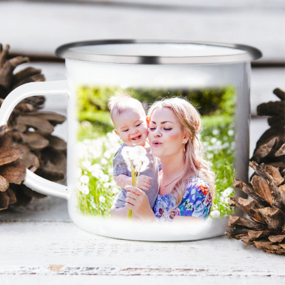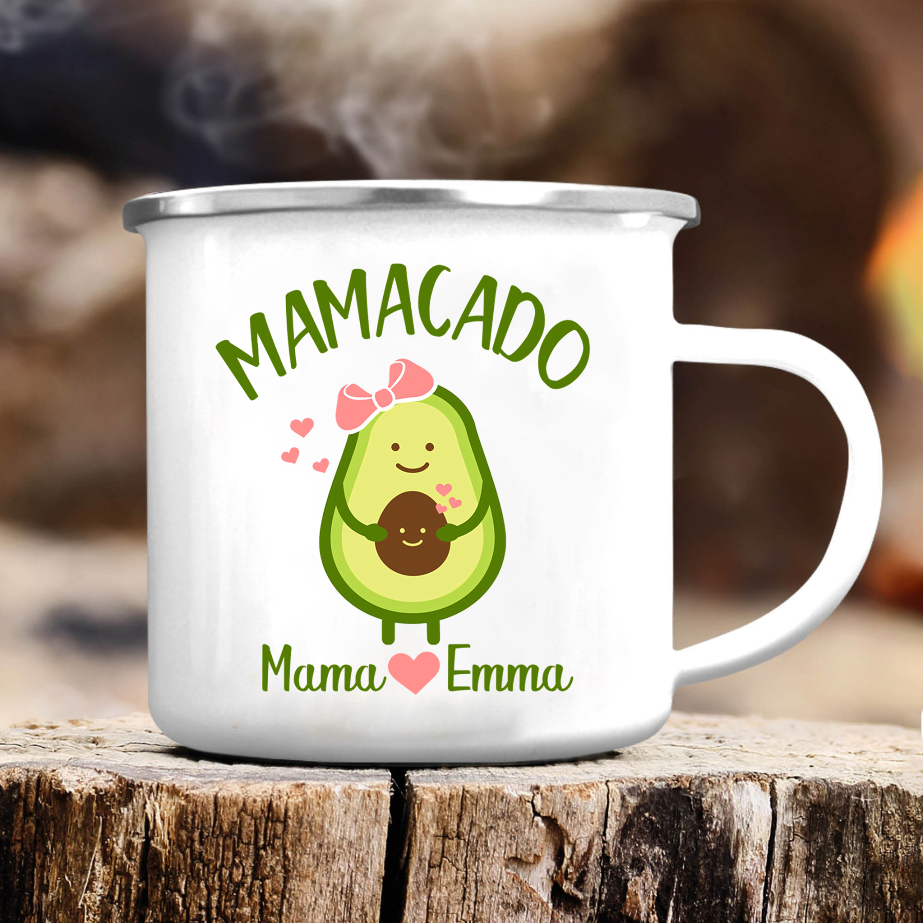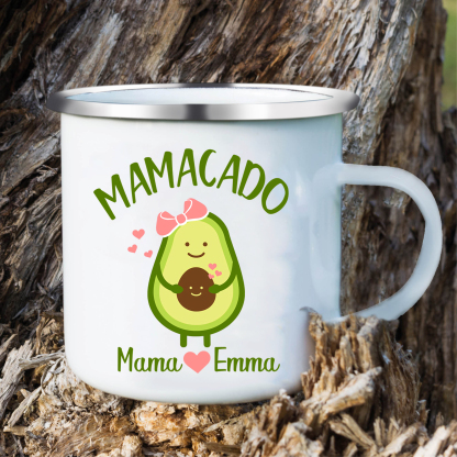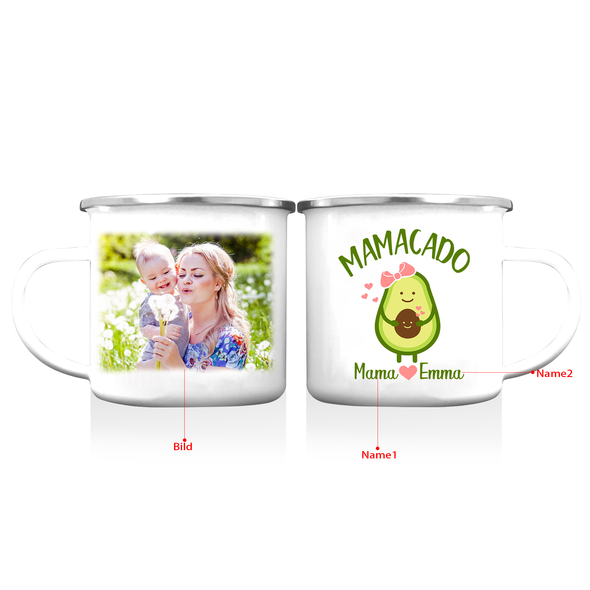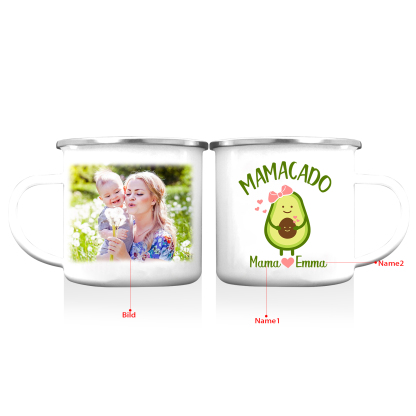 Personalisierbares Foto & 2 Namen Emaille Tasse Mamacado Emaille Becher für Mutter