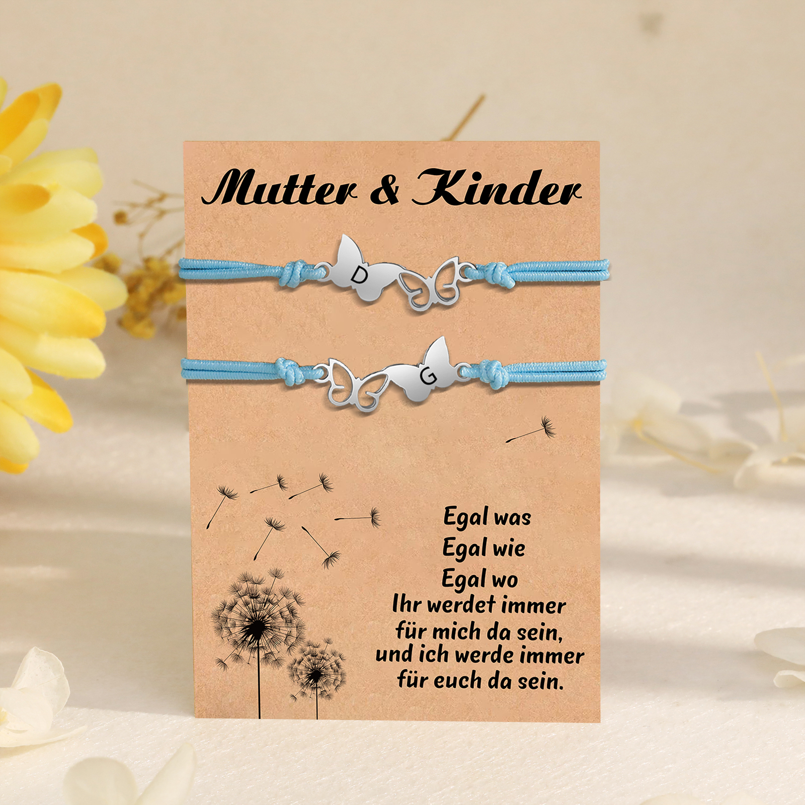 Personalisierte 2 Buchstaben Schmetterling Armbänder Set mit 2 Ketten Gummiband - Schulanfang Geschenk mit Karte