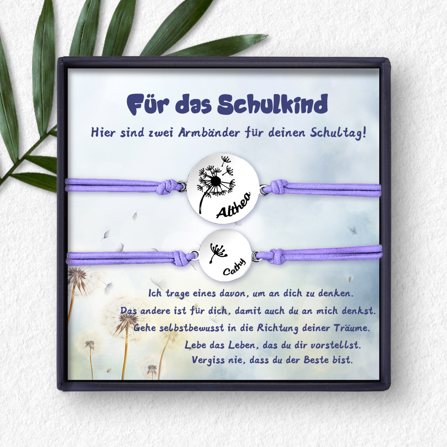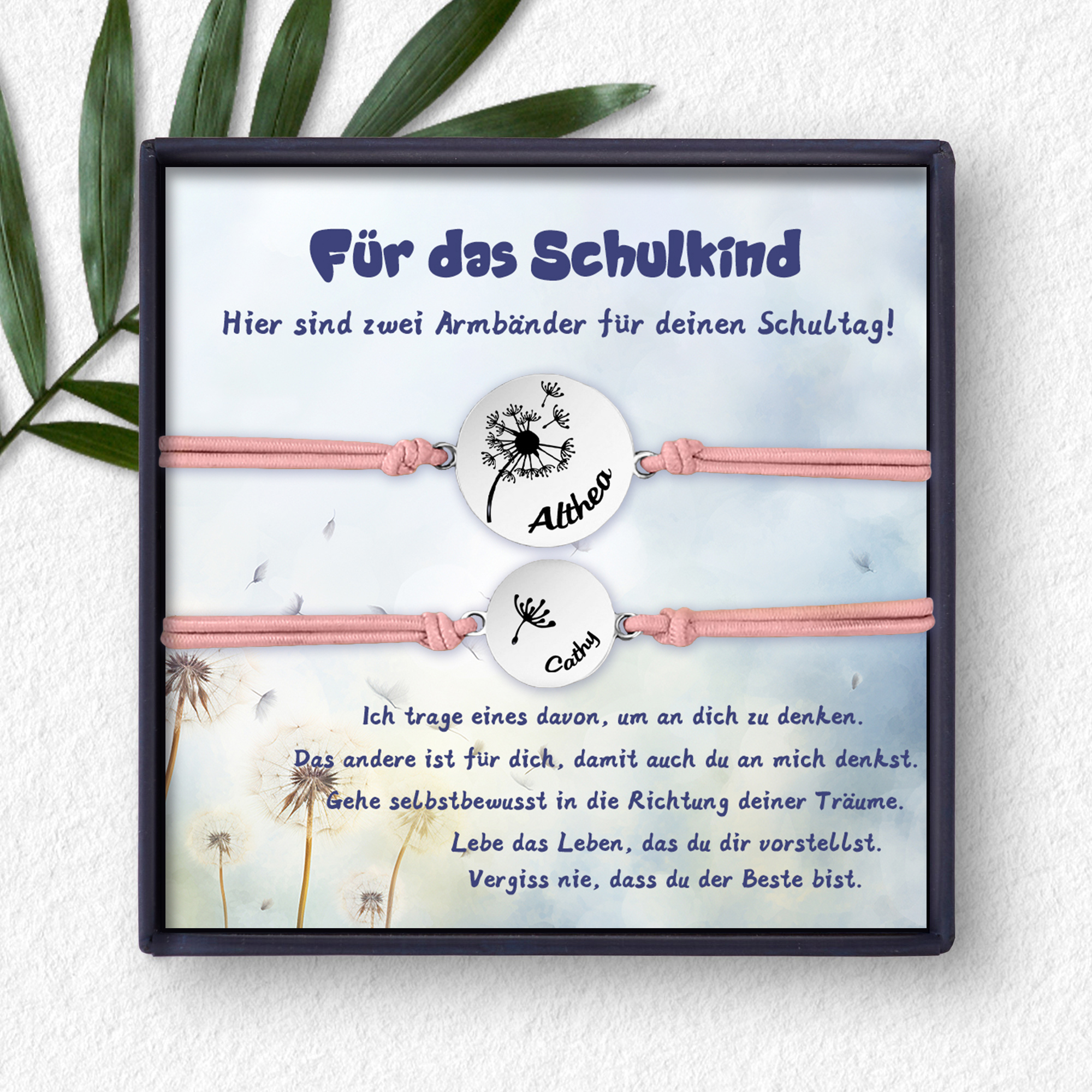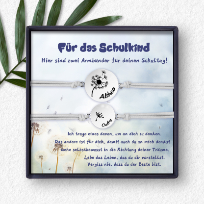 Personalisierte 2 Namen Löwenzahn Armbänder Set mit 2 Ketten Gummiband -Für das Schulkind Gehe selbstbewusst in die Richtung deiner Träume- Schulanfang Geschenk