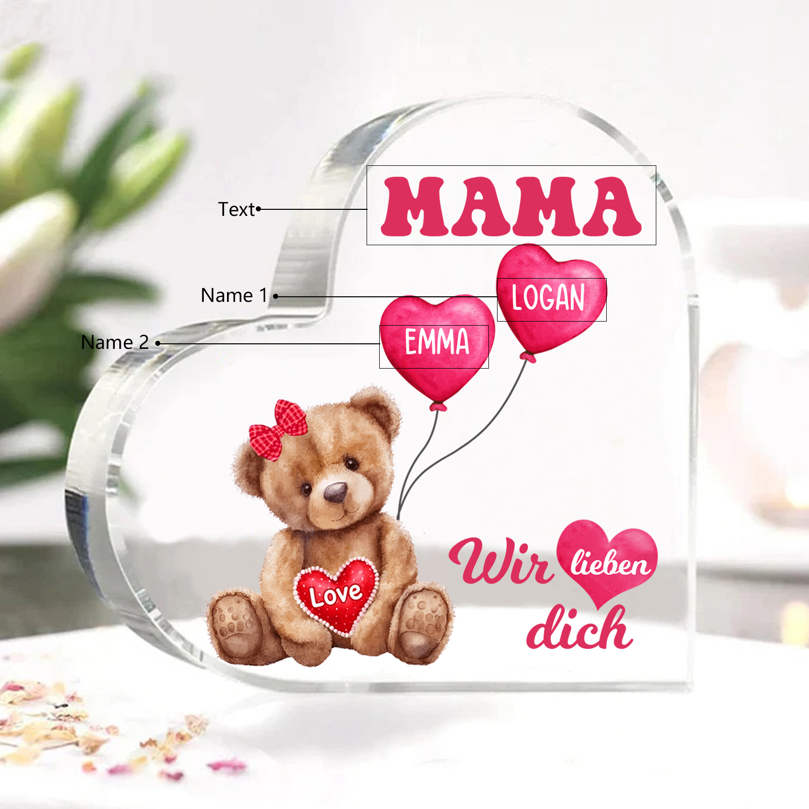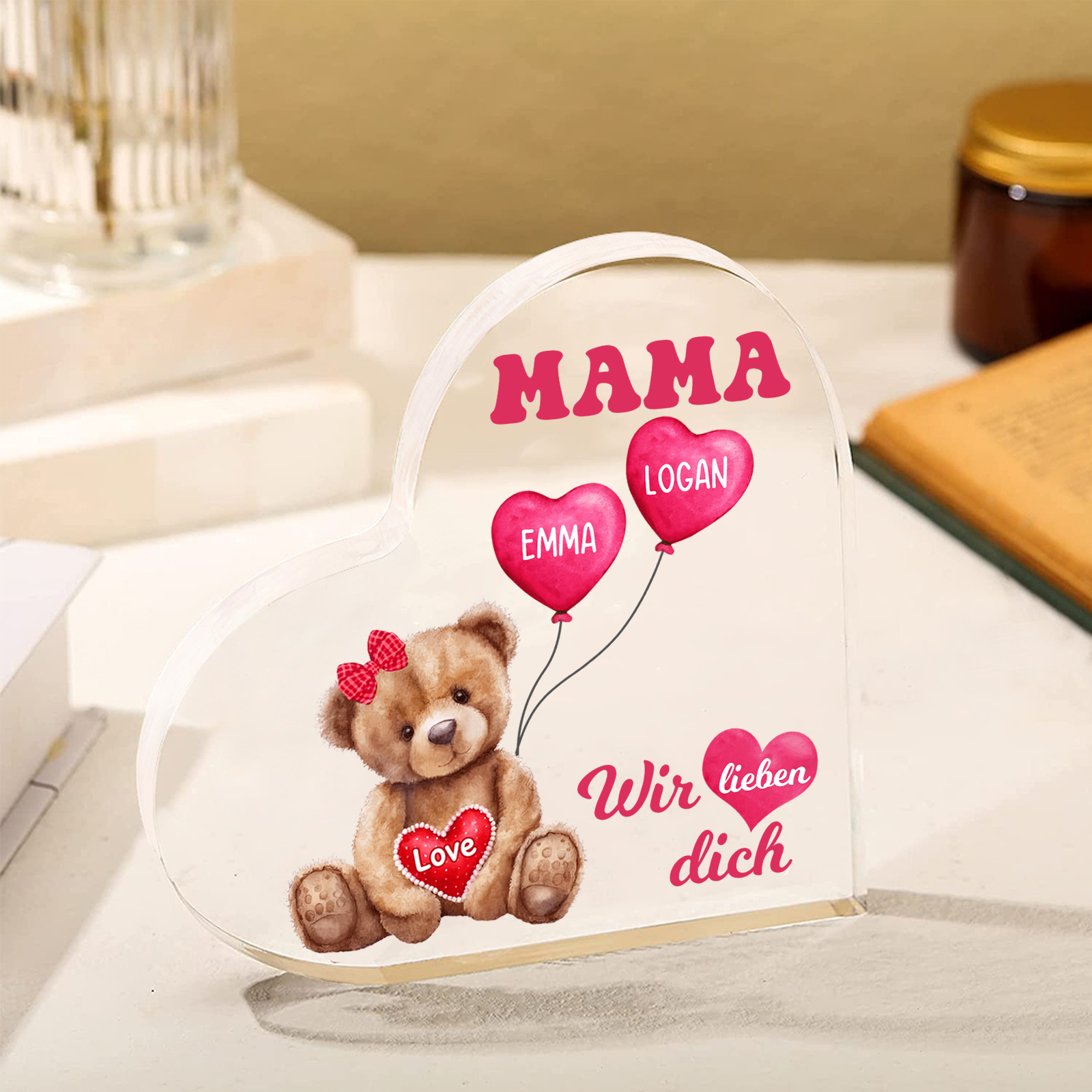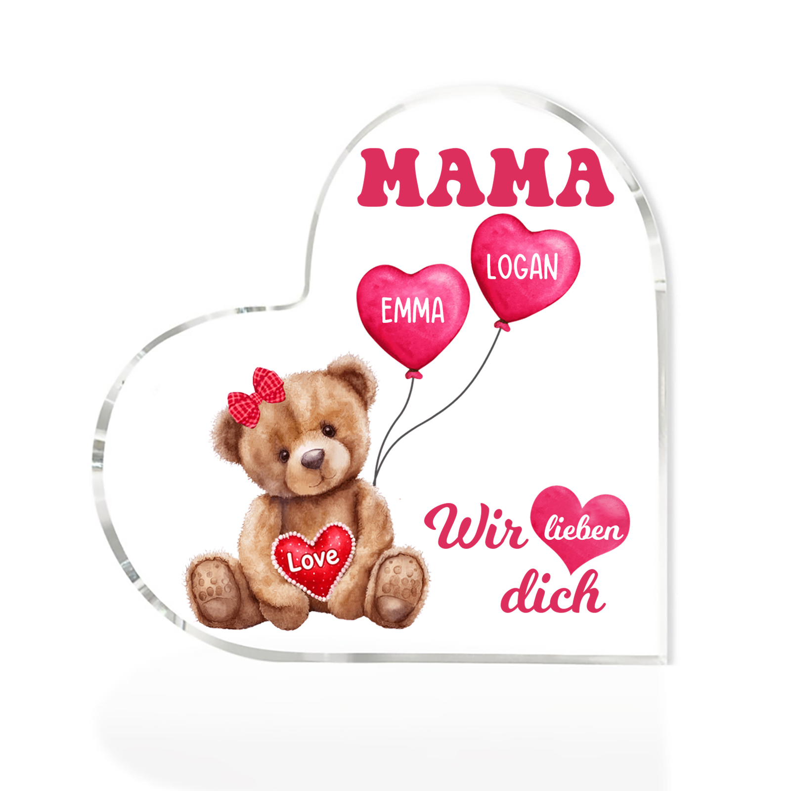 Personalisierte 2 Namen & Text Herz Acryl-Deko Teddybär & Herzballon -Wir lieben dich- Familie Schreibtischdekoration