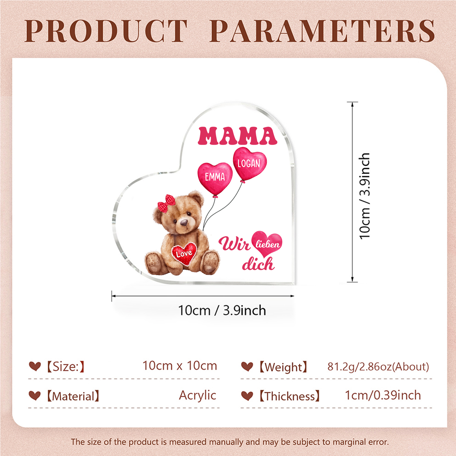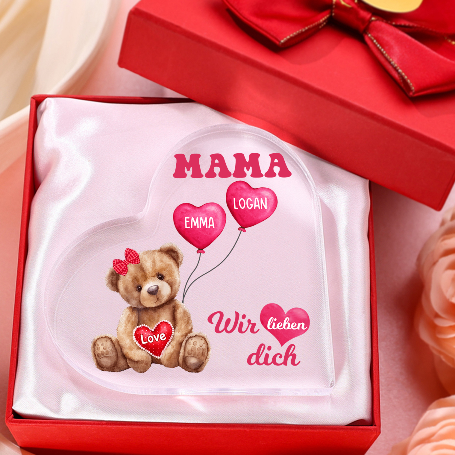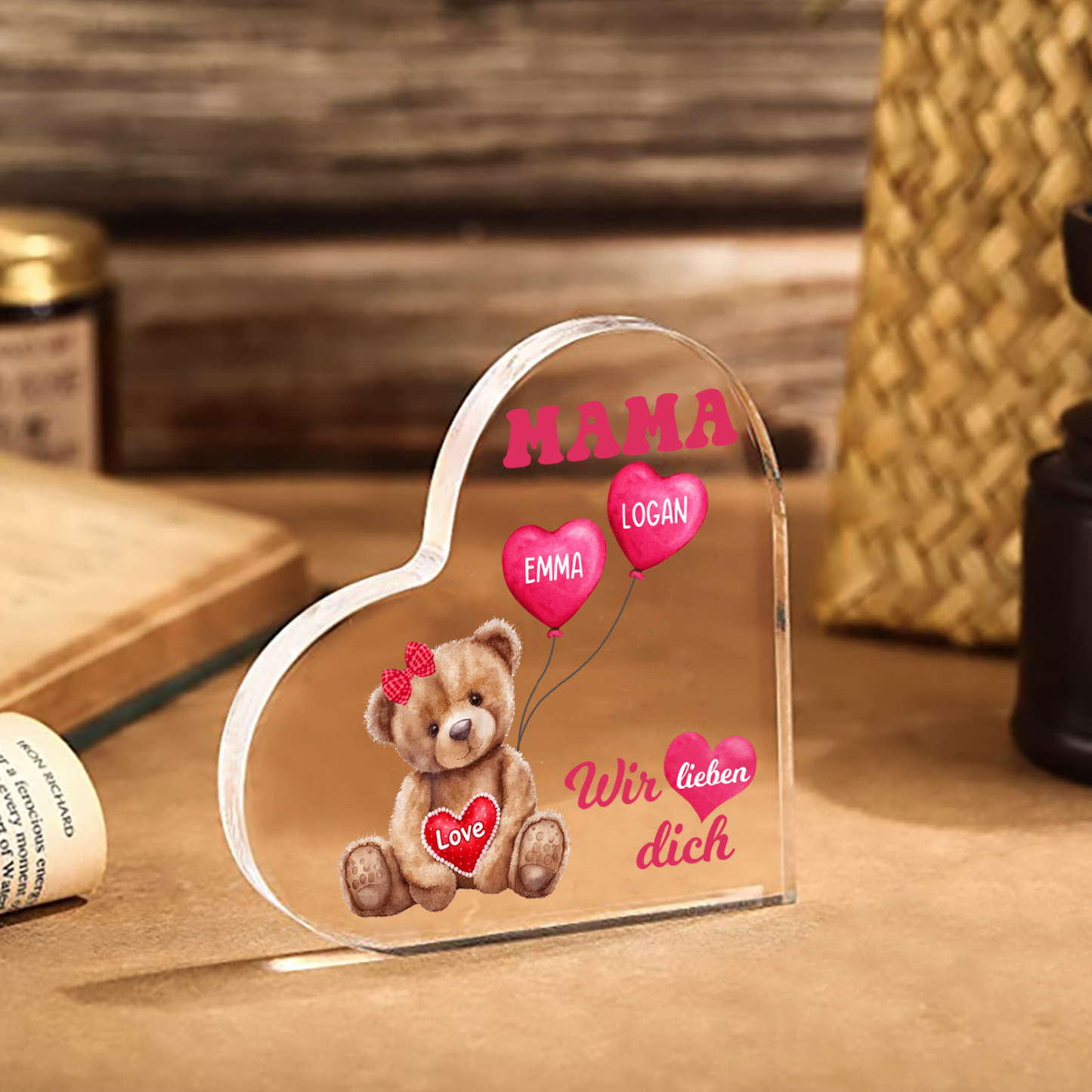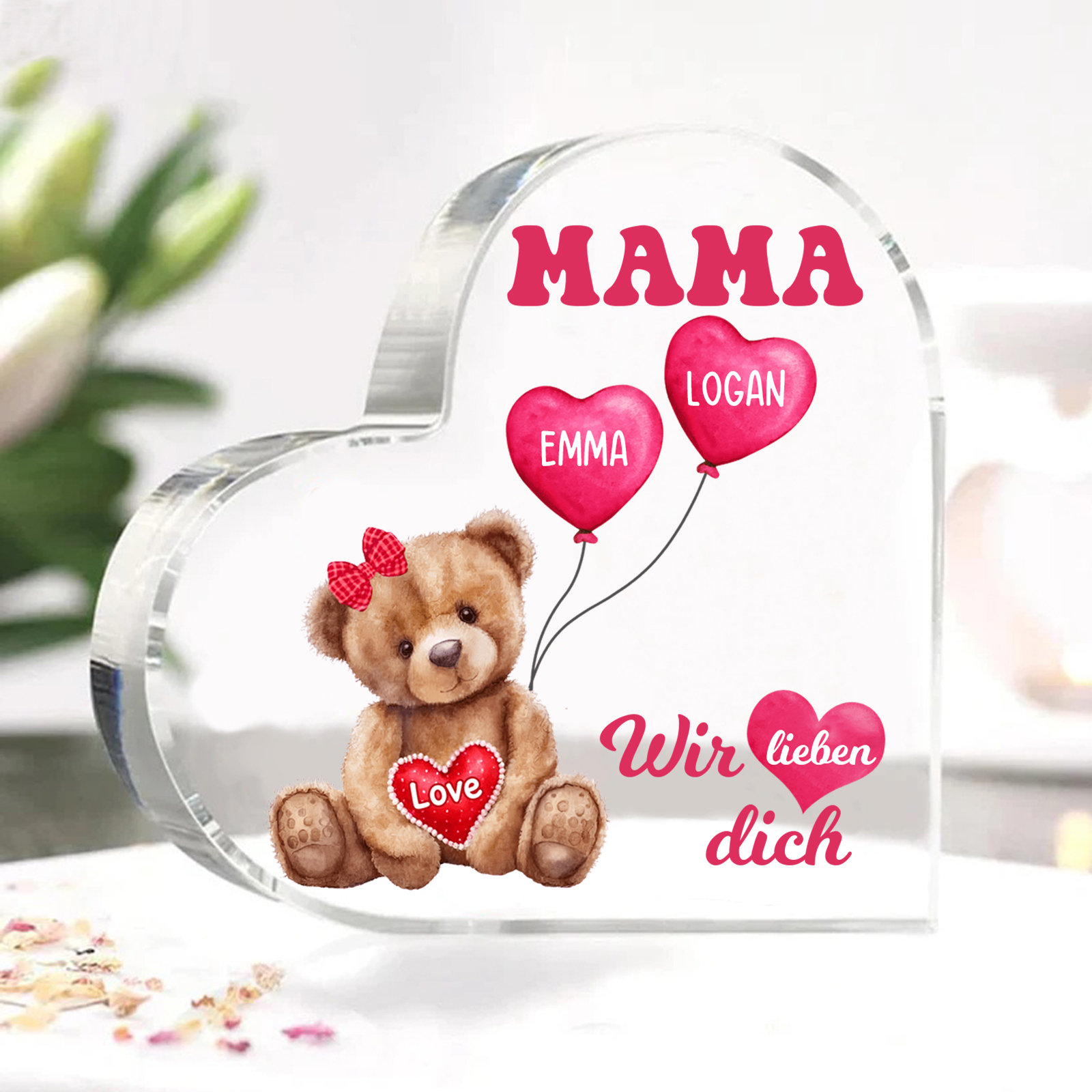 Personalisierte 2 Namen & Text Herz Acryl-Deko Teddybär & Herzballon -Wir lieben dich- Familie Schreibtischdekoration