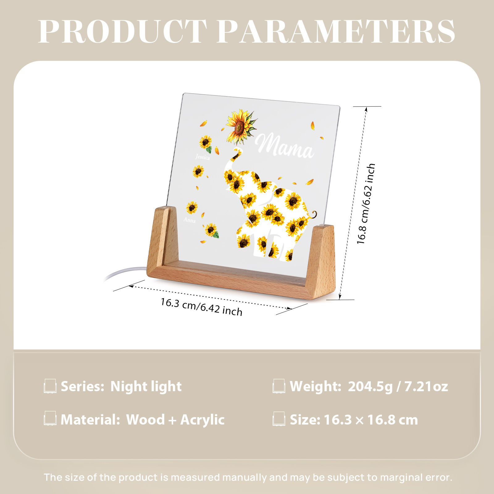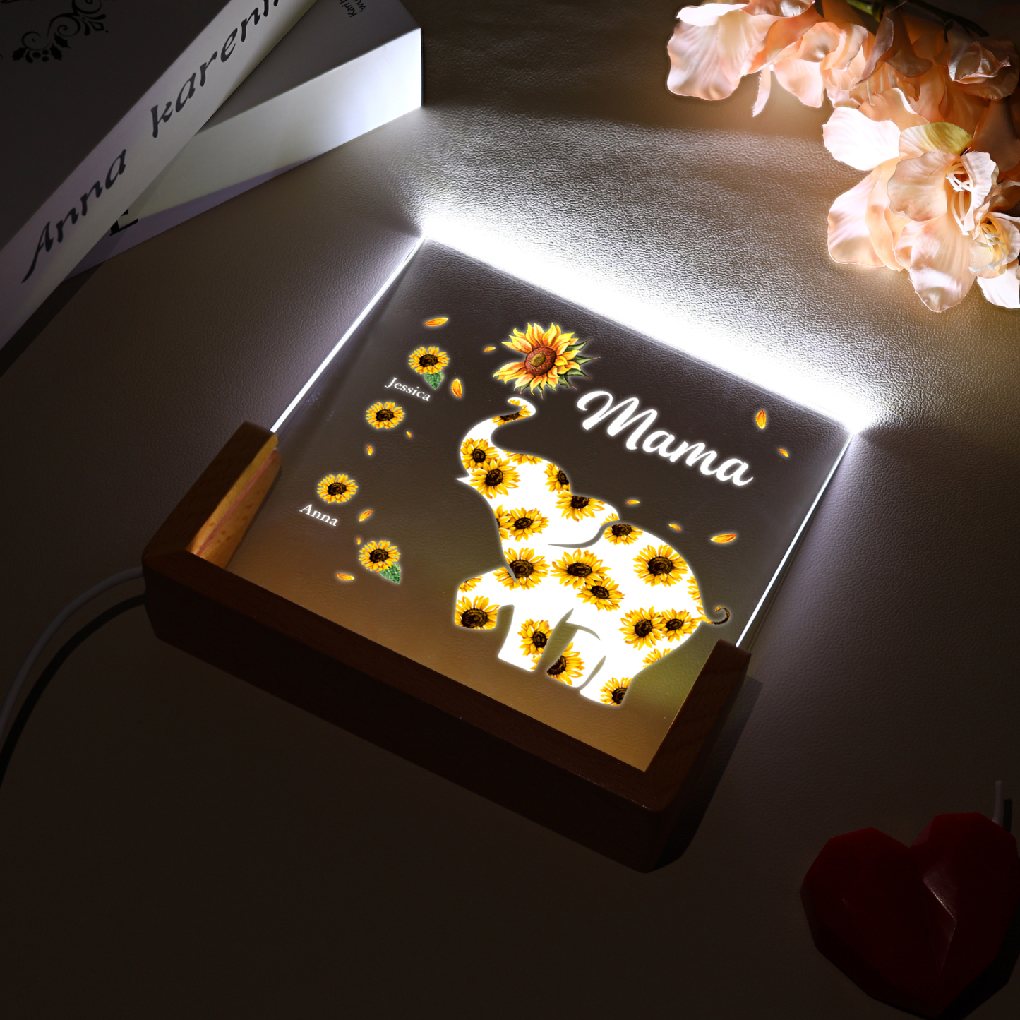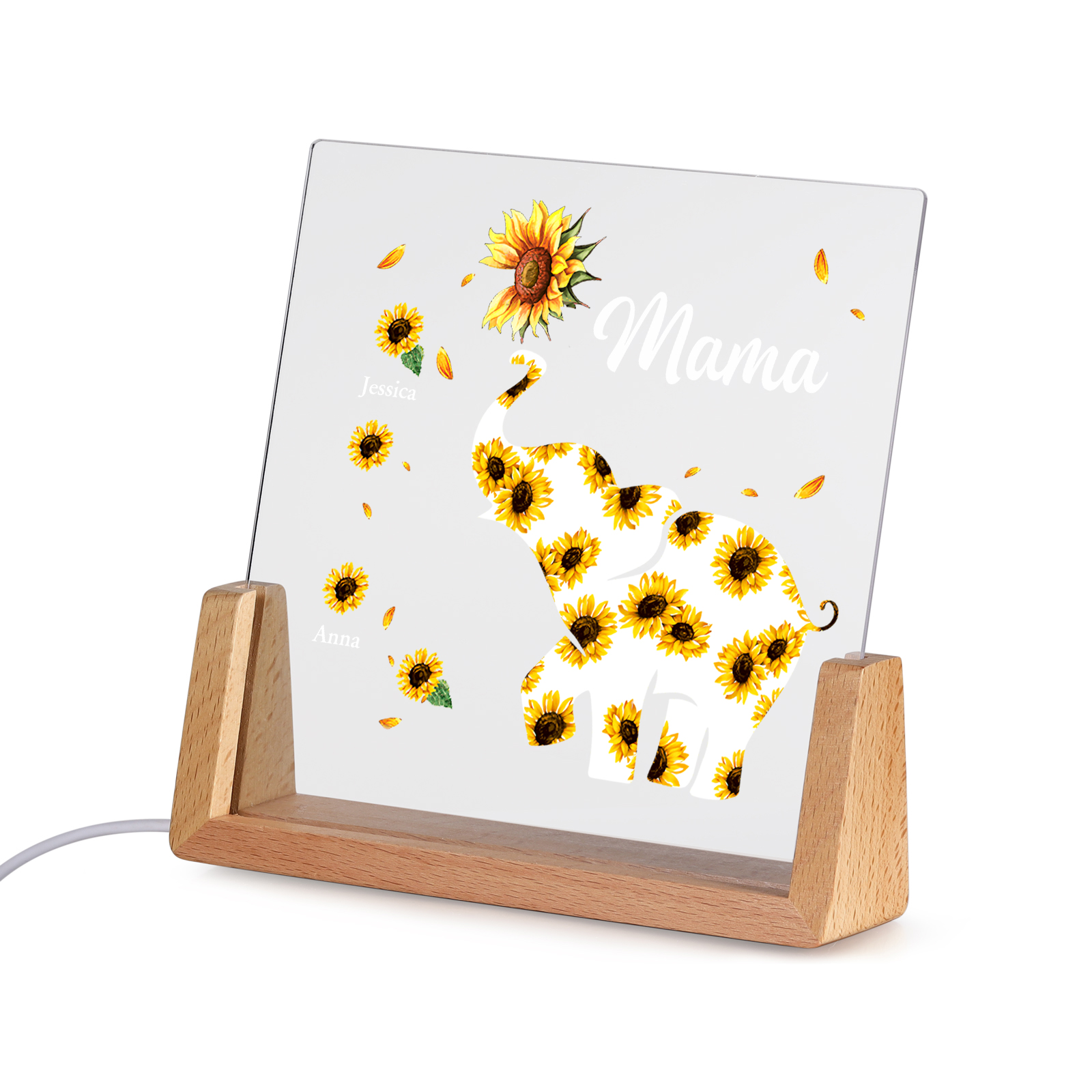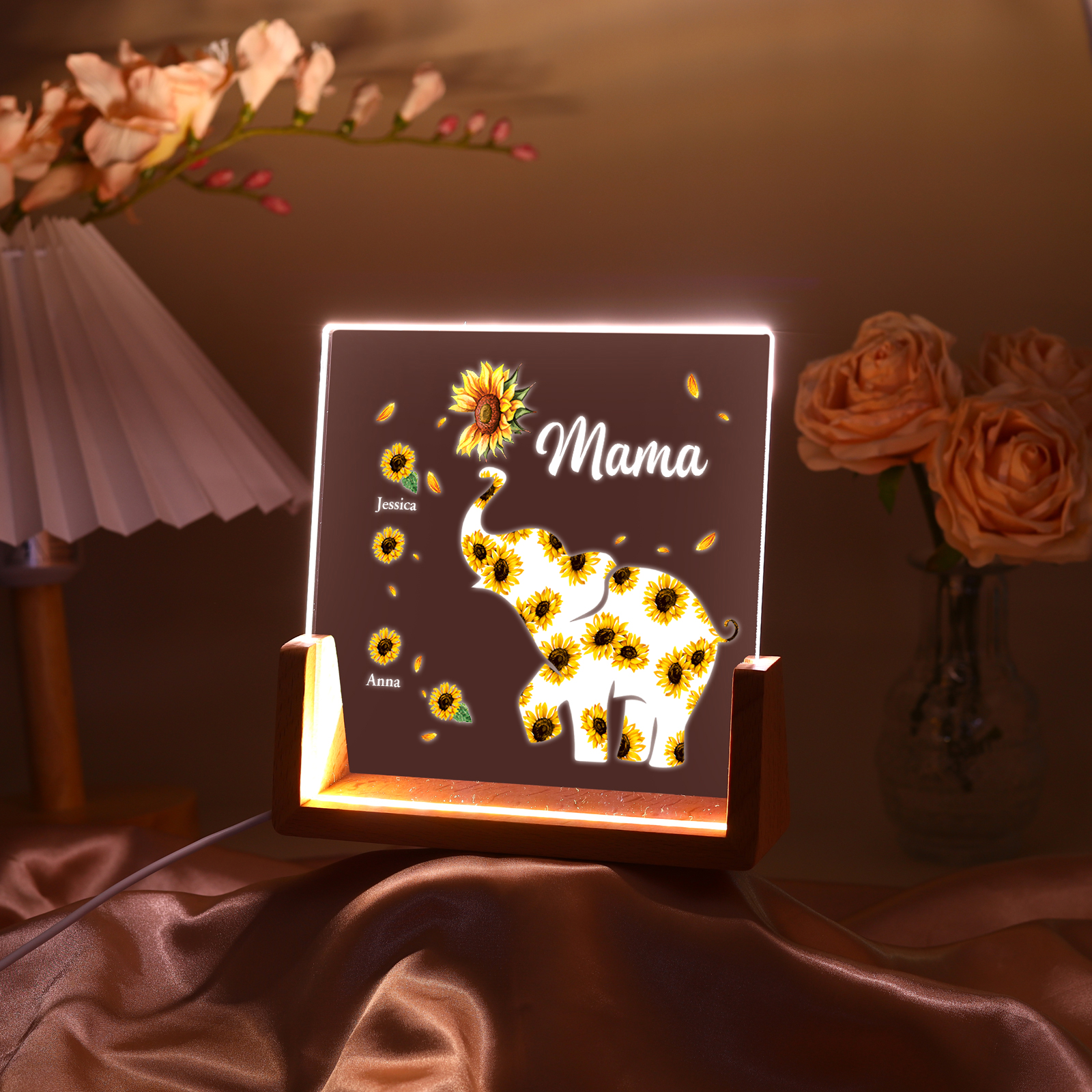 Personalisierte 2 Namen & Text Sonnenblume Elefant Nachtlicht Geschenk für Großmutter/Mutter zum Muttertag