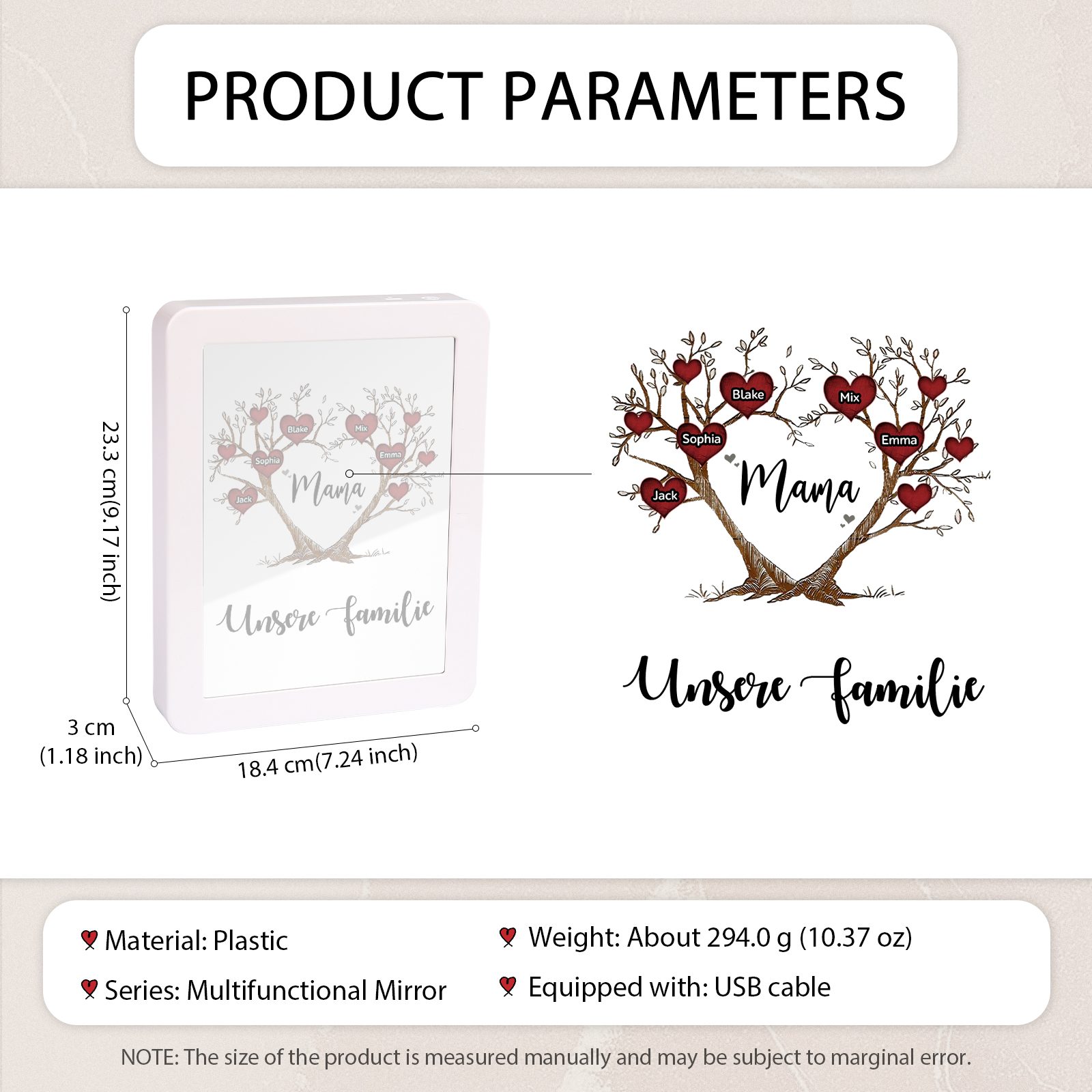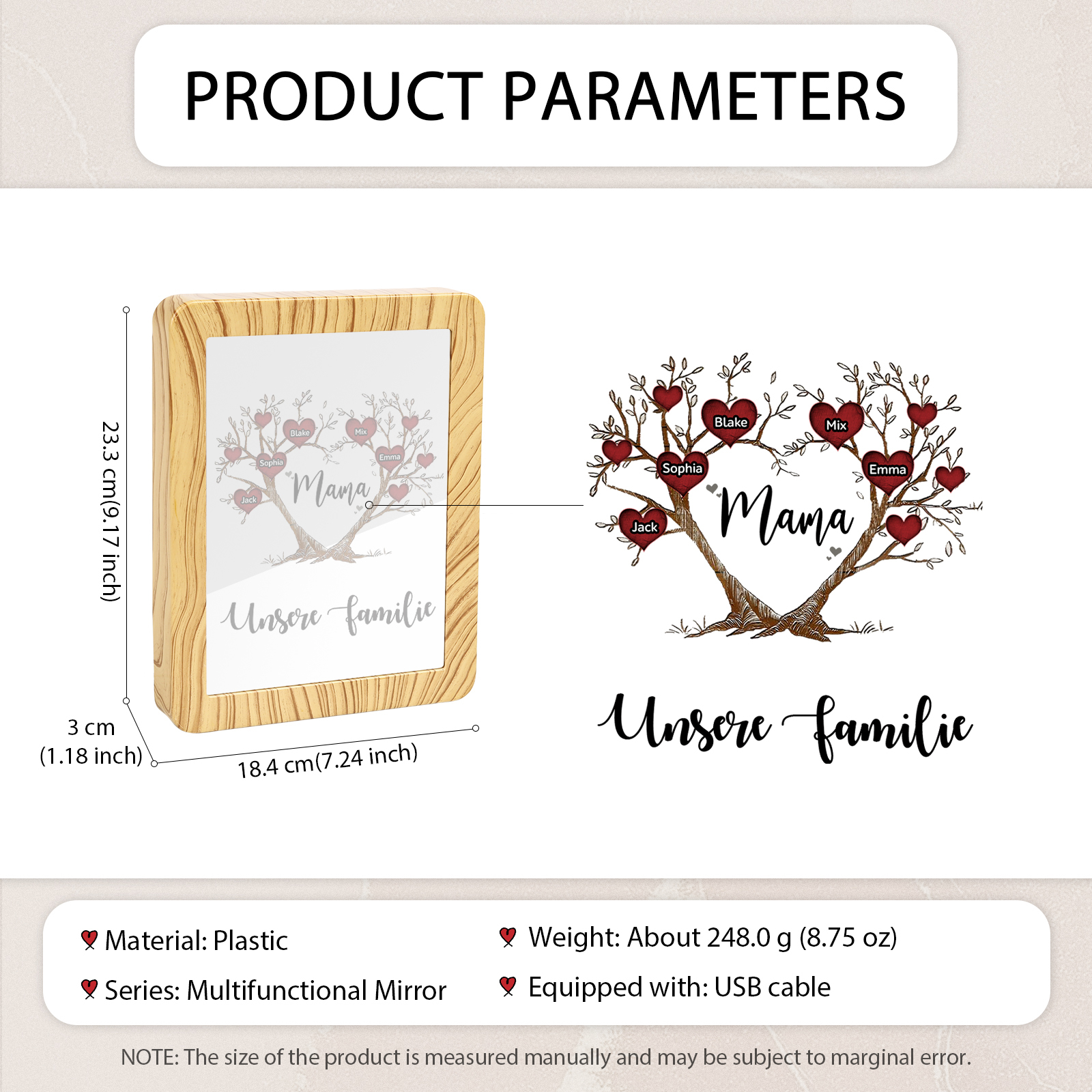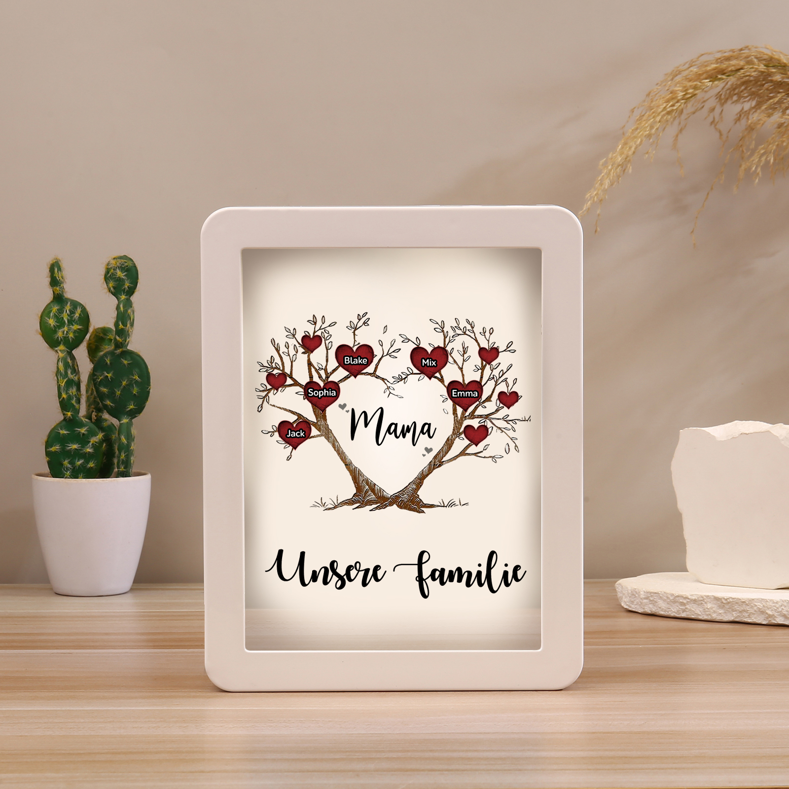 Personalisierte 2 Texte & 5 Namen Familienbaum Familie Spiegelrahmen Nachtlicht LED-Licht