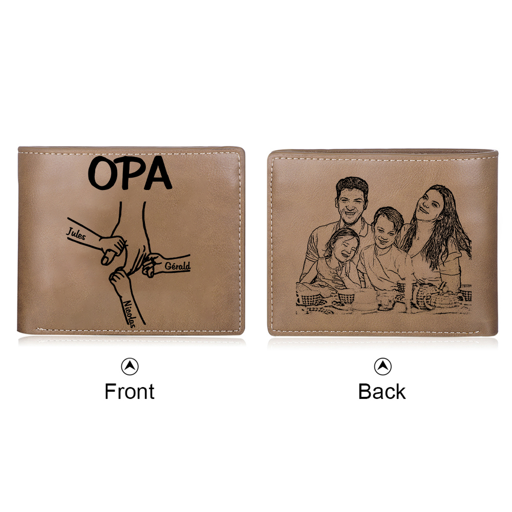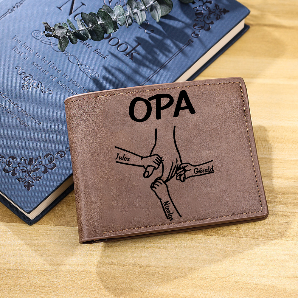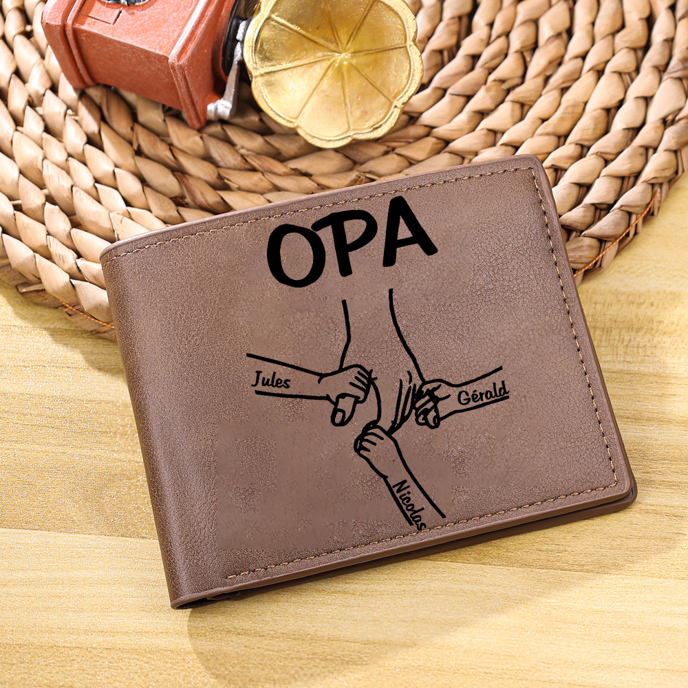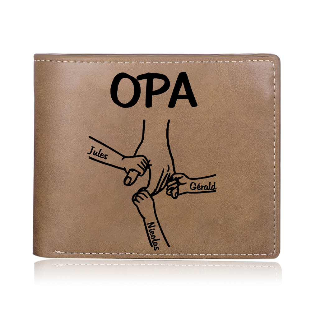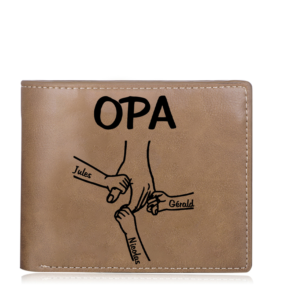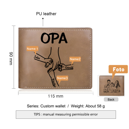 Personalisierte 3 Namen & Foto Opa Hand & 3 kleine Hand PU Leder Kurze Geldbörse für Großvater