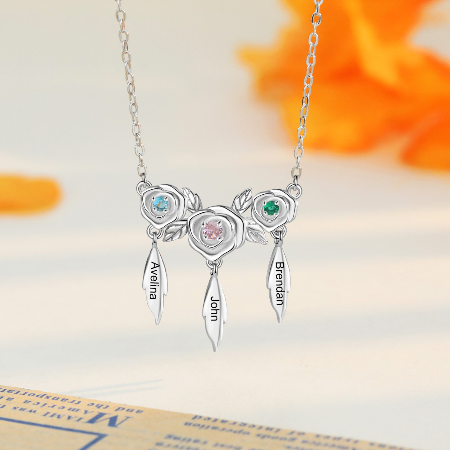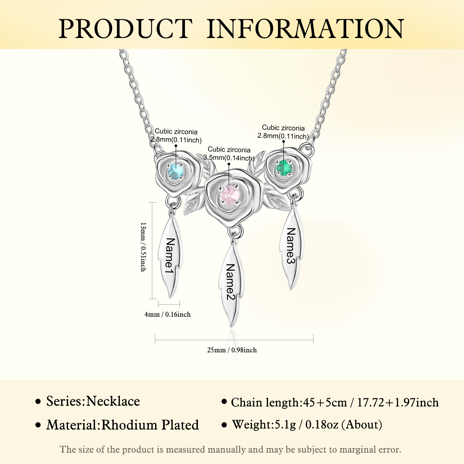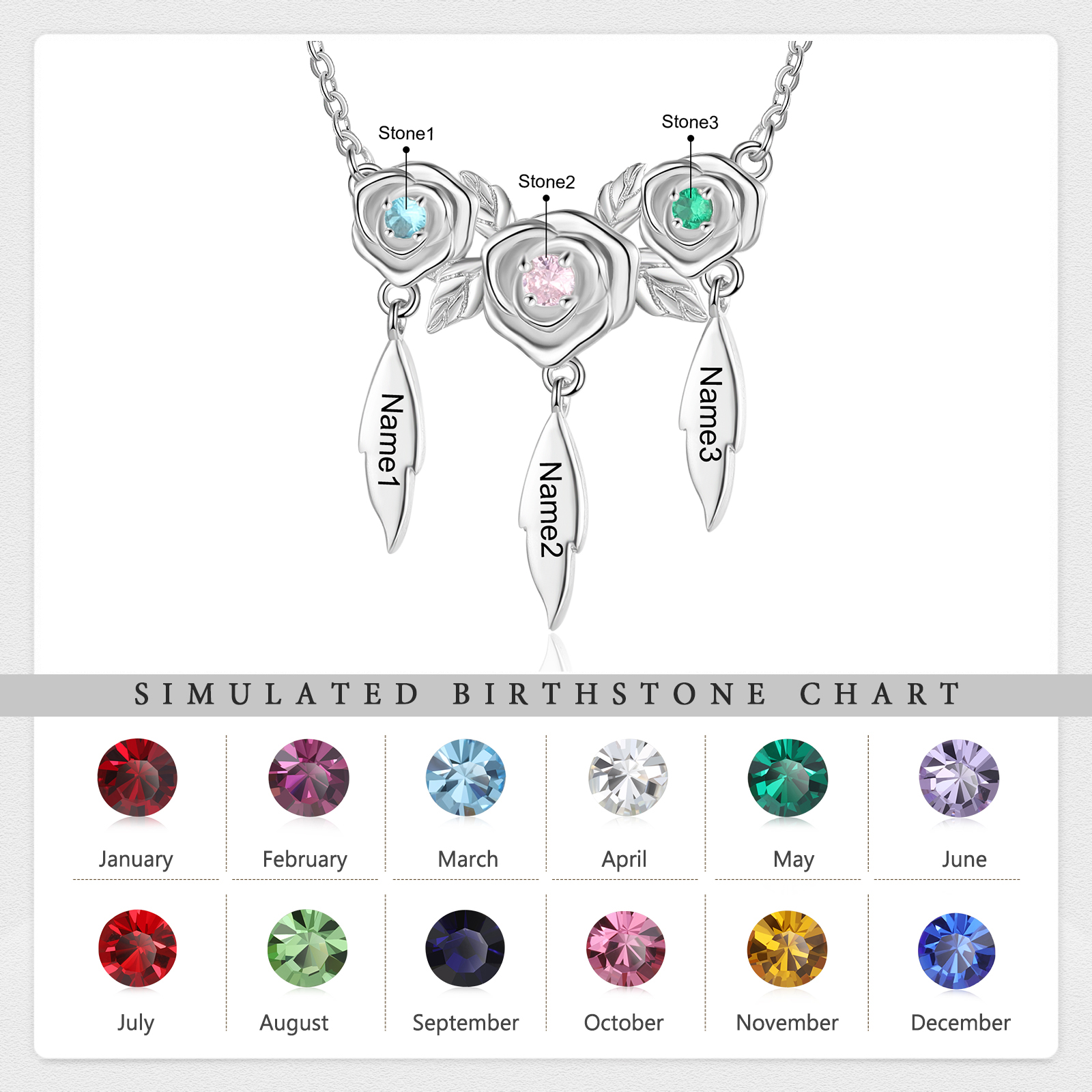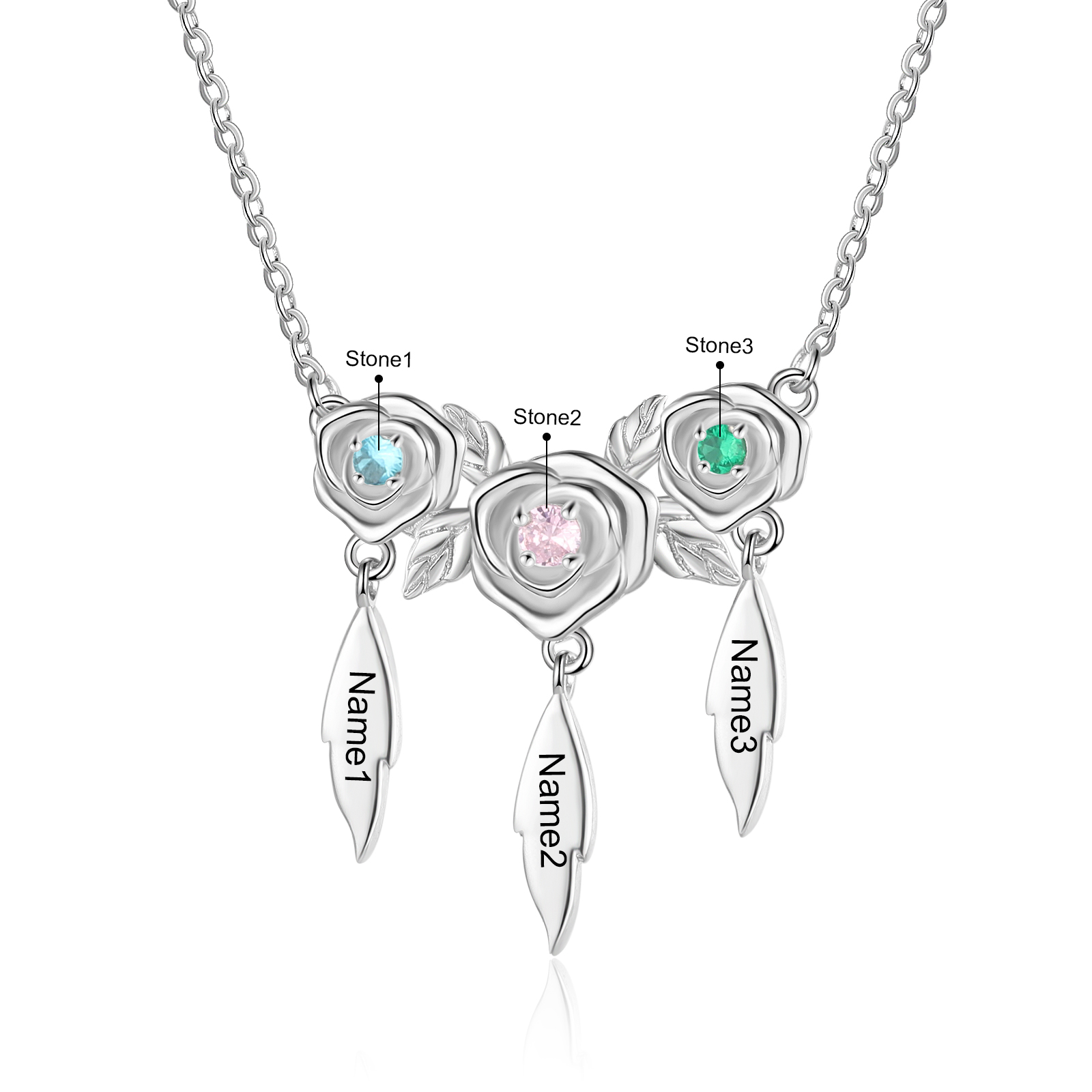 Personalisierte 3 Namen Rose Halskette mit 3 Geburtssteinen