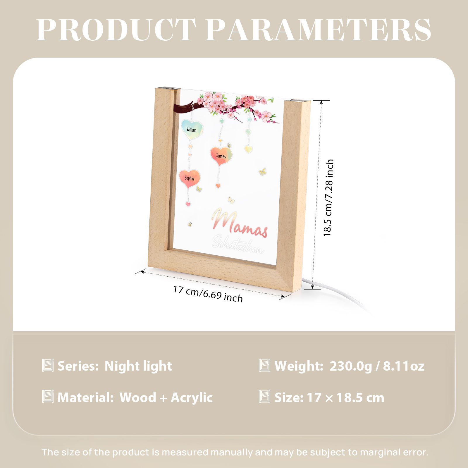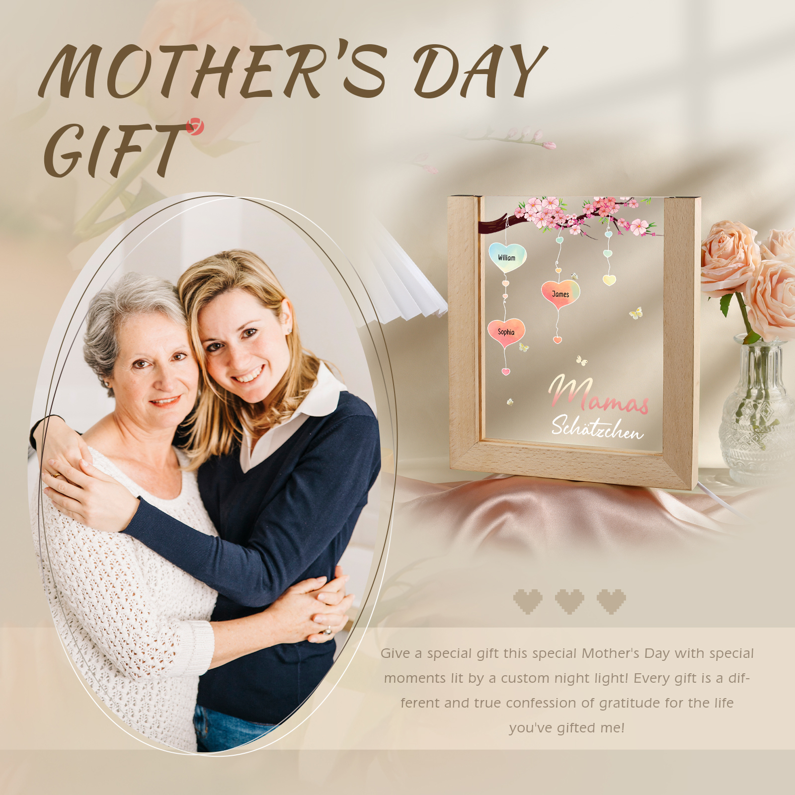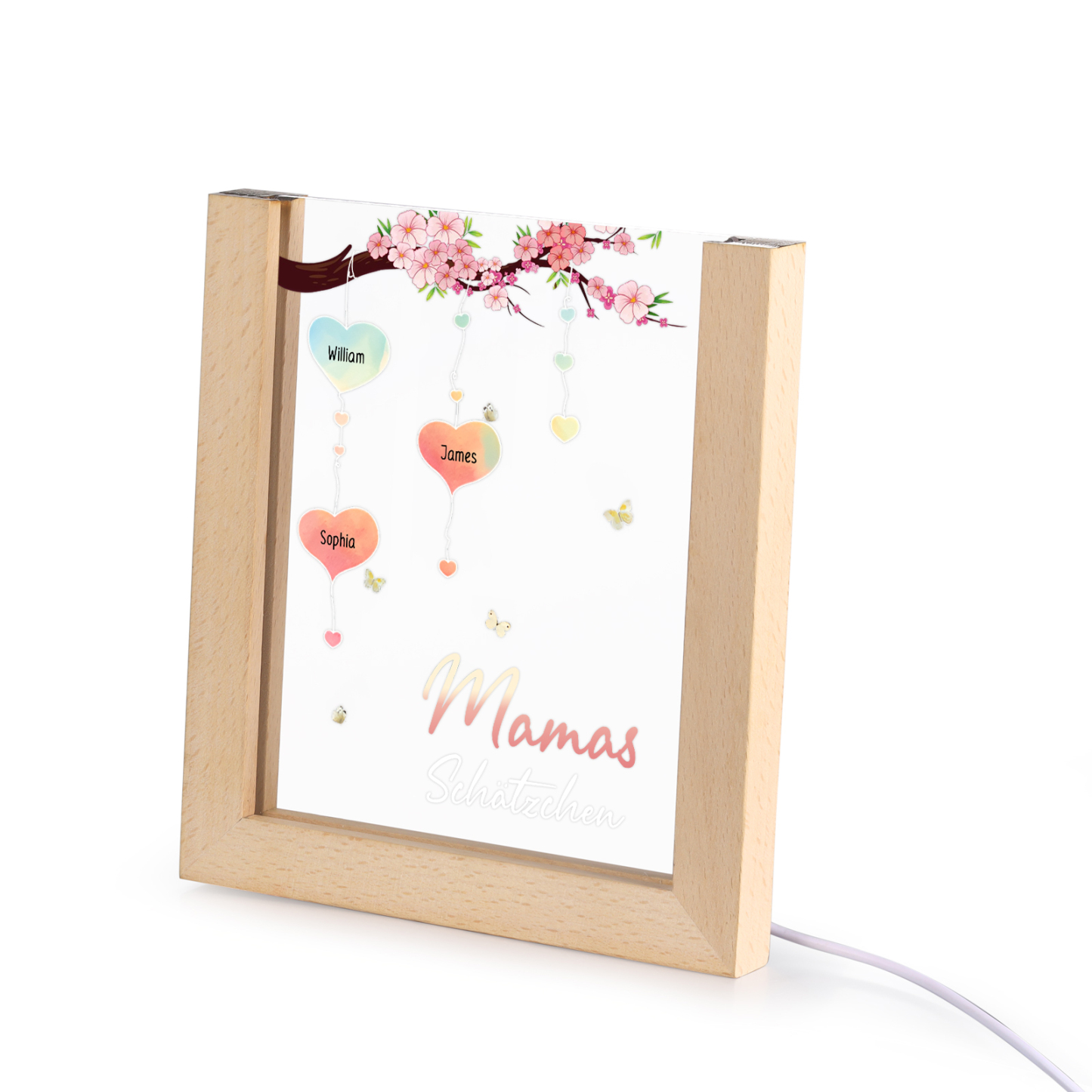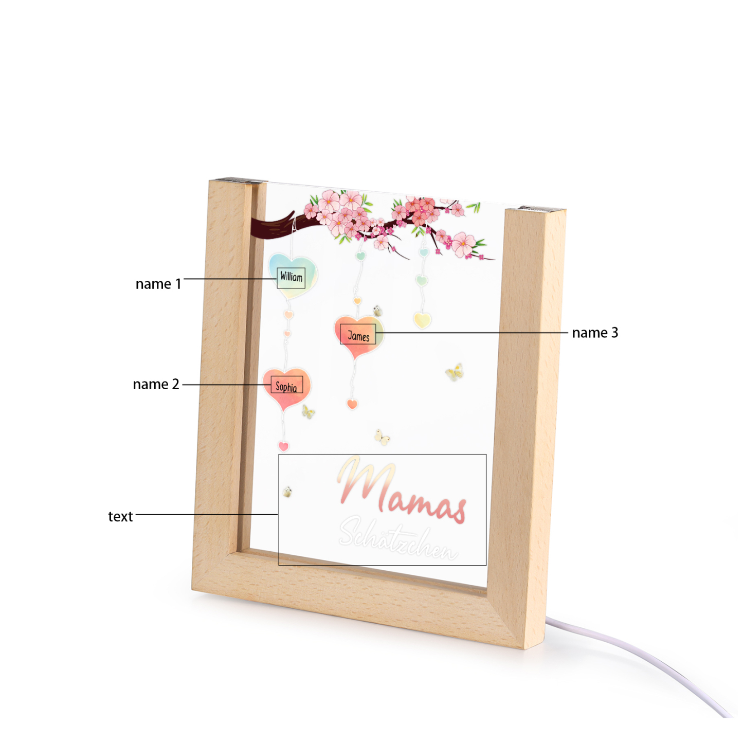 Personalisierte 3 Namen & Text Pfirsichblüte Familienbaum Acryl Rahmen Nachtlicht Geschenk für Großmutter/Mutter zum Muttertag