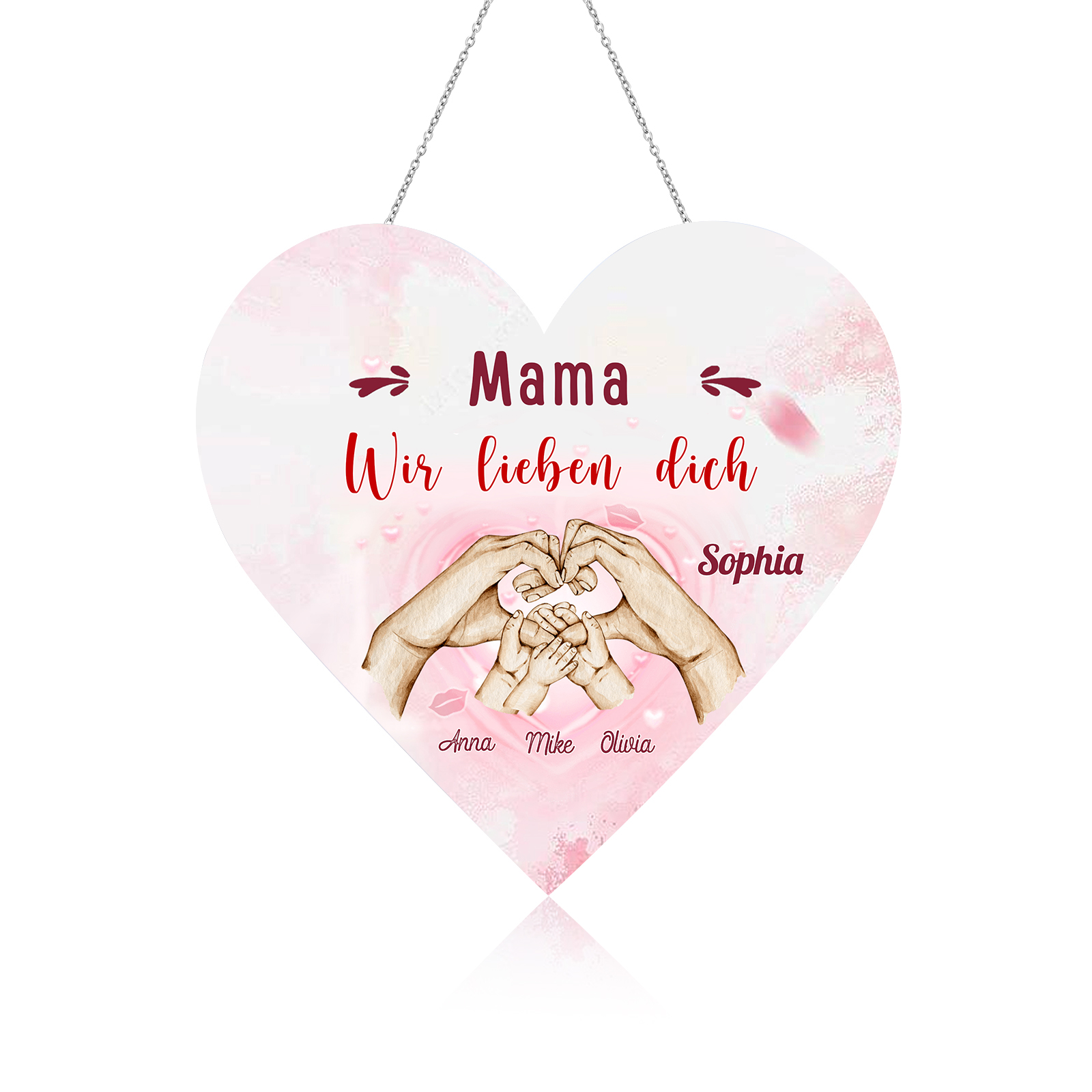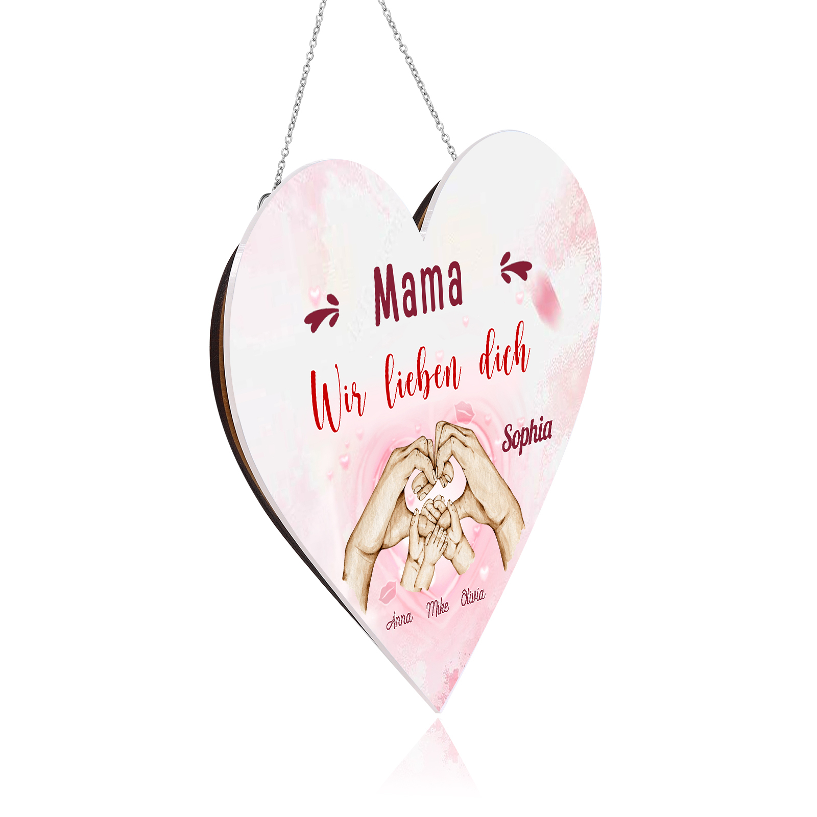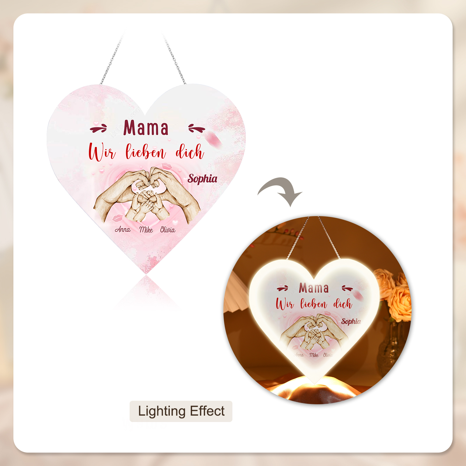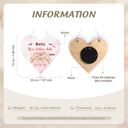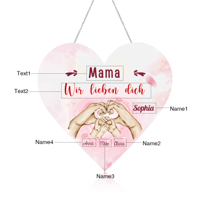 Personalisierte 4 Namen & 2 Texte Familie Hand in Hand Herz Ornament Licht Acryl Hängender Wandlampe Geschenk für Mutter