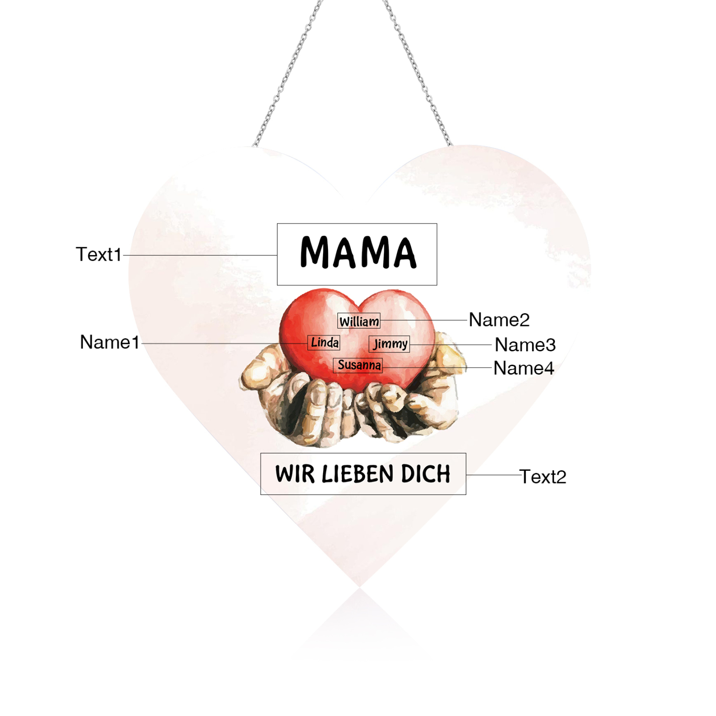 Personalisierte 4 Namen & 2 Texte Herz auf der Hand Herz Ornament Licht Acryl Hängender Wandlampe Geschenk für Mutter