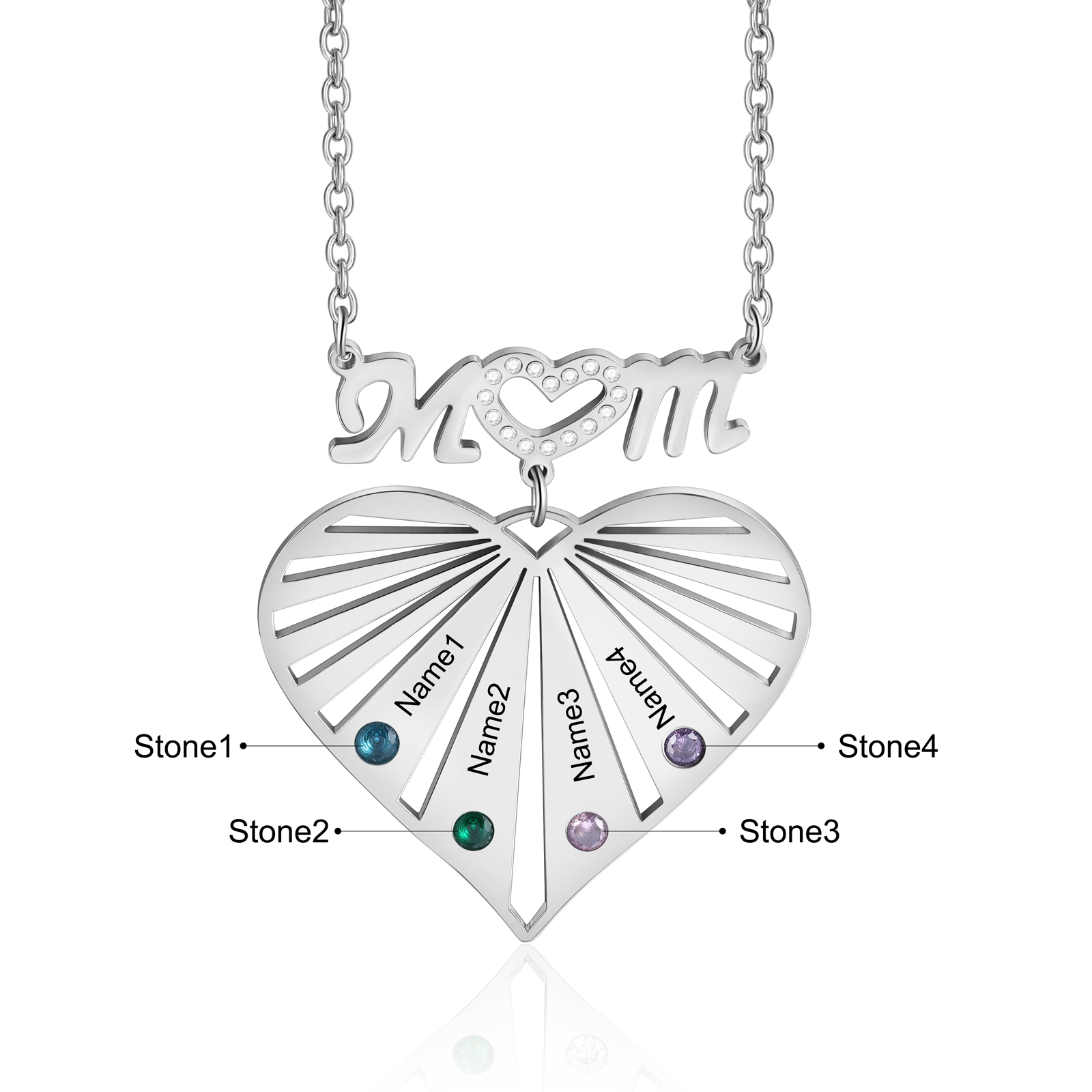 Personalisierte 4 Namen Herz Gravur "MOM" Halskette mit 4 Geburtssteinen