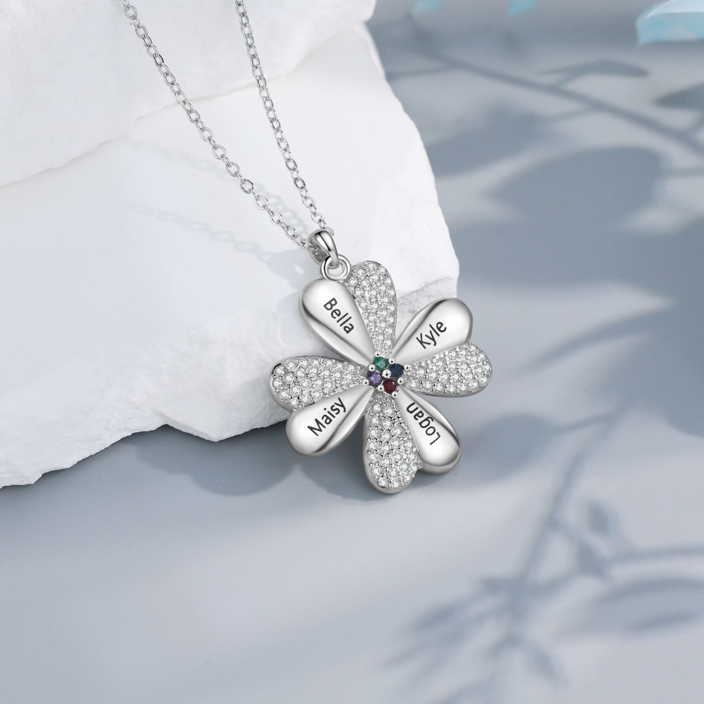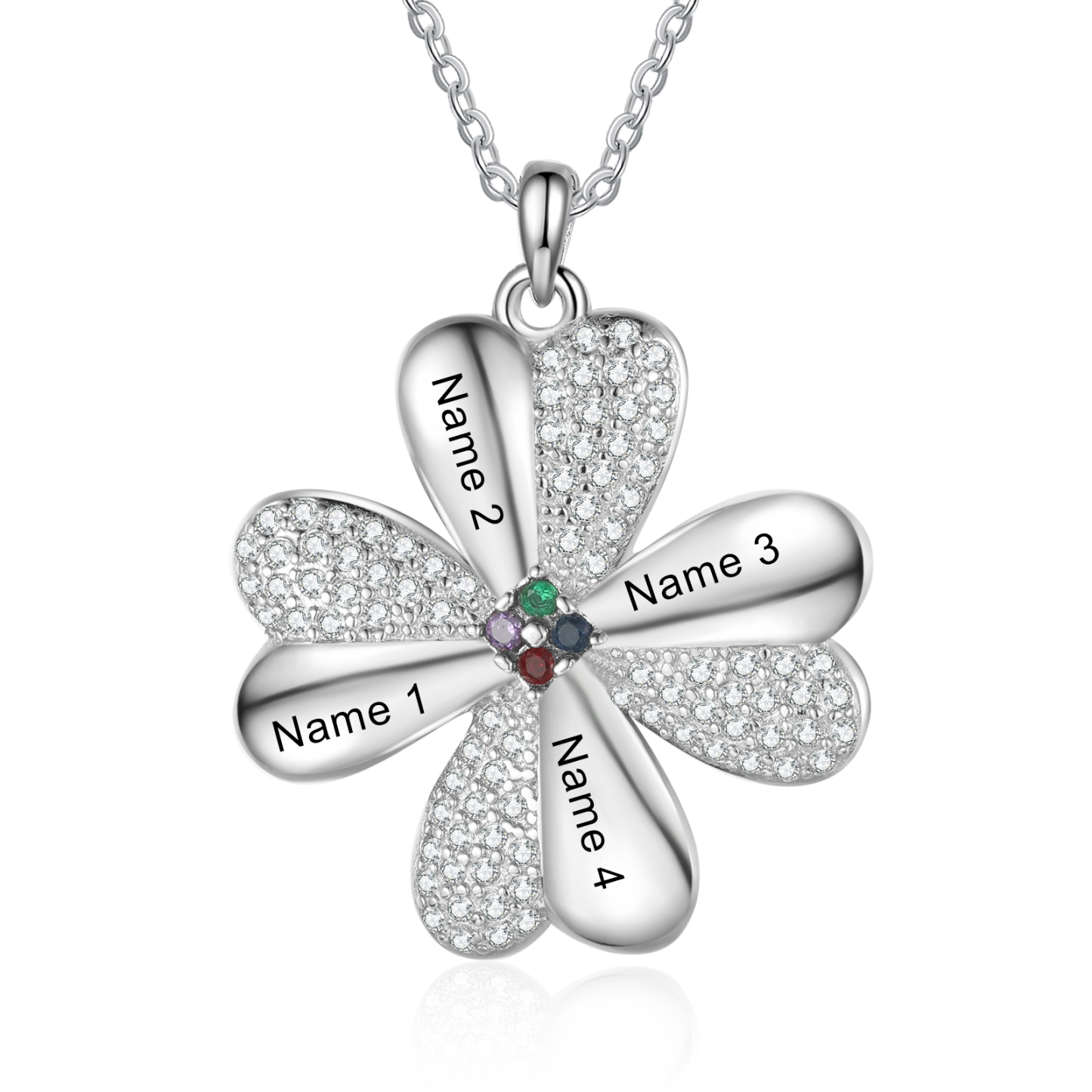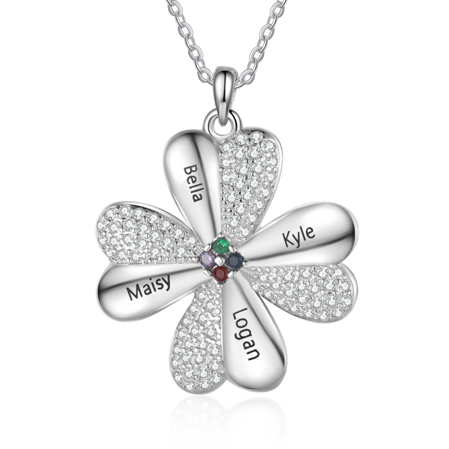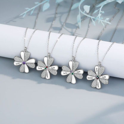 Personalisierte 4 Namen Vierblättriges Kleeblatt Glücksbringer Anhänger Halskette mit 4 Geburtssteinen