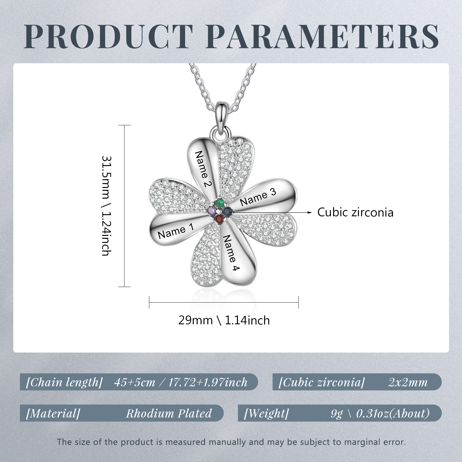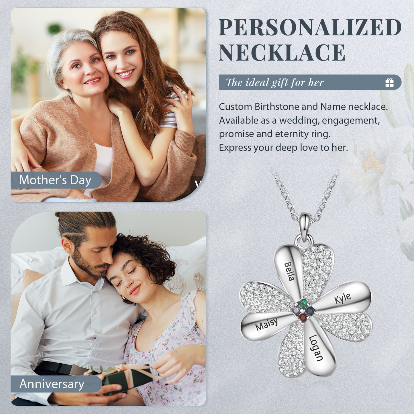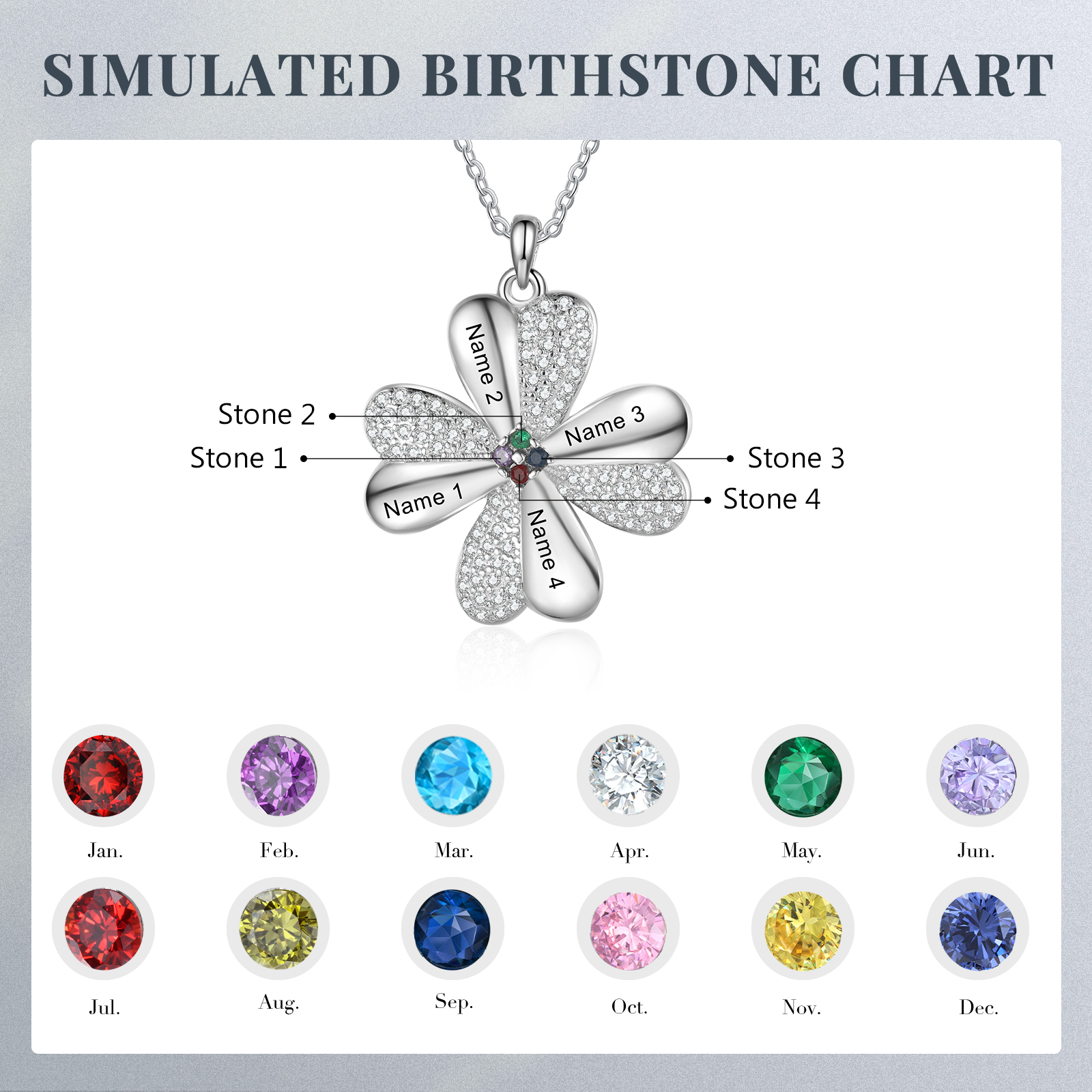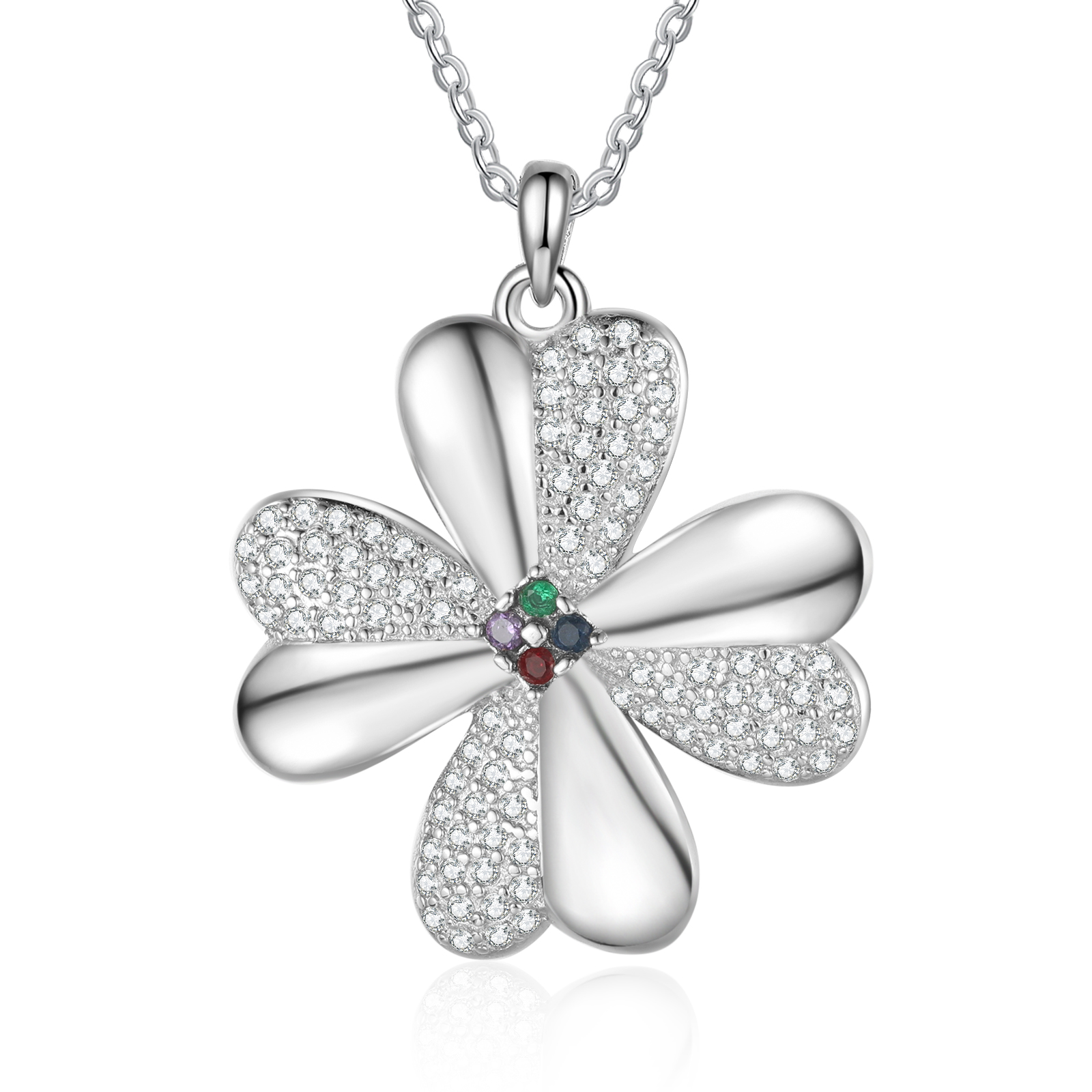 Personalisierte 4 Namen Vierblättriges Kleeblatt Glücksbringer Anhänger Halskette mit 4 Geburtssteinen