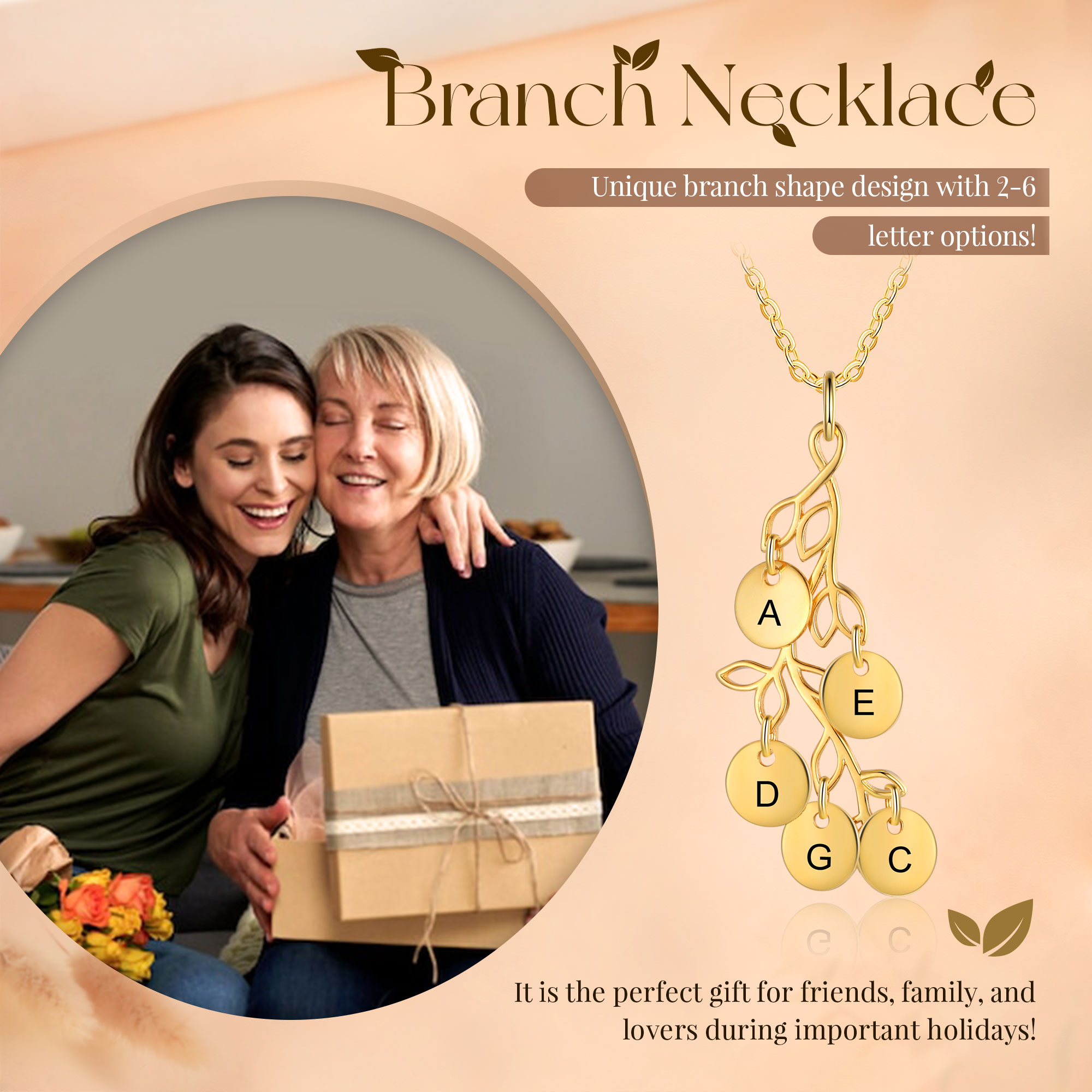 Personalisierte 5 Buchstaben Zweige mit runder Anhänger Golden Halskette