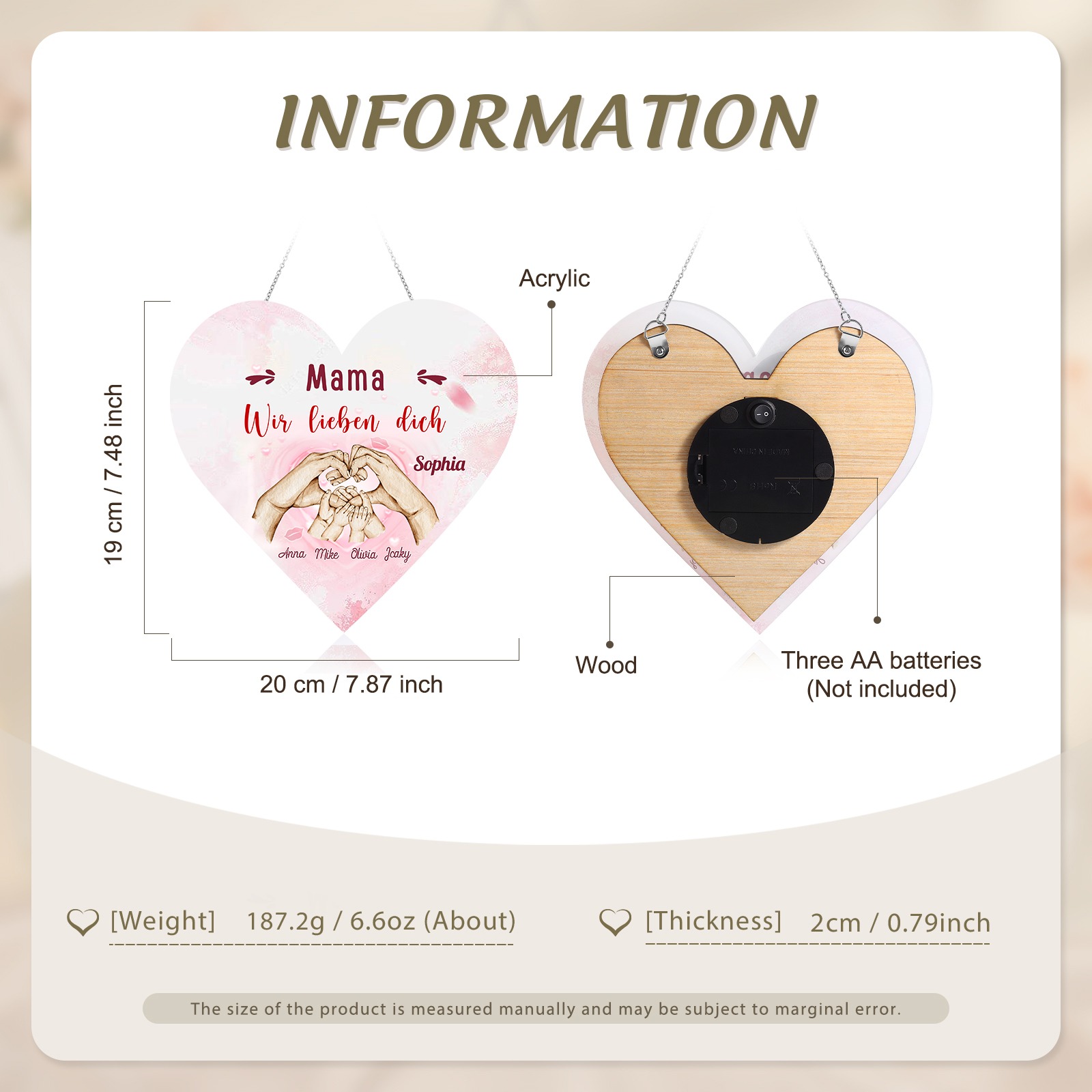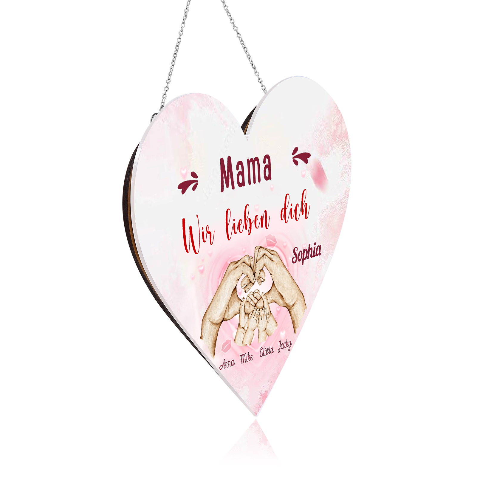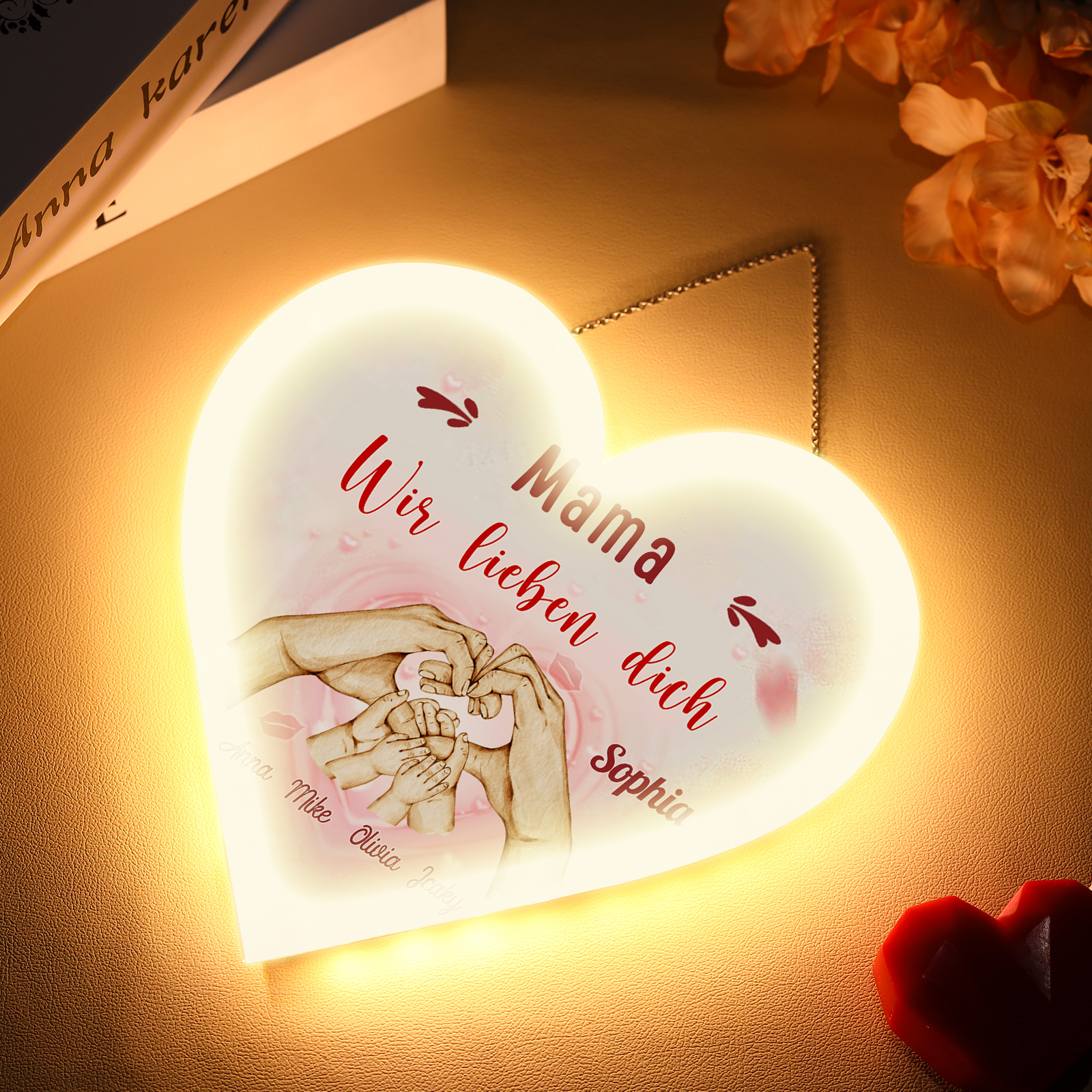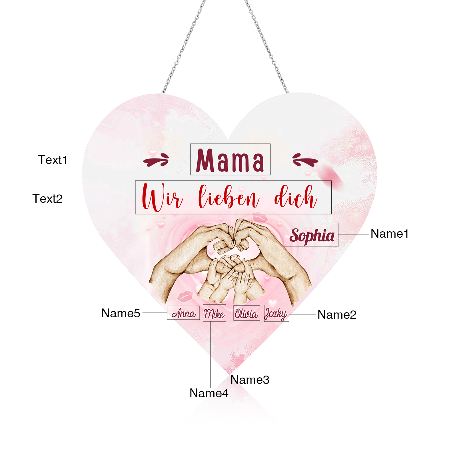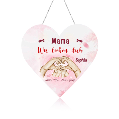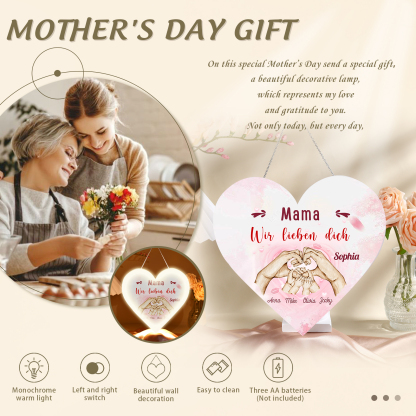 Personalisierte 5 Namen & 2 Texte Familie Hand in Hand Herz Ornament Licht Acryl Hängender Wandlampe Geschenk für Mutter