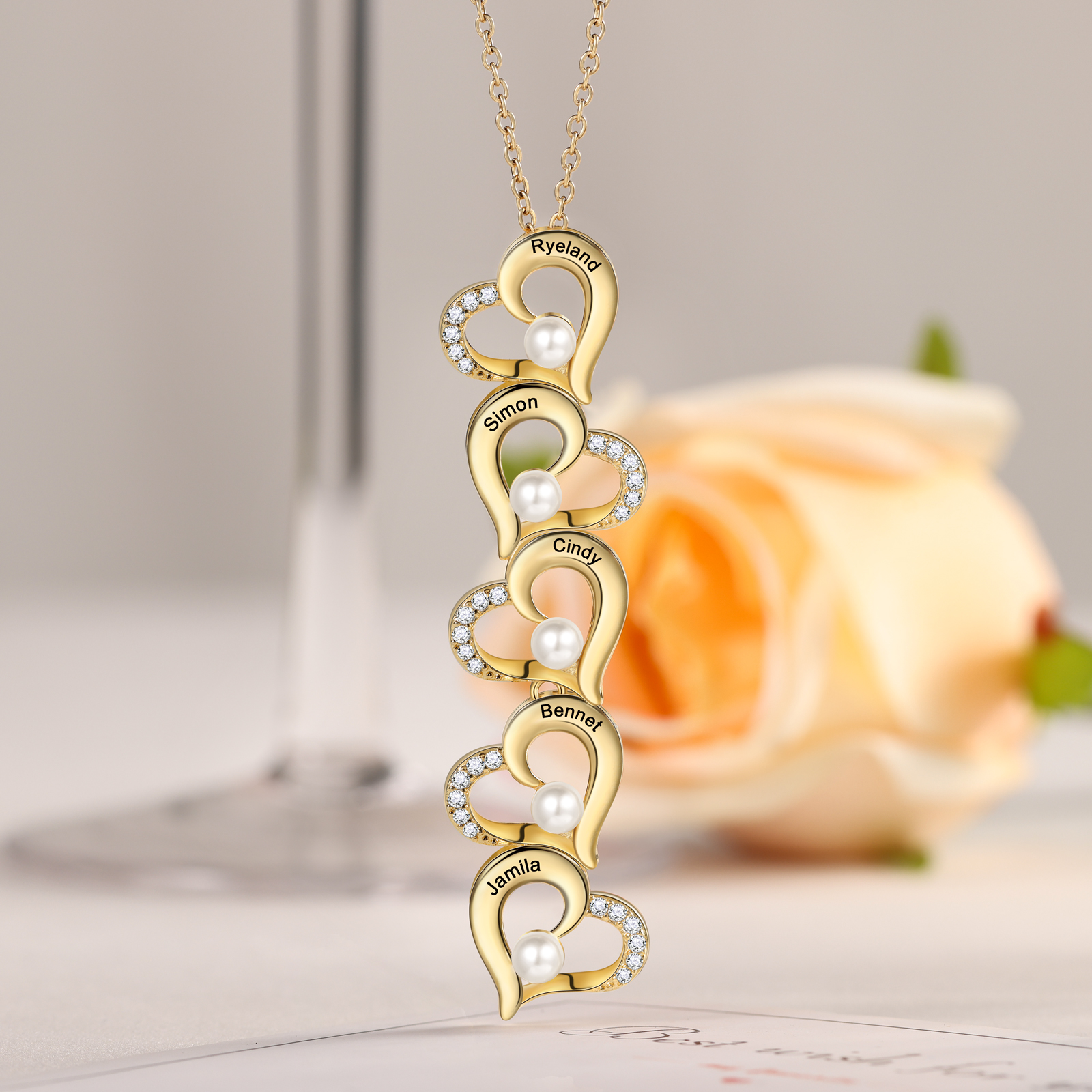 Personalisierte 5 Namen Herz Perle Halskette mit Zirkonia