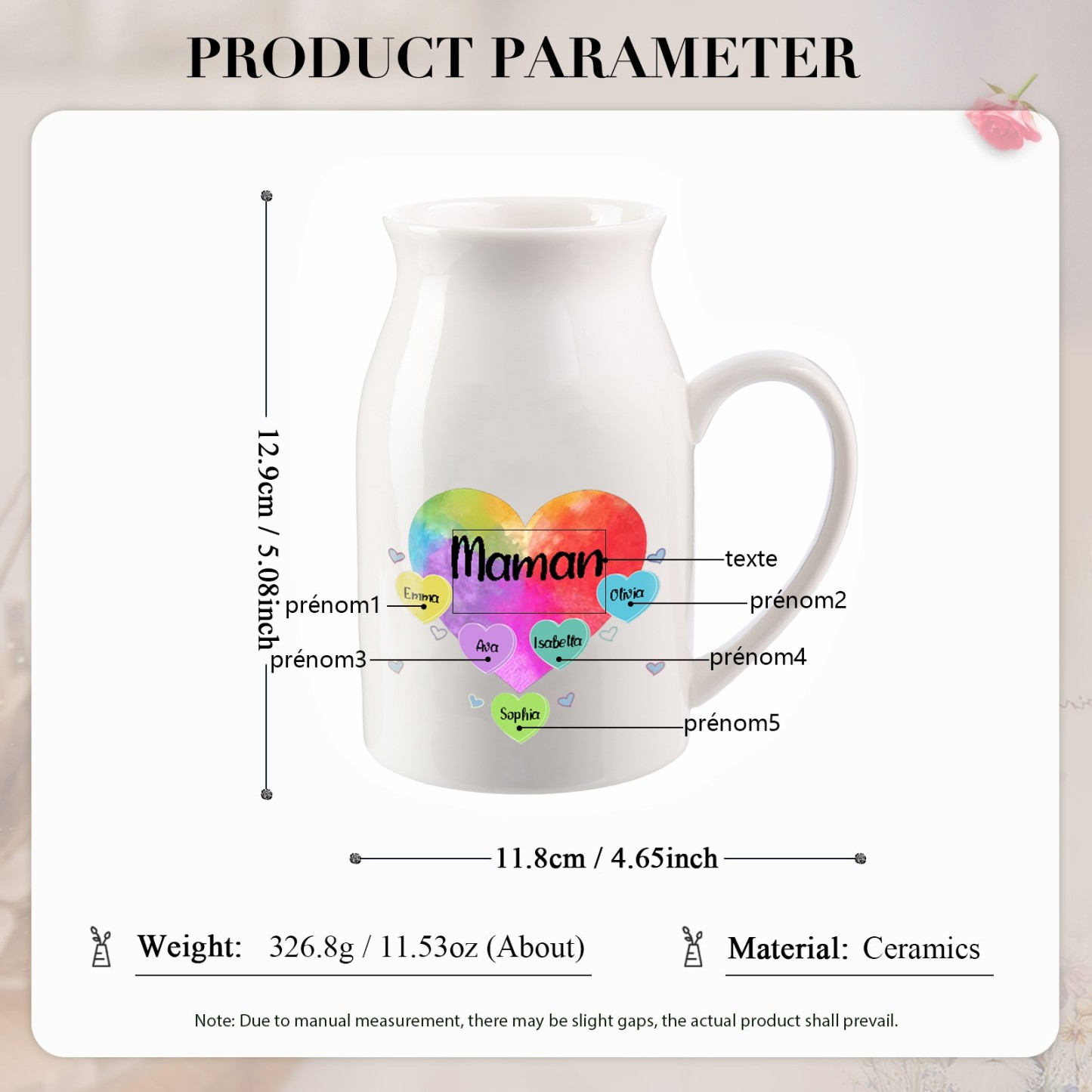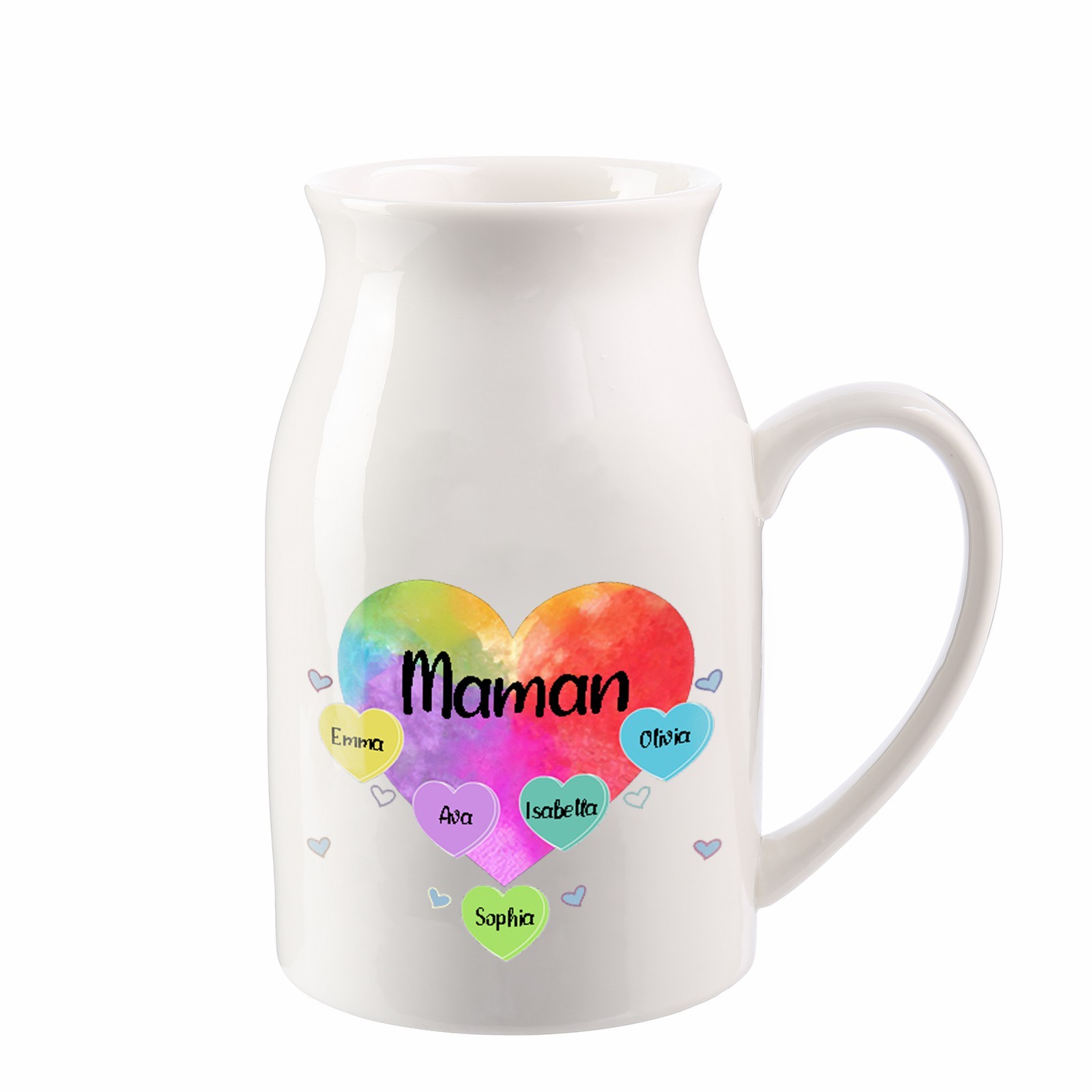 Personalisierte 5 Namen & Text Buntes Herz Familie Vase