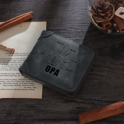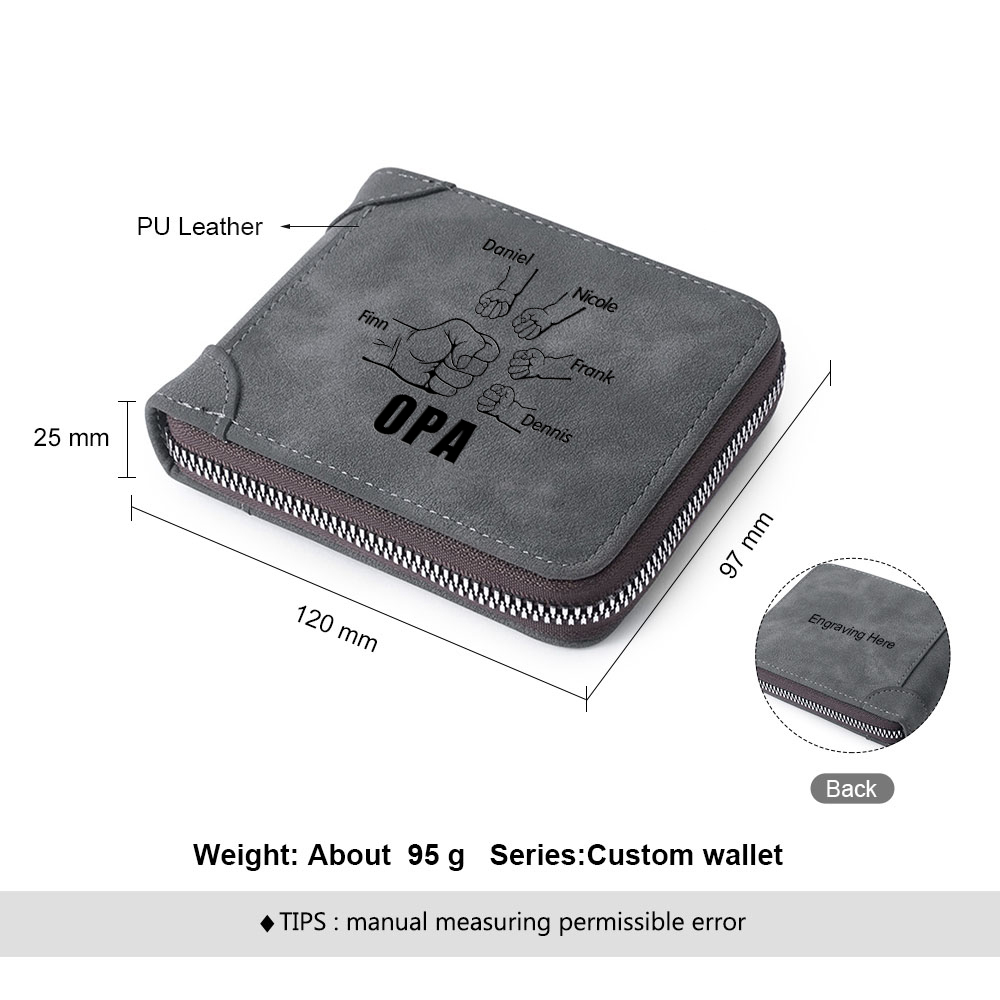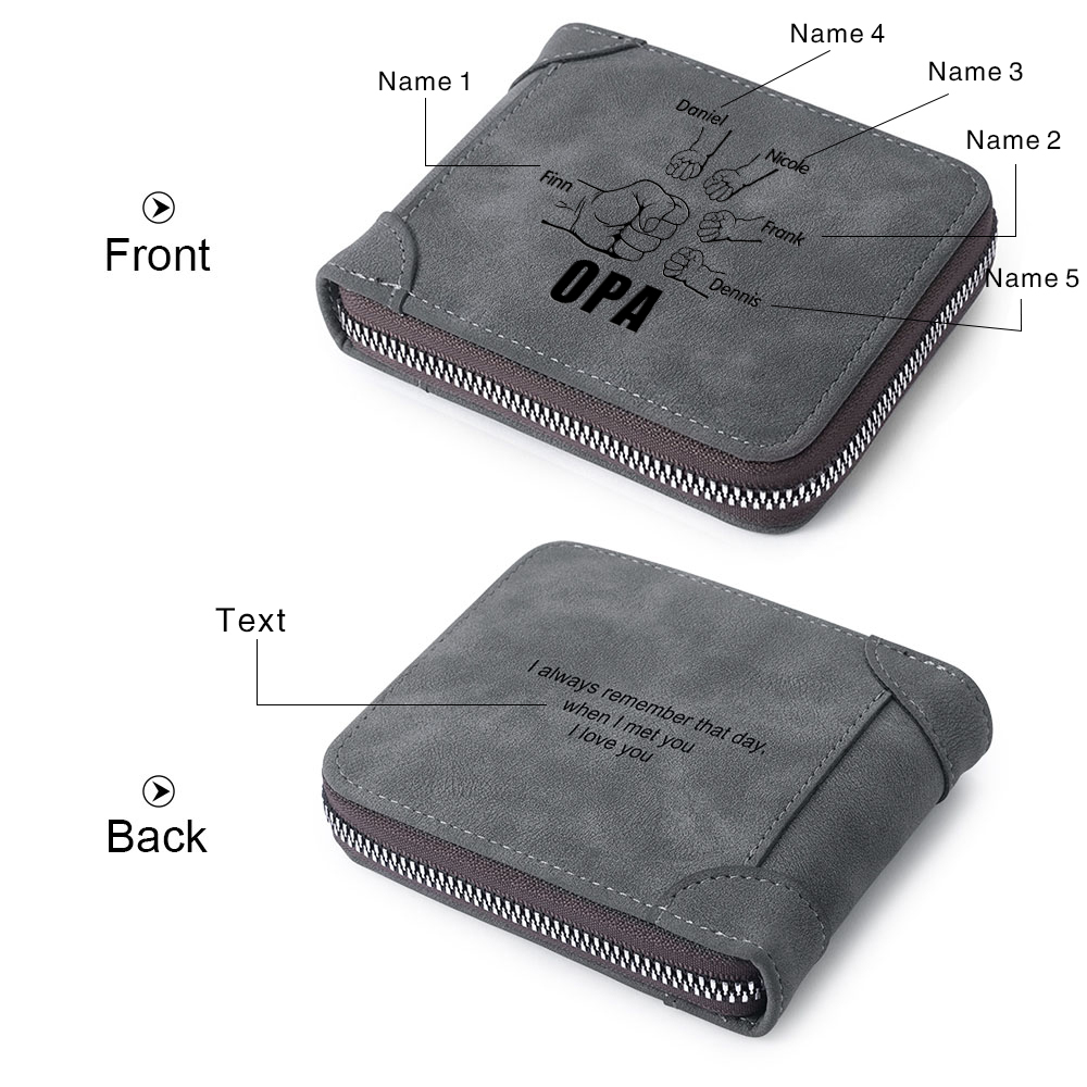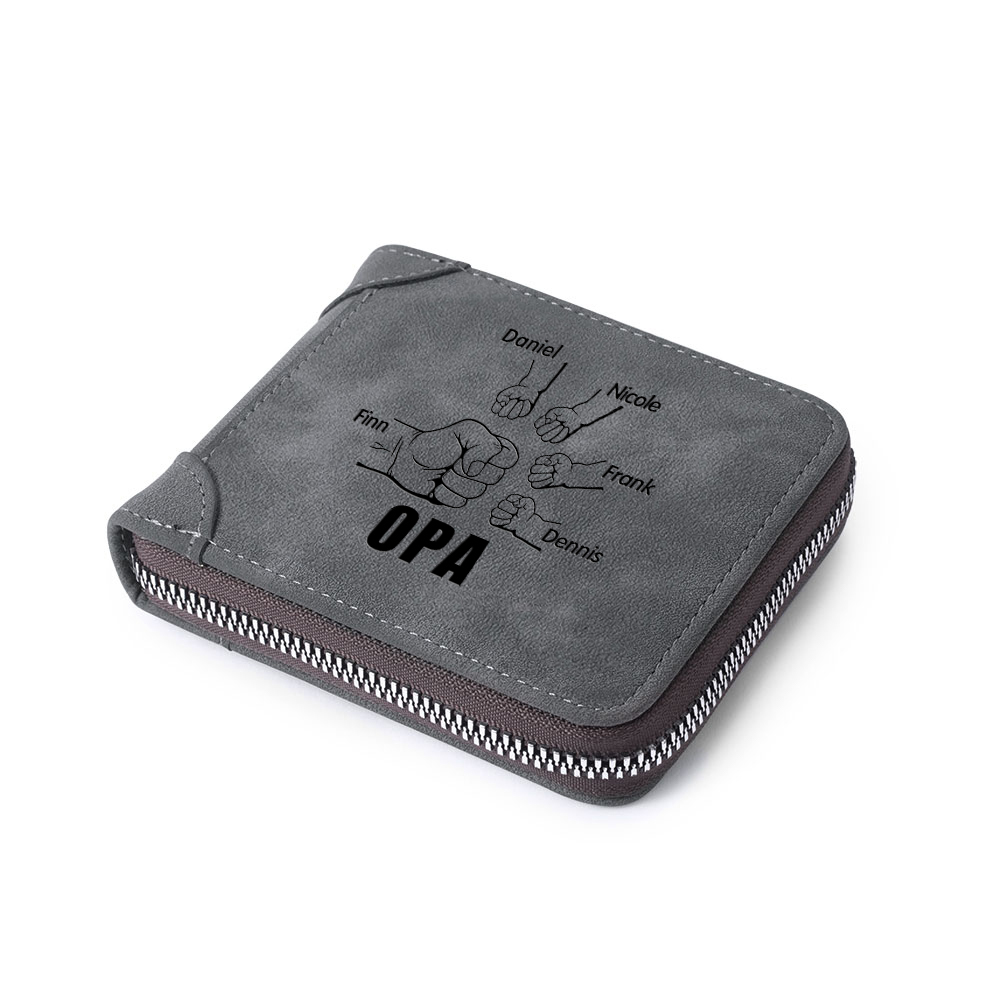 Personalisierte 5 Namen & Text Opa Faust PU Leder Grau Blau Geldbörse für Großvater
