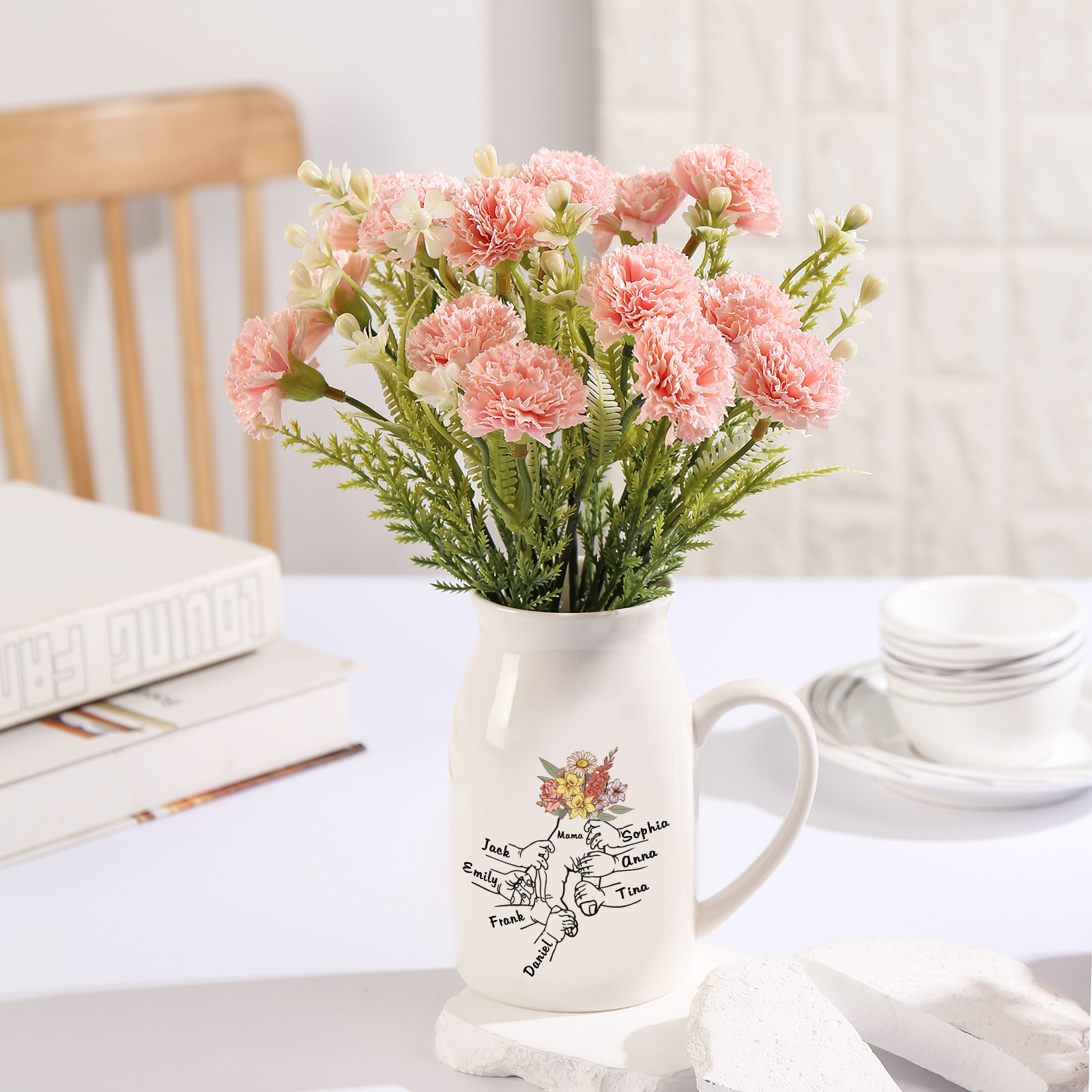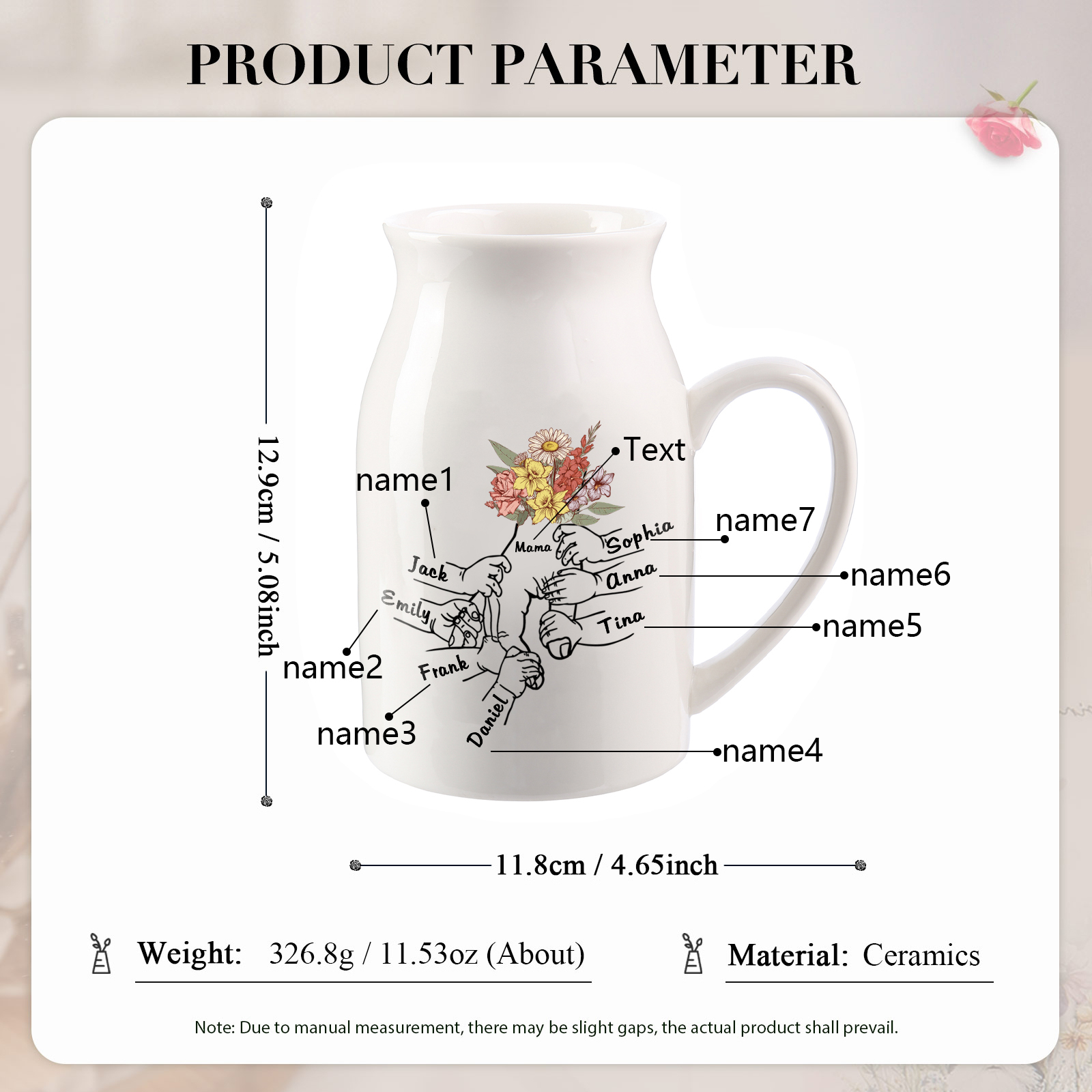 Personalisierte 7 Namen & Text Bunte Blumen Hand in Hand Familie Vase