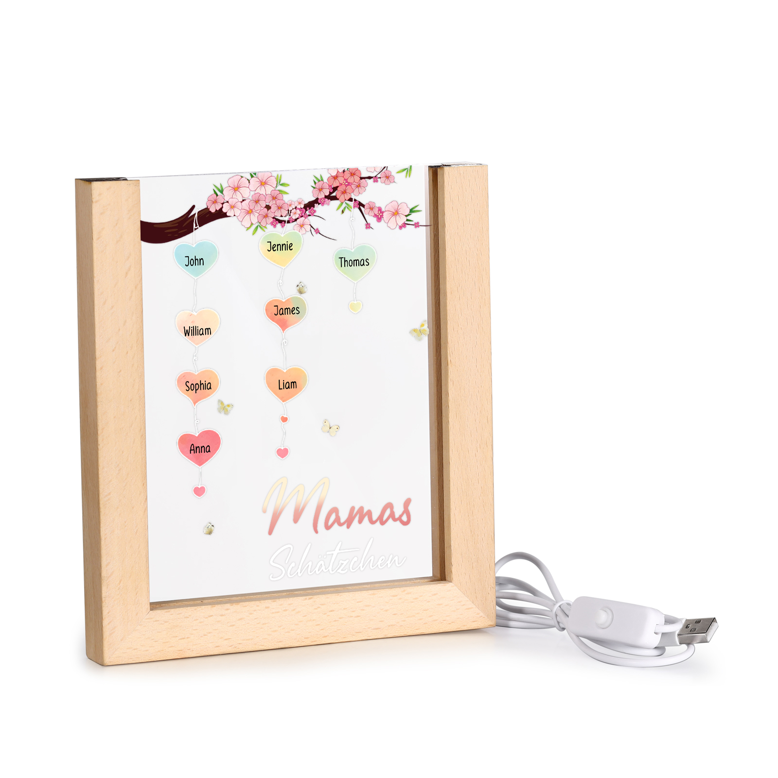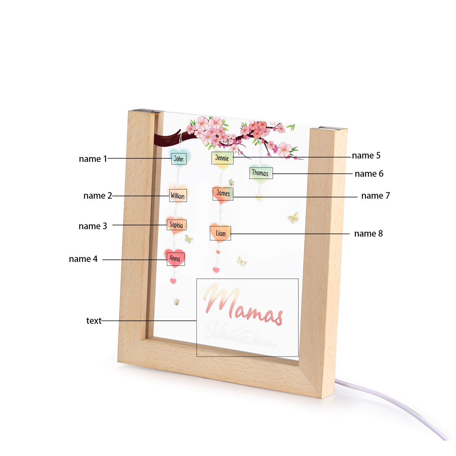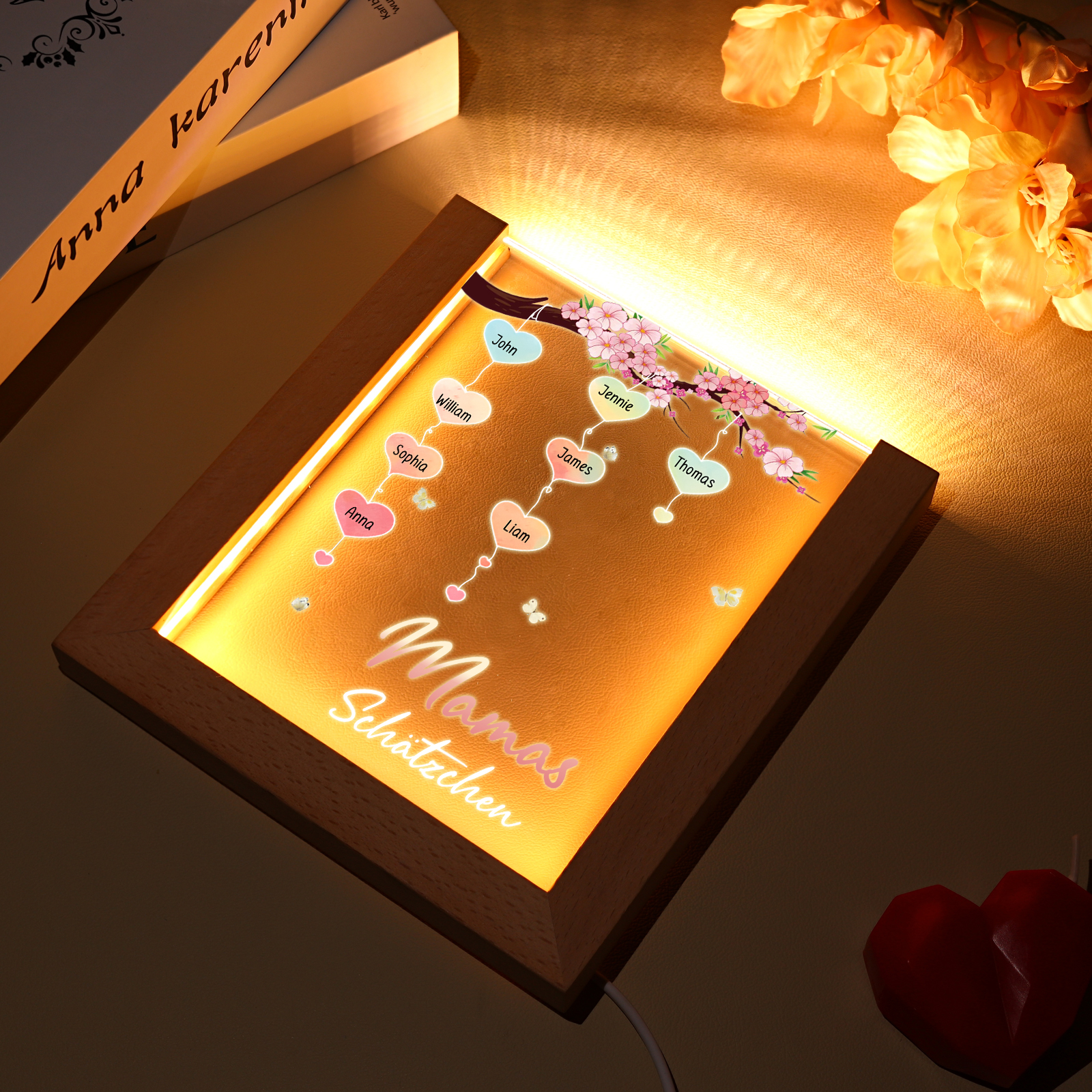 Personalisierte 8 Namen & Text Pfirsichblüte Familienbaum Acryl Rahmen Nachtlicht Geschenk für Großmutter/Mutter zum Muttertag