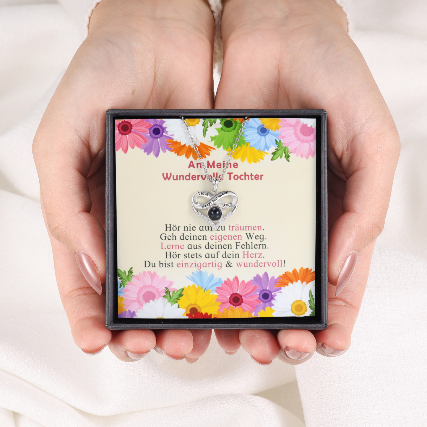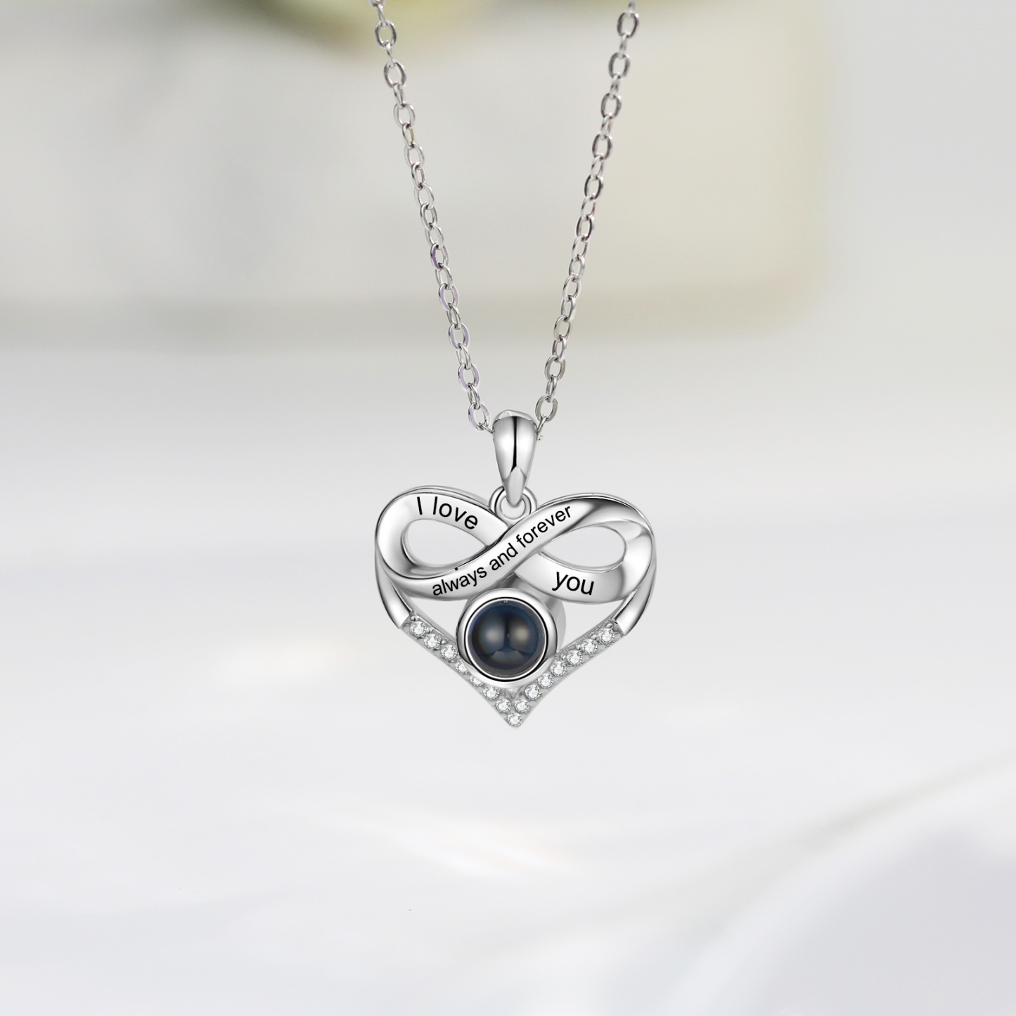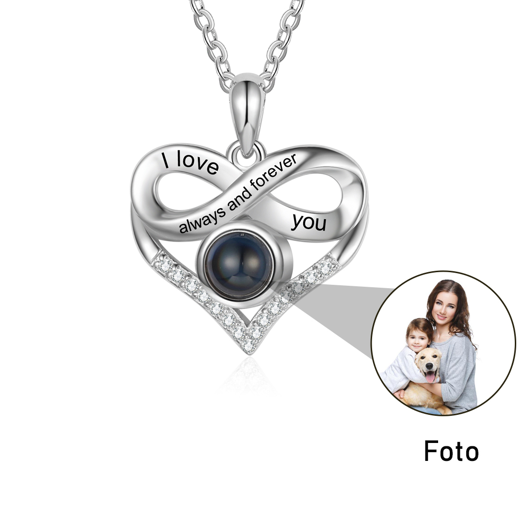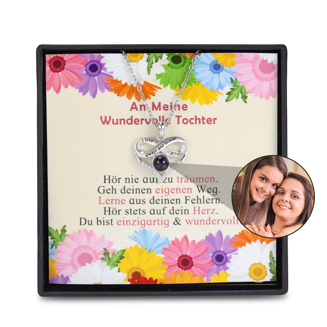 Personalisierte Foto & 2 Texte Infinity Herz Projektion Halskette mit 2 Geburtssteinen-Geschenk mit Nachrichtenkarte