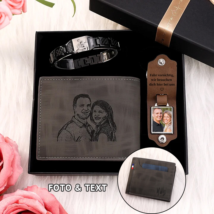 Personalisierte Foto & Text Geldbörse & Foto & 2 Texte Leder Schlüsselanhänger & Foto Armband Geschenkpackung Geschenkset für Mann Freund