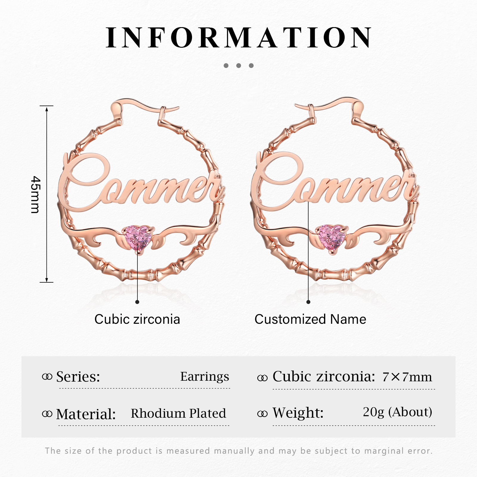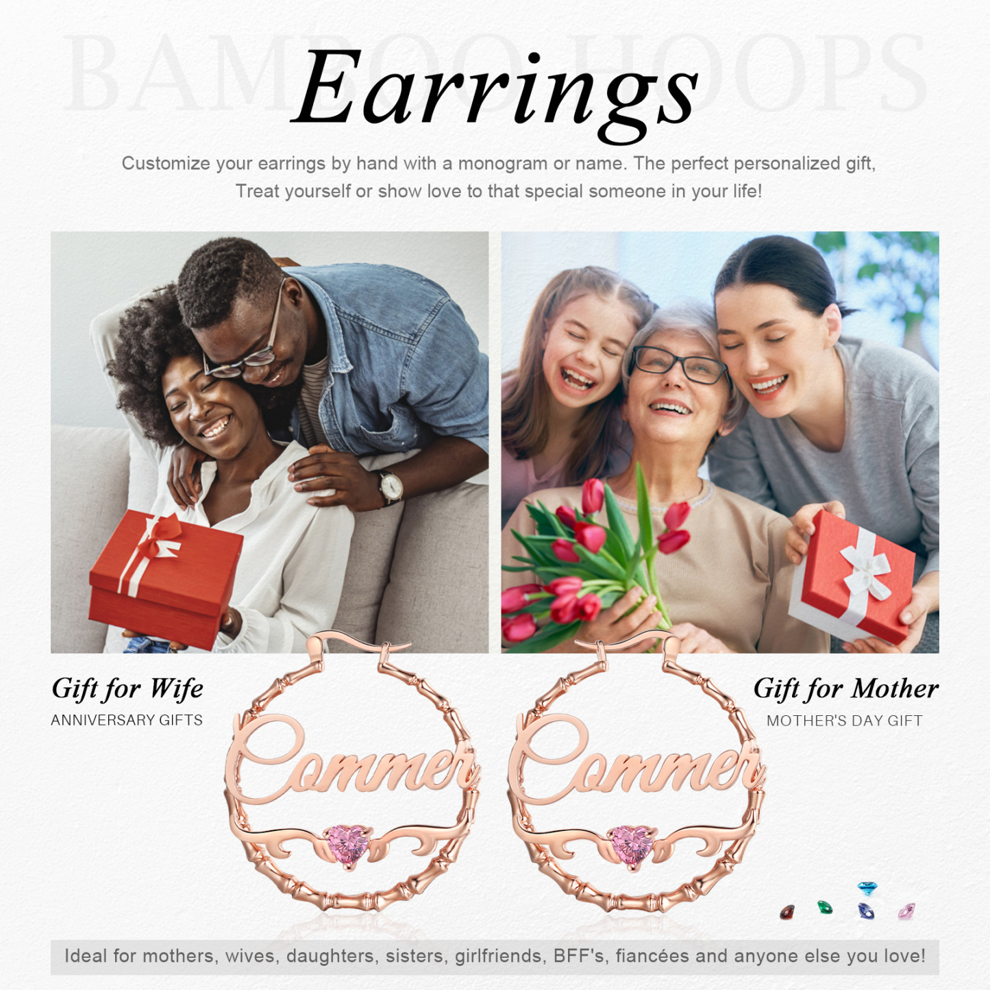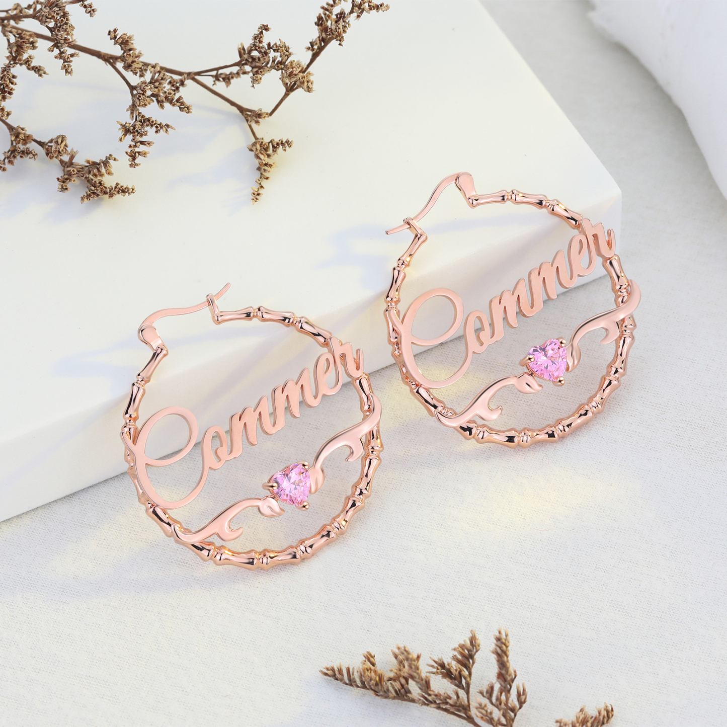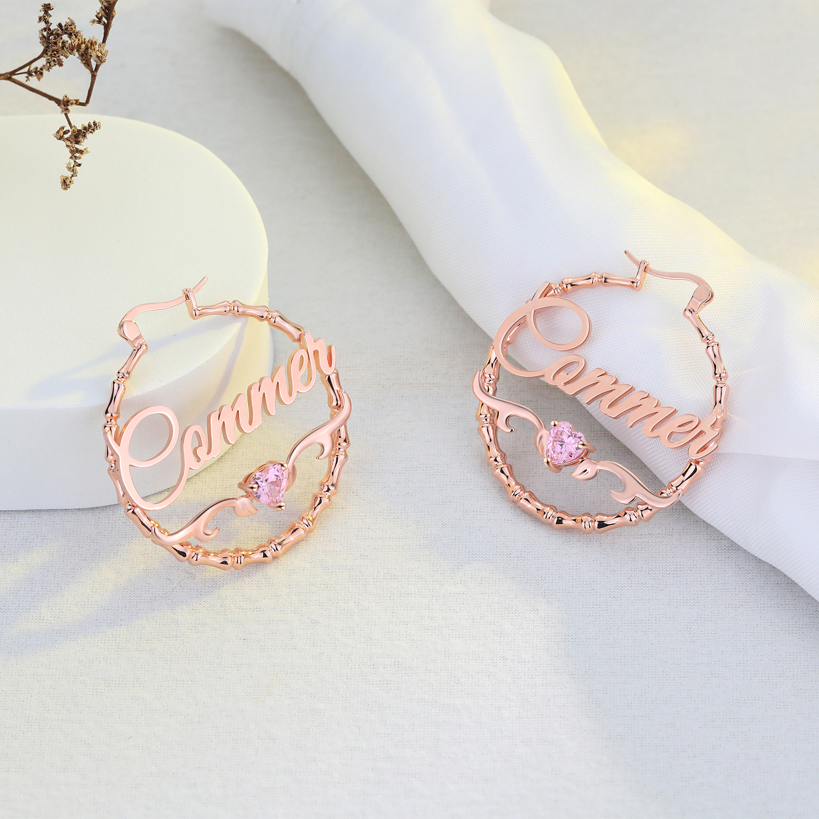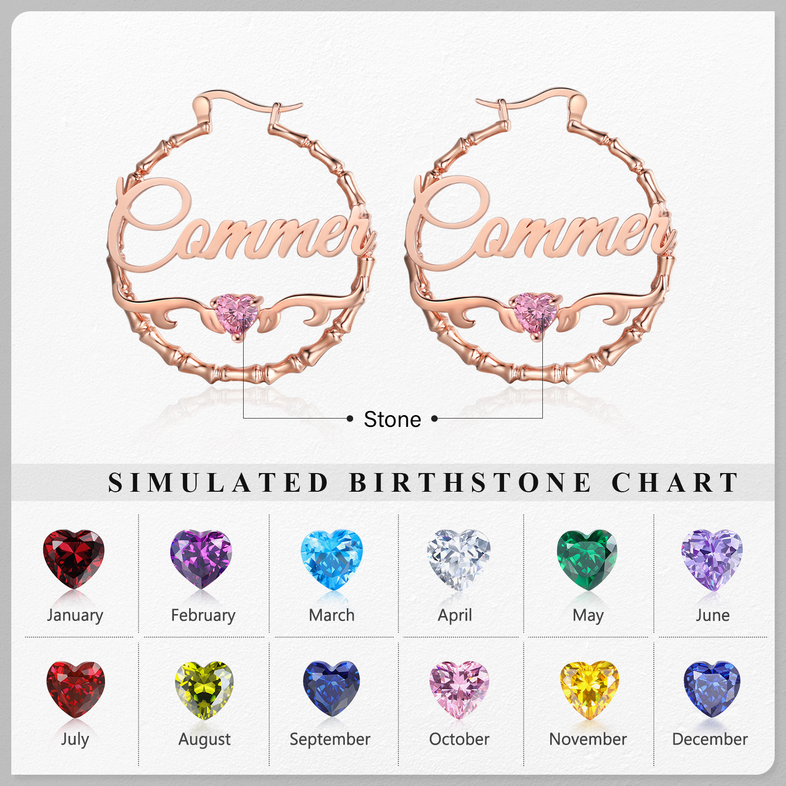 Personalisierte Gravur 1 Name Bamboo Ohrringe mit Herz Geburtsstein