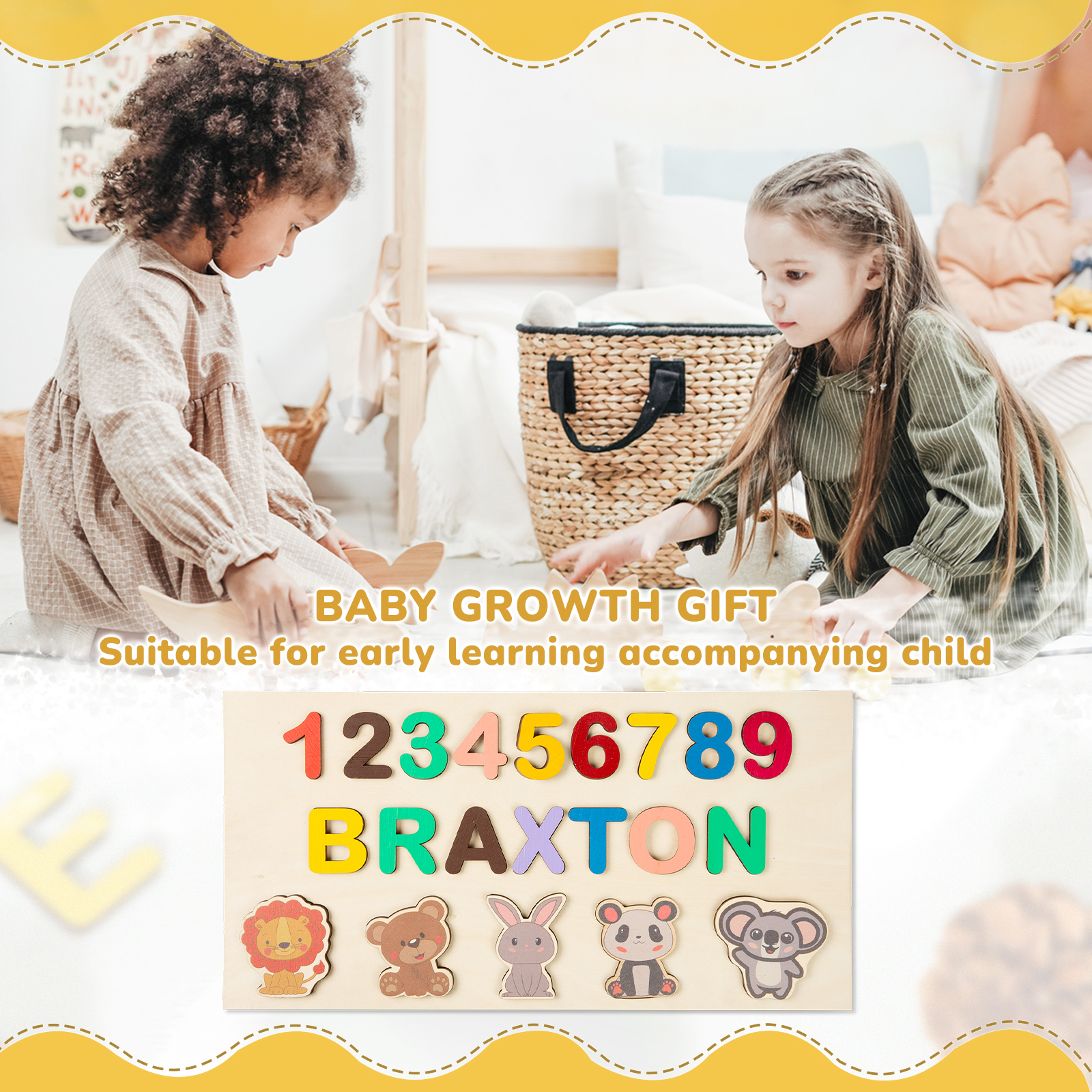Spielendes Lernen ist der beste Weg, um mit dem Unterrichten Ihres Kindes zu beginnen. Wooden Name Puzzle ist ein einfaches und schönes Spielzeug, das Ihrem Kind helfen kann, motorische Fähigkeiten zu entwickeln und Farben und Formen zu erkennen. Zu lernen, wie man seinen Namen buchstabiert, ist eine großartige Möglichkeit für Kinder, sich besonders und geliebt zu fühlen.