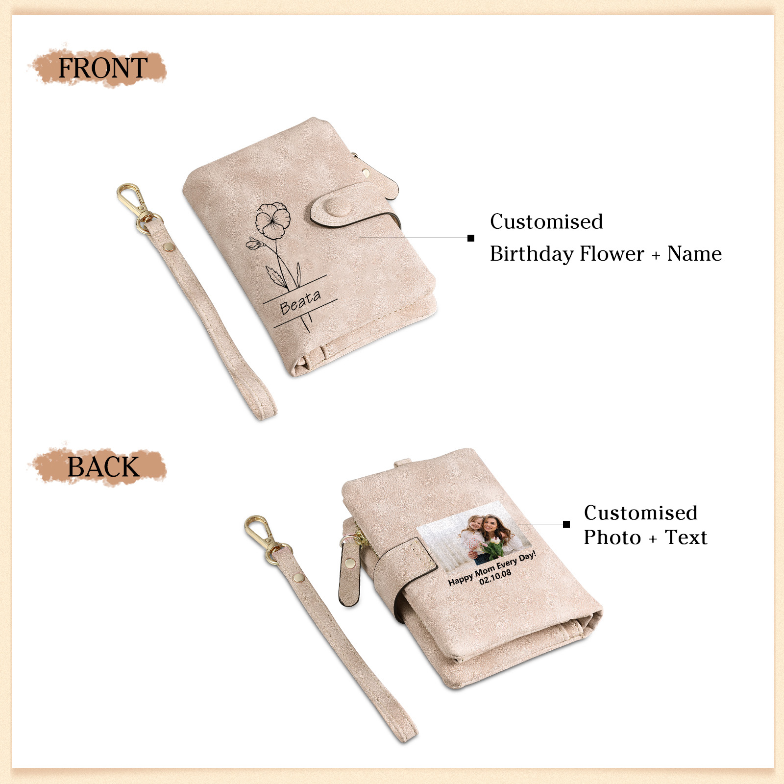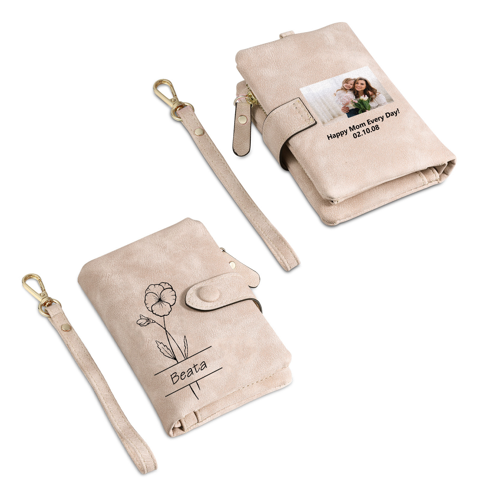 Personalisierter 1 Name & Geburtsblume & Foto & Text Geldbörse aus PU Leder für Frauen