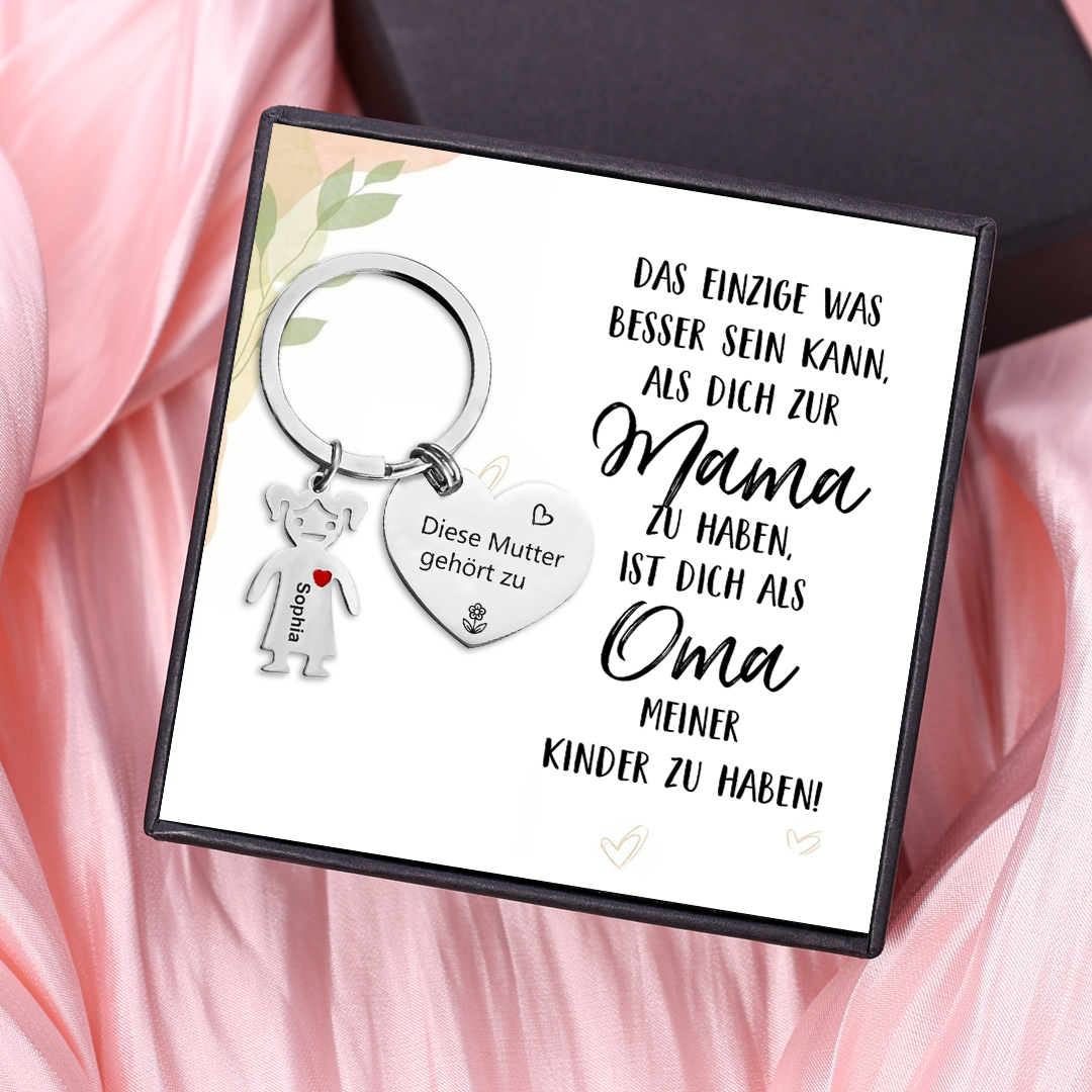 Dieses Geschenk ist perfekt für Ihre Mutter! Es wird in einer Schachtel mit einer aufmerksamen und herzlichen Botschaft geliefert. Wenn sie dieser Schlüsselanhänger trägt, wird sie daran erinnert, dass die Erinnerung, die zwischen euch entstanden ist, für immer wertvoll sein wird. Ein einzigartiges Geschenk, das du nirgendwo anders finden kannst! Sie können 1 Kind-Charm wählen, die an diesem personalisierten Schlüsselanhänger befestigt sind, und jeden Namen, jedes Datum oder Wort nach Wunsch eingravieren lassen.