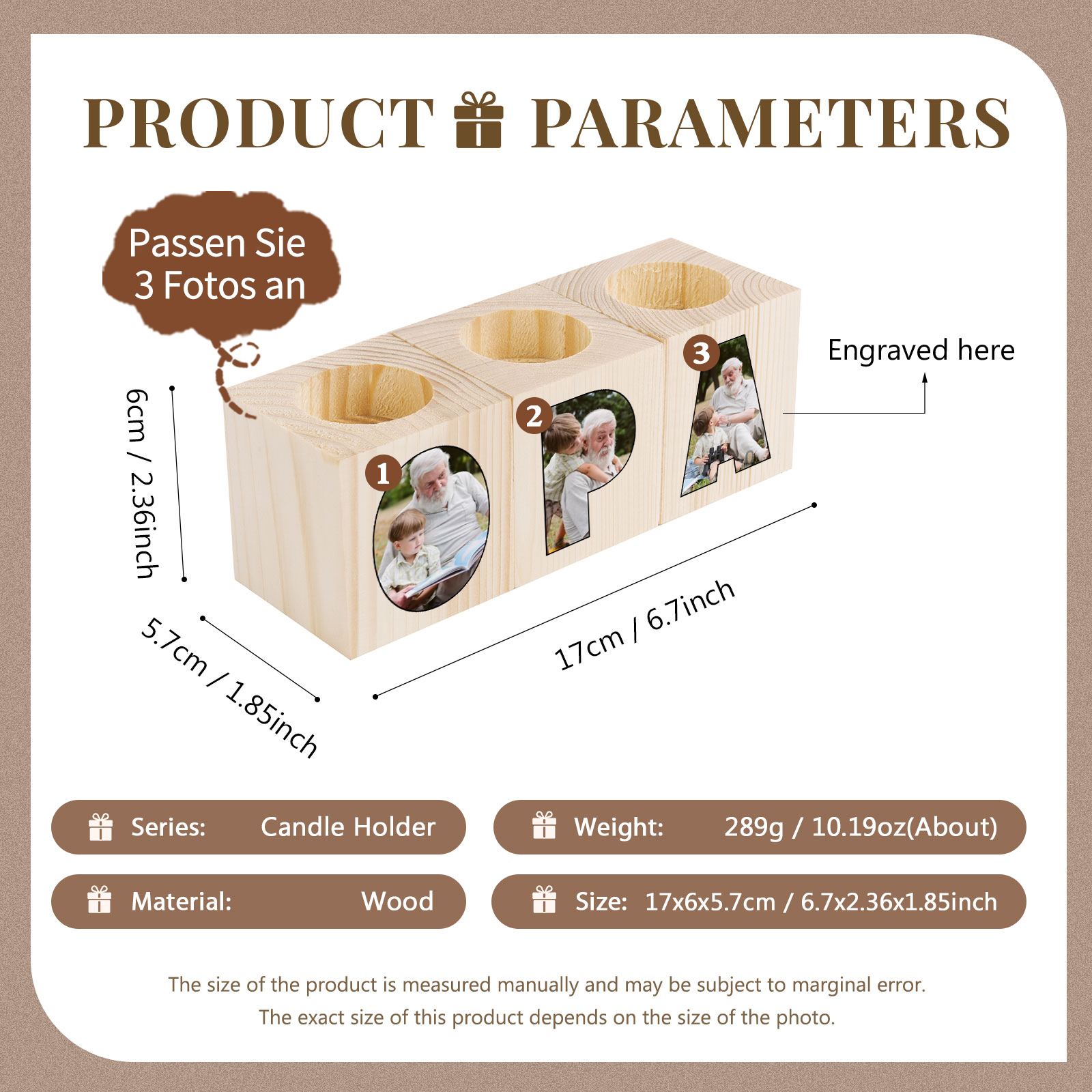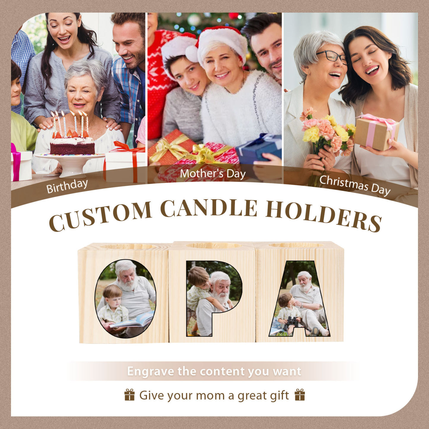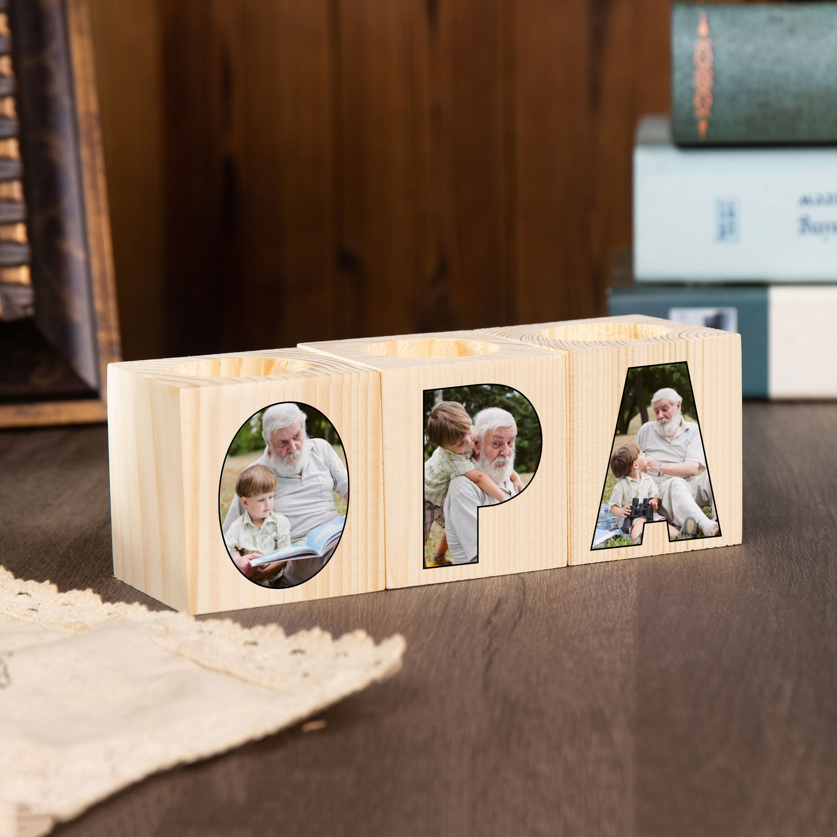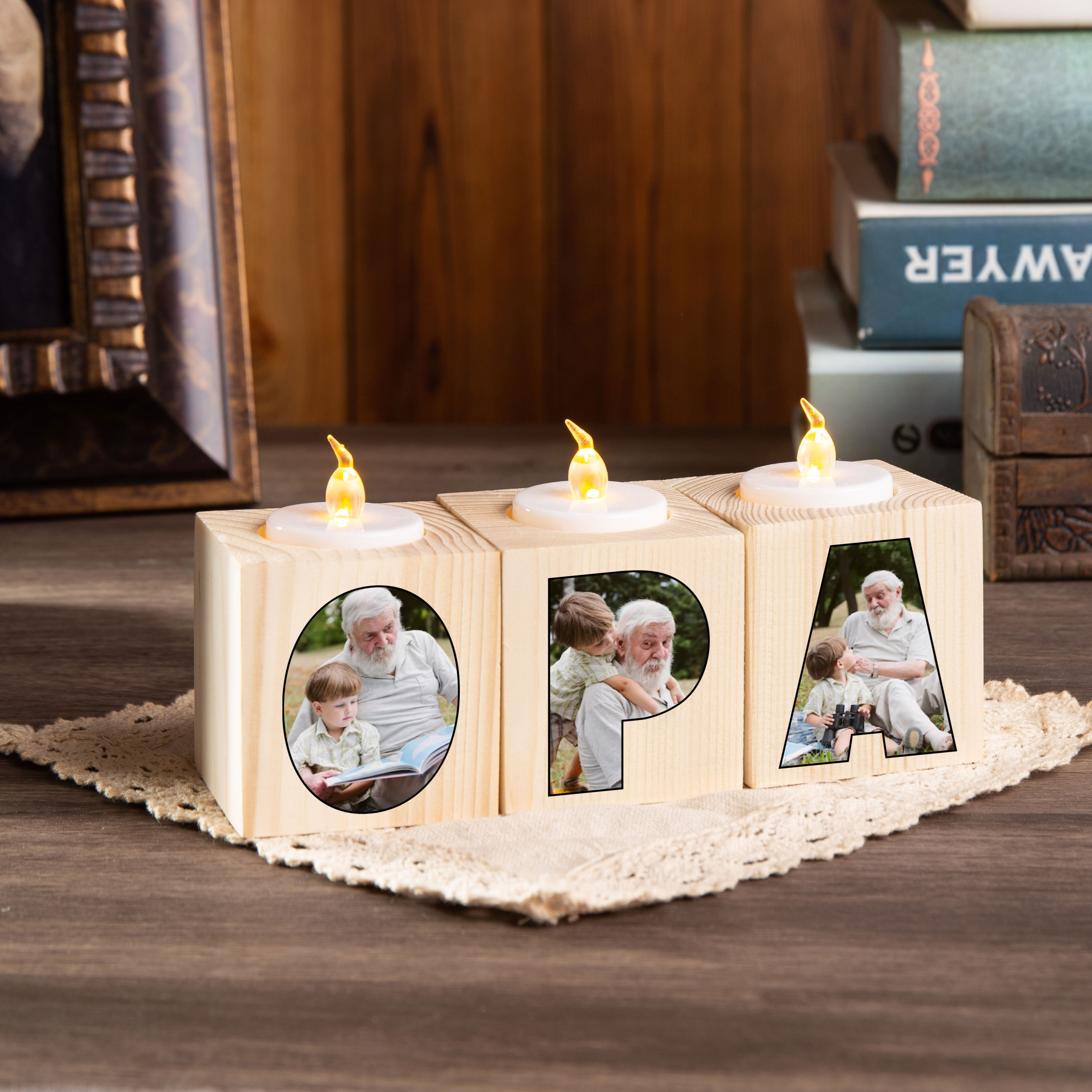 Holz Kompliment Personalisierter 3 bedruckte Seiten 3 Fotos Opa Kerzenhalter-Geschenk für Großvater