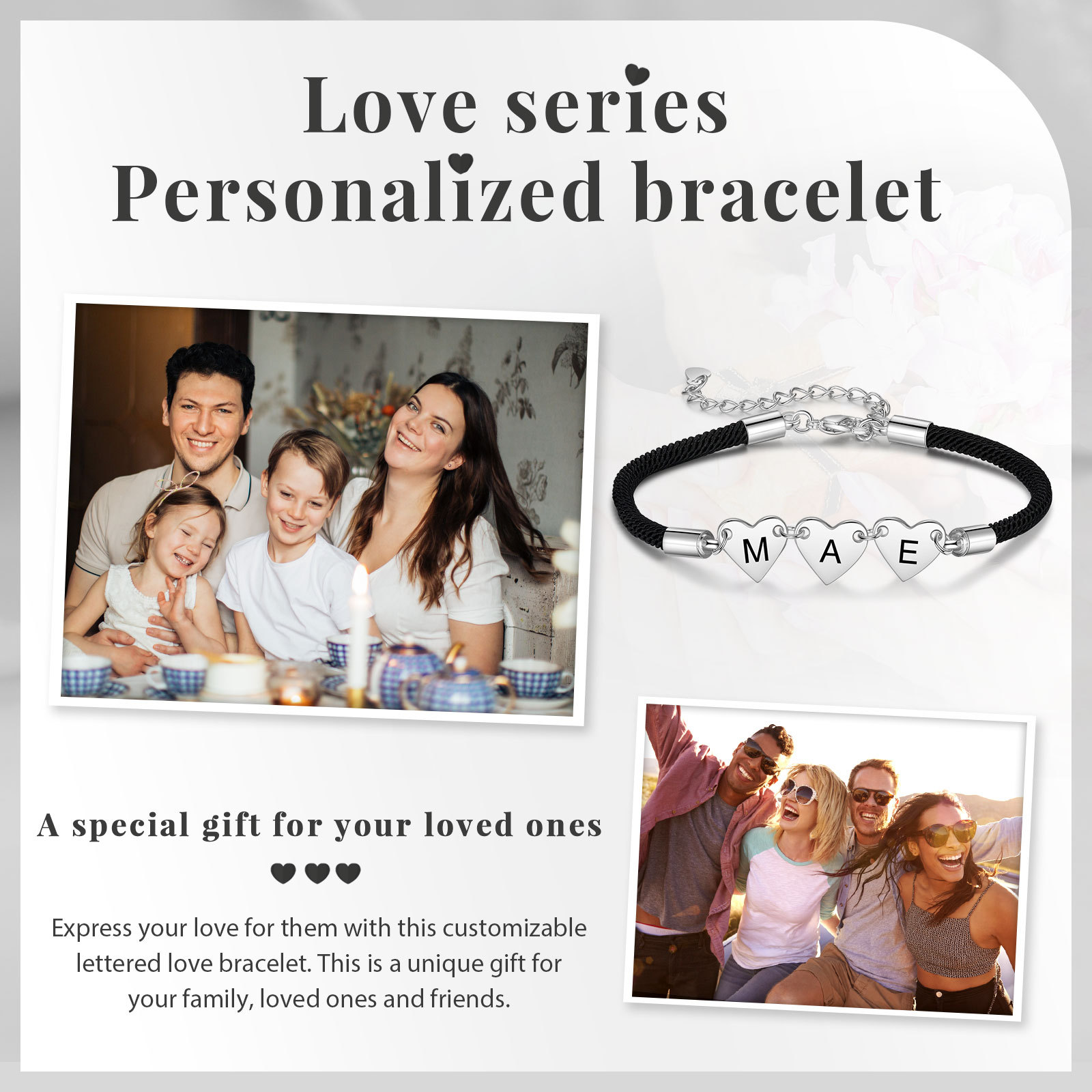 Personalisierter 3 Buchstaben Herz Armband mit Baumwollseil