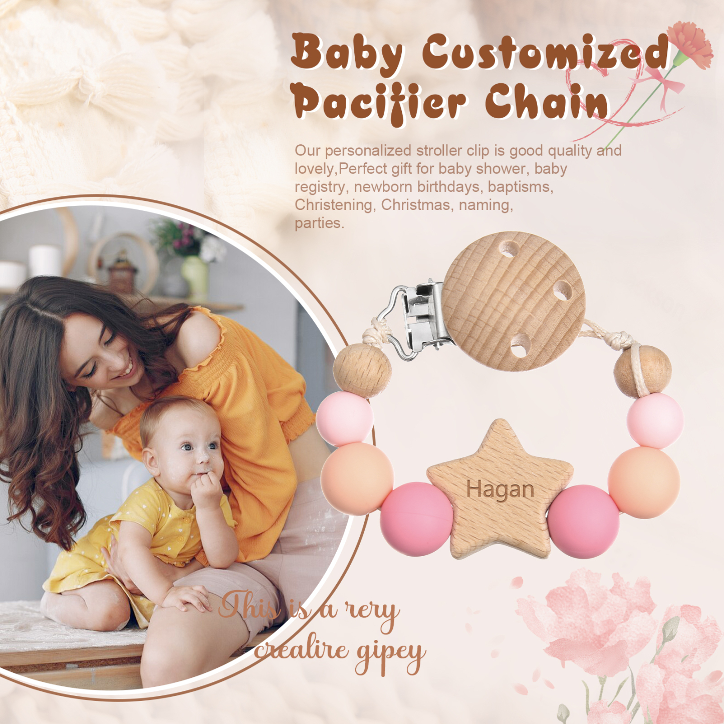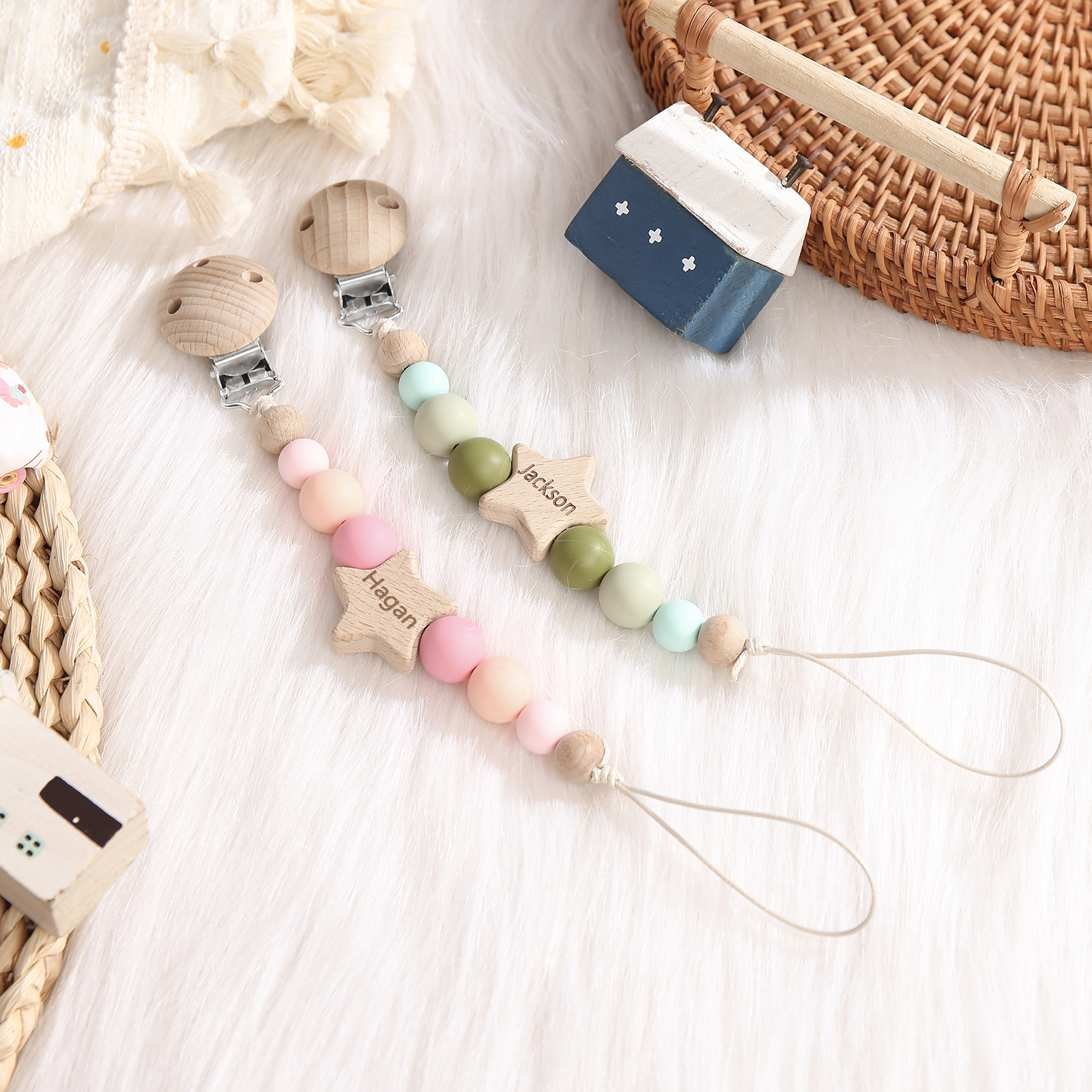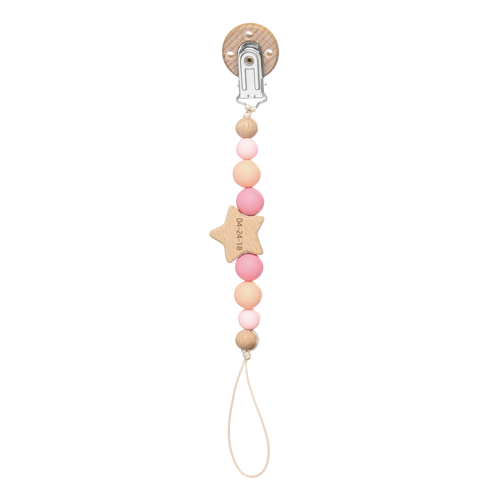 Personalisierter Name & Datum Stern Holz Schnullerkette für Babys