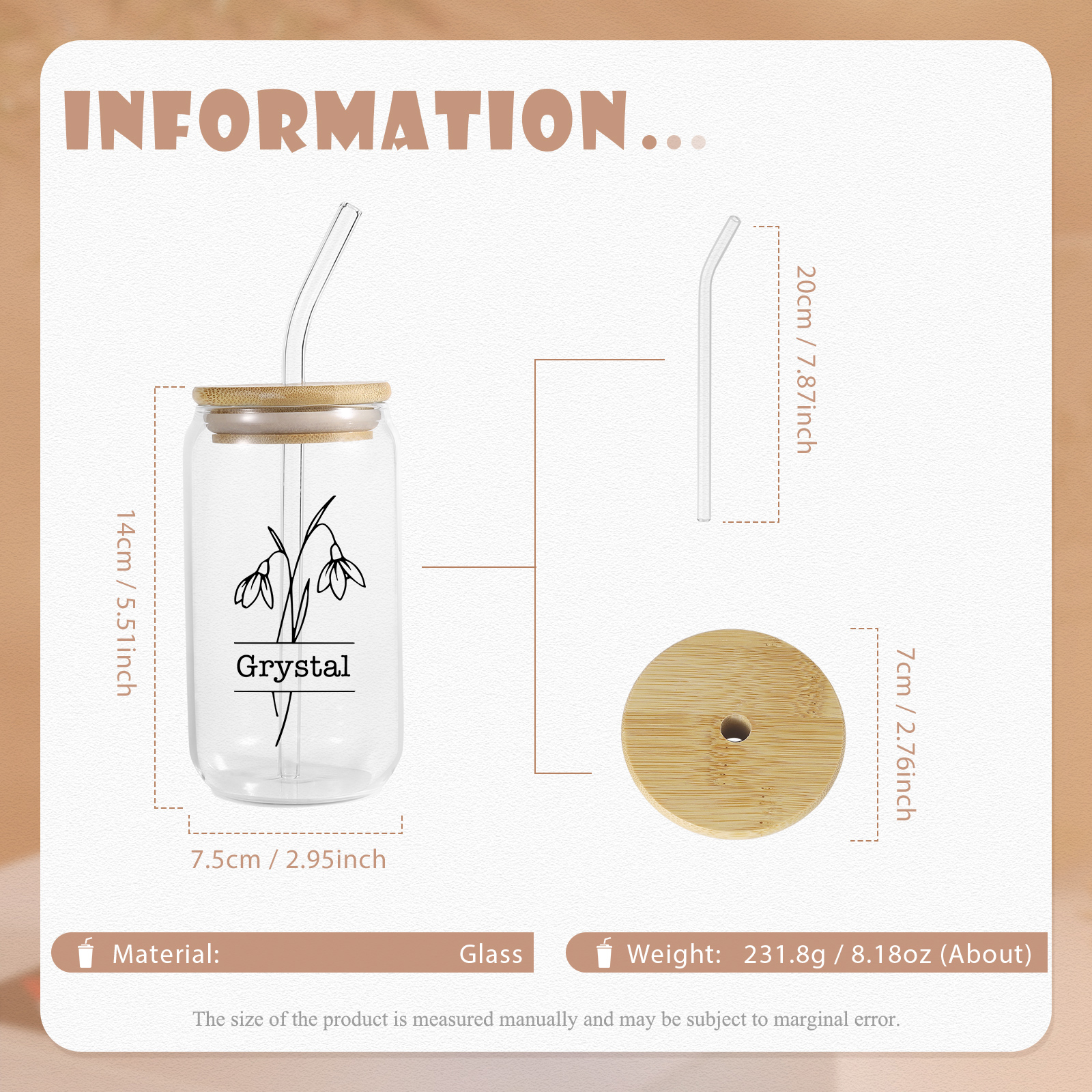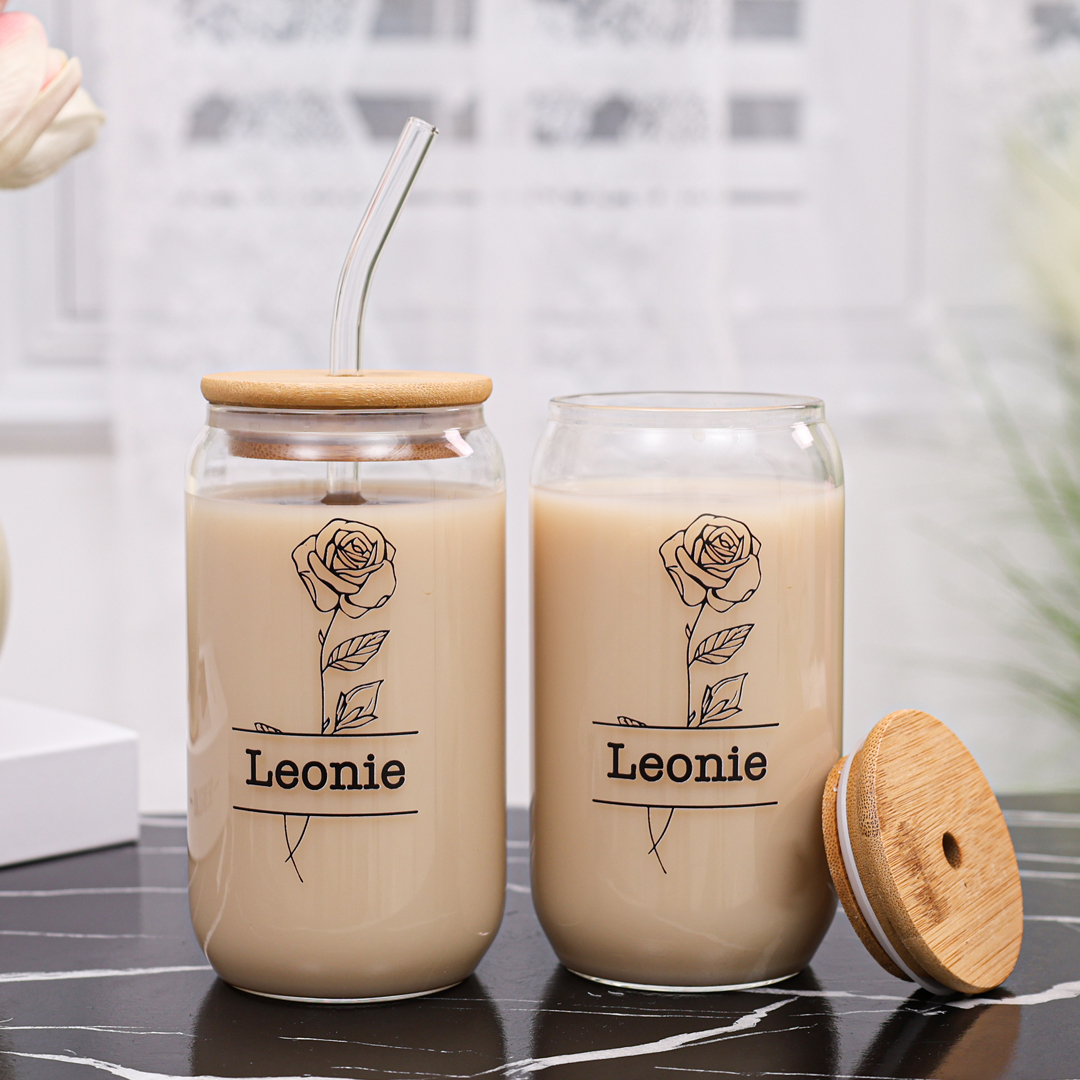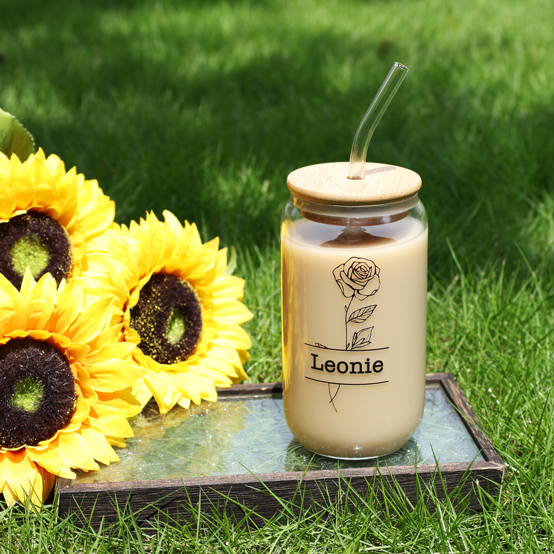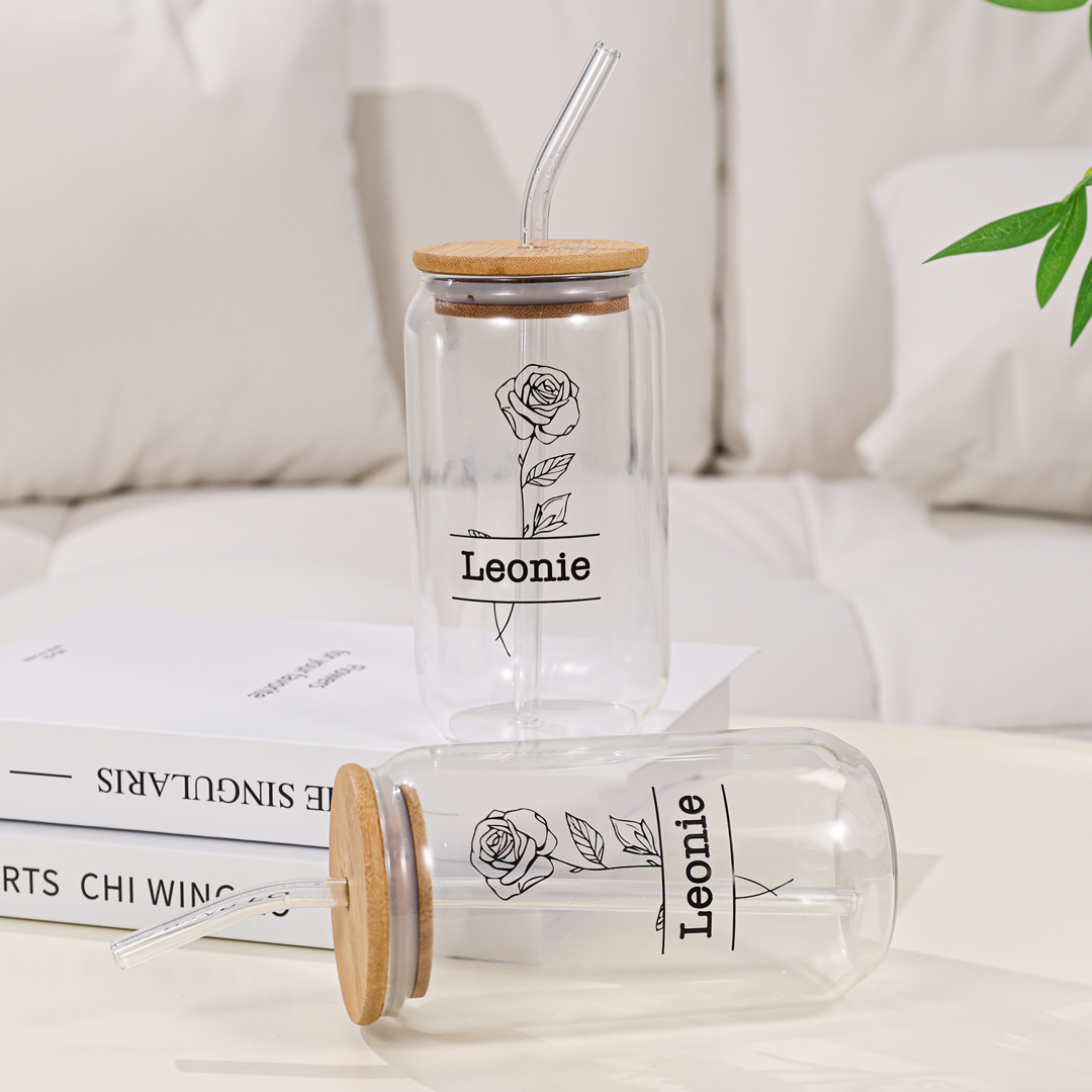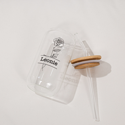 Personalisierter Name & Geburtsblume Glastasse mit Glasstrohhalm