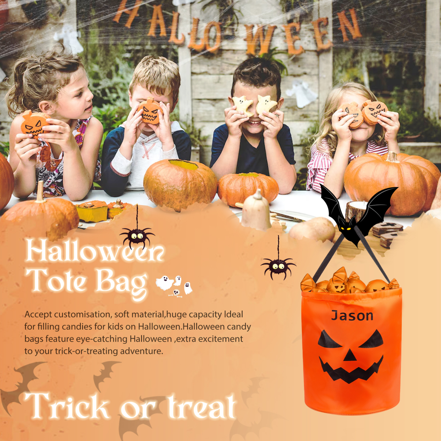 sich diese Tasche ideal dafür. Sie ist auf Vorderseite mit einem süßem Karikatur-Gesicht bedruckt. Sie bietet viel Platz und lässt sich durch zwei Henkel prima tragen. Die Halloweentasche eignet sich auch als Accessoire für Ihre Halloween Party.