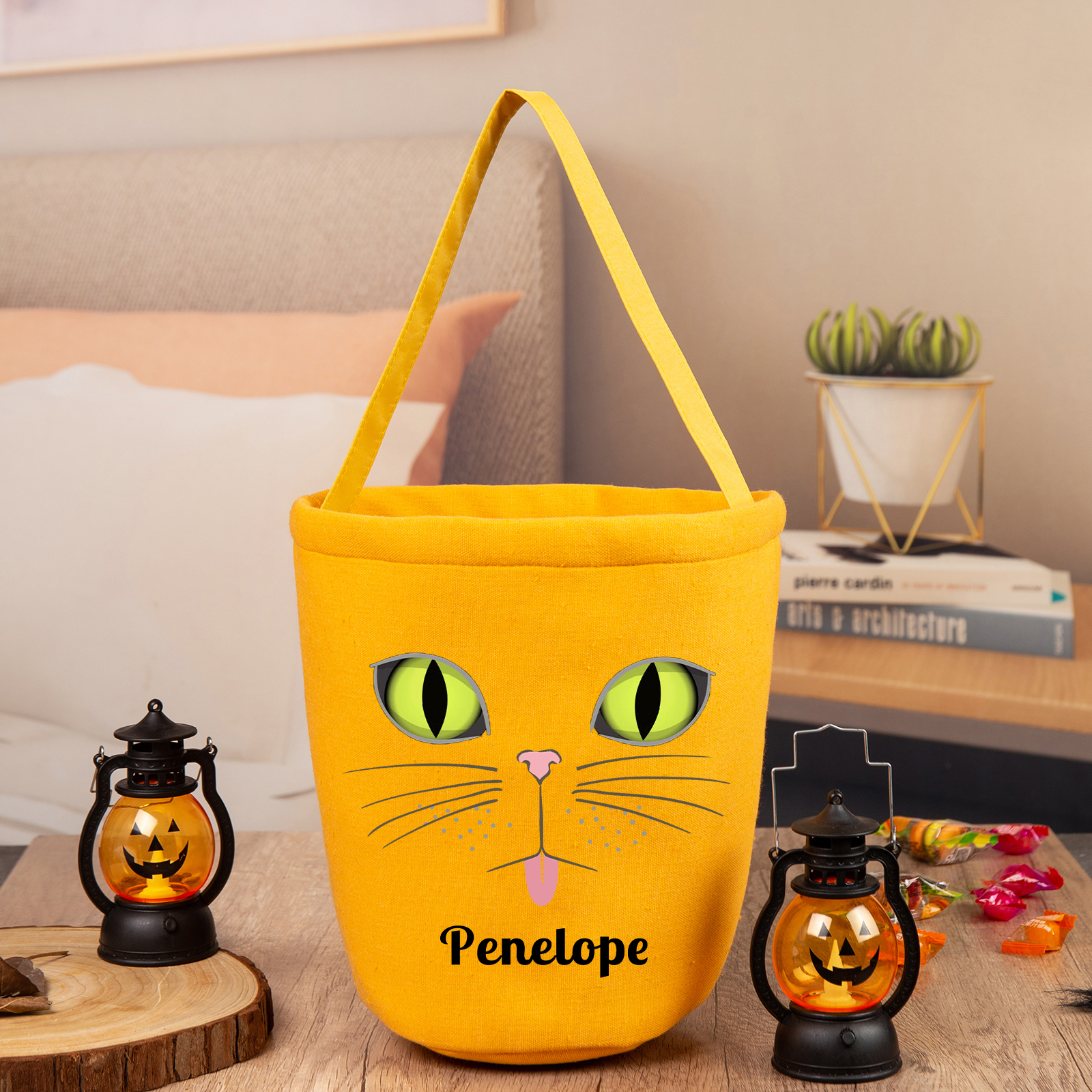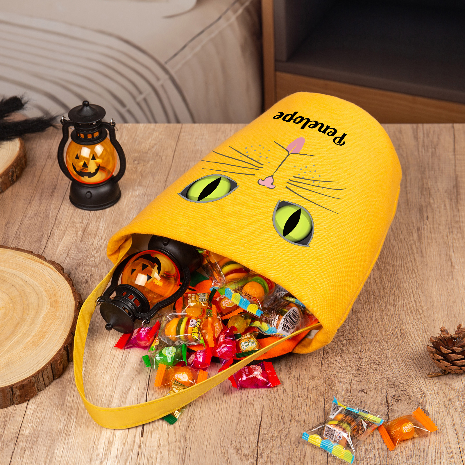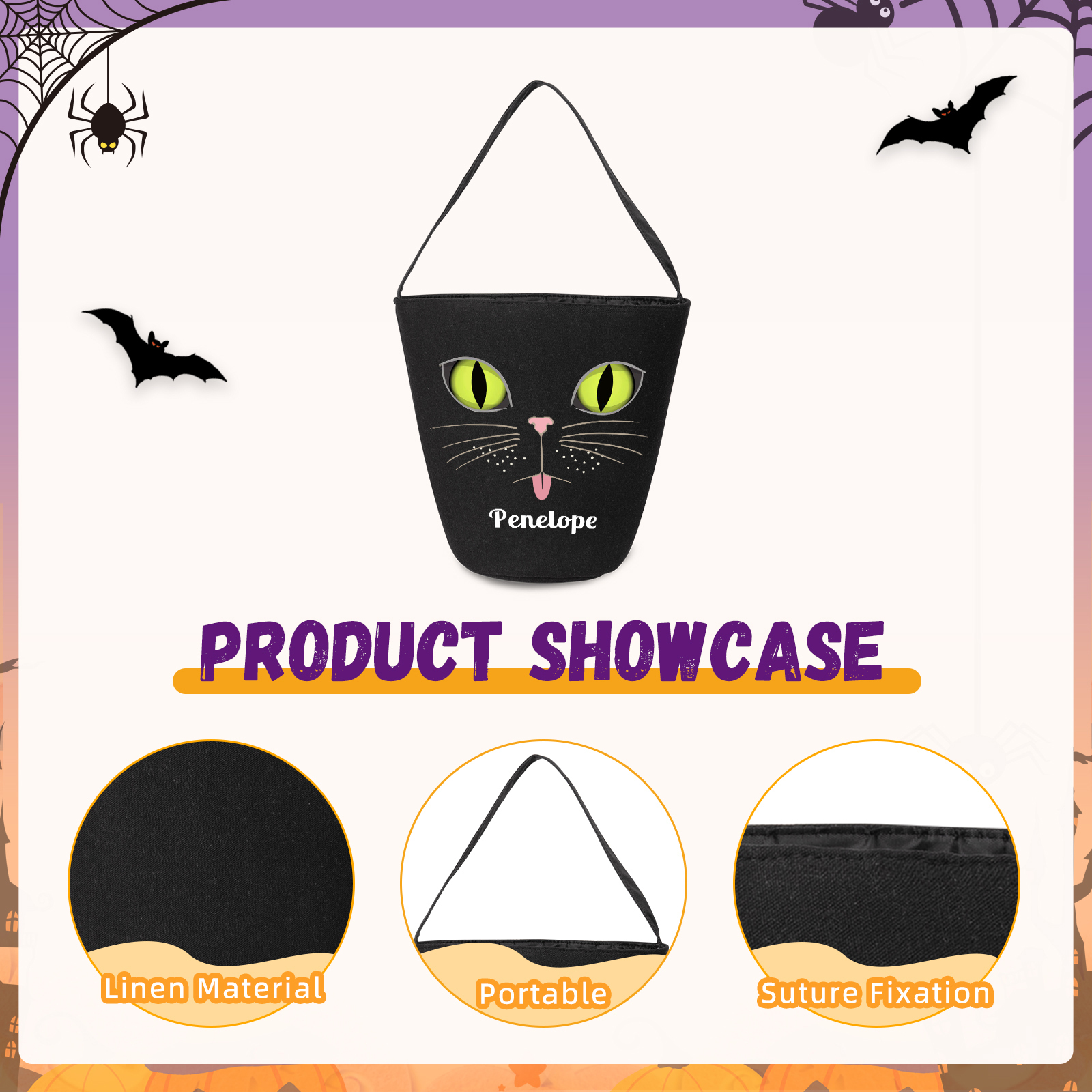 Personalisierter Name Katze Halloween Leinen Tasche Süßes Oder Saures Süßigkeiten Tasche