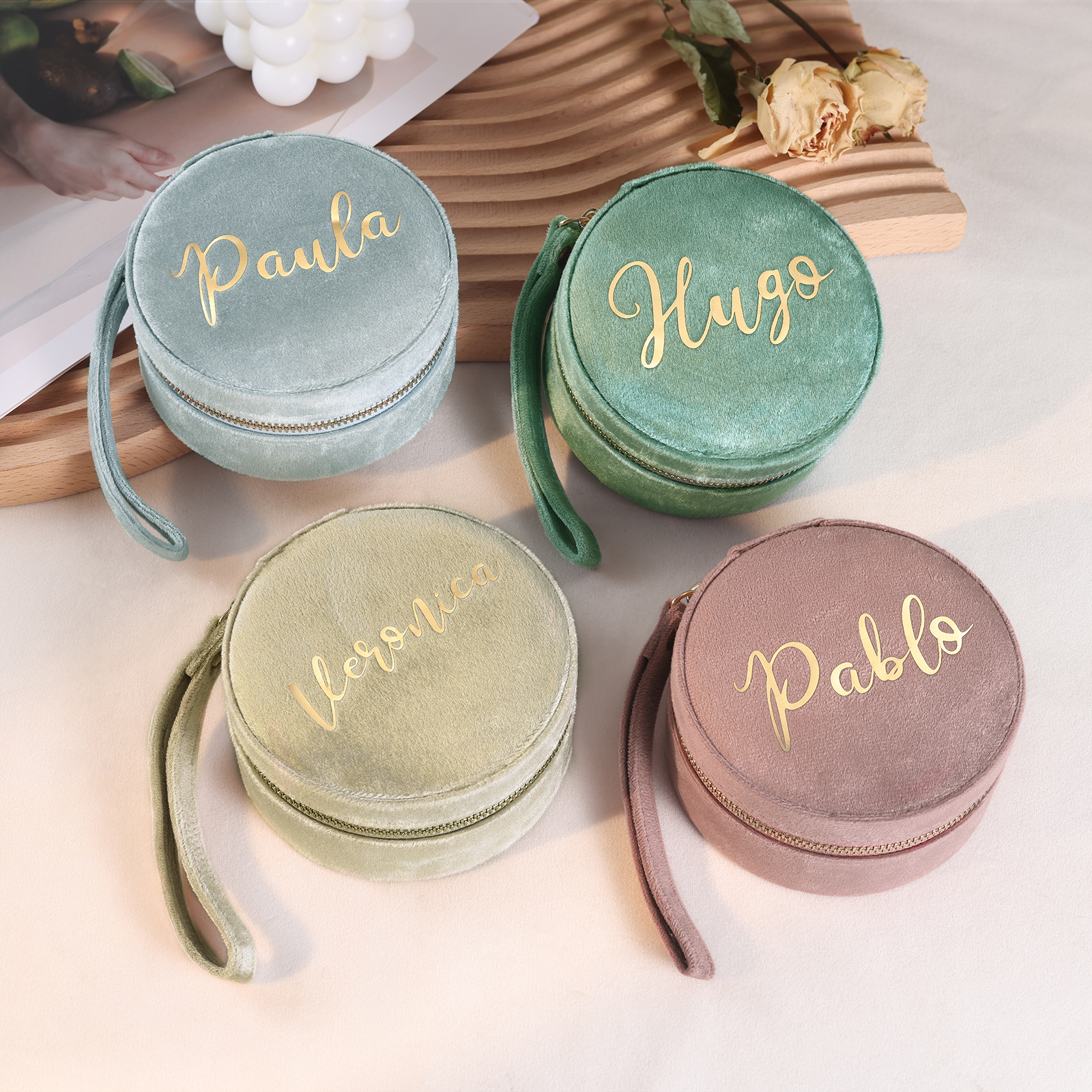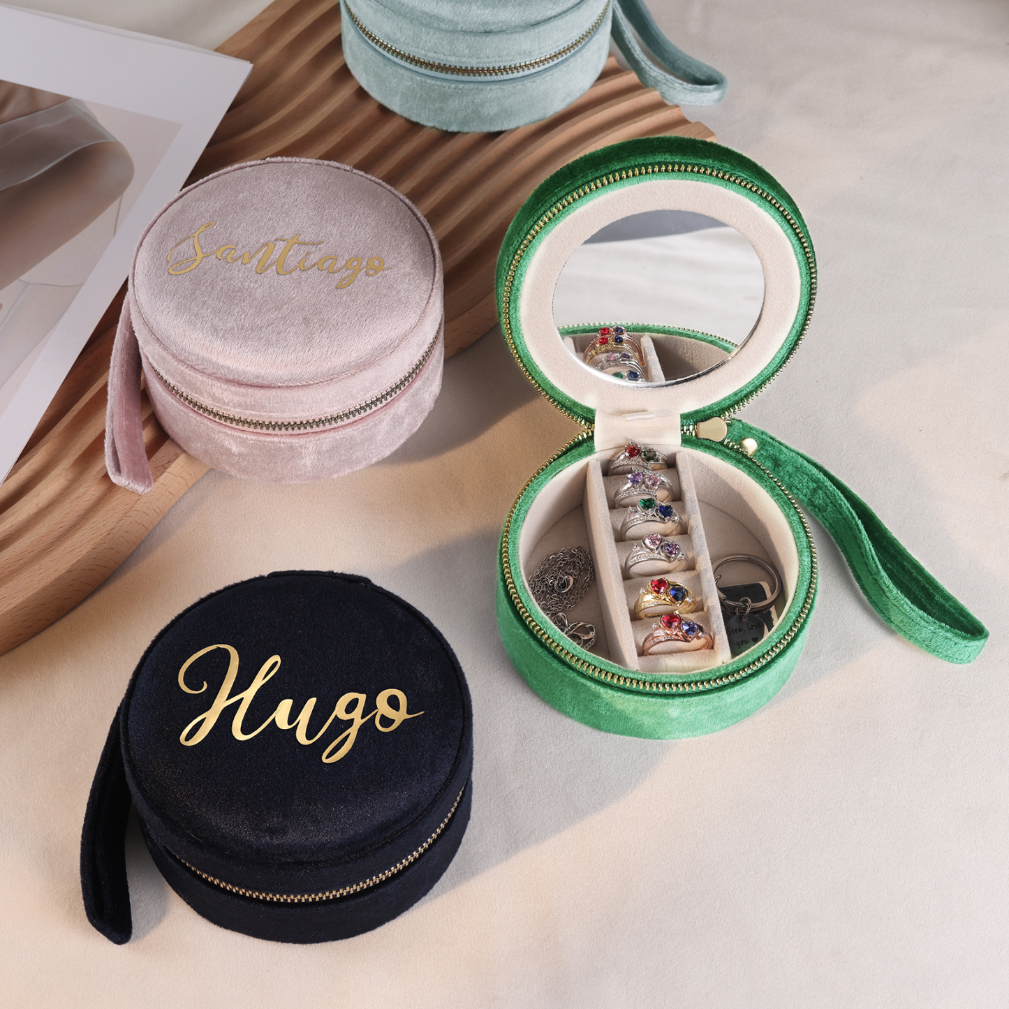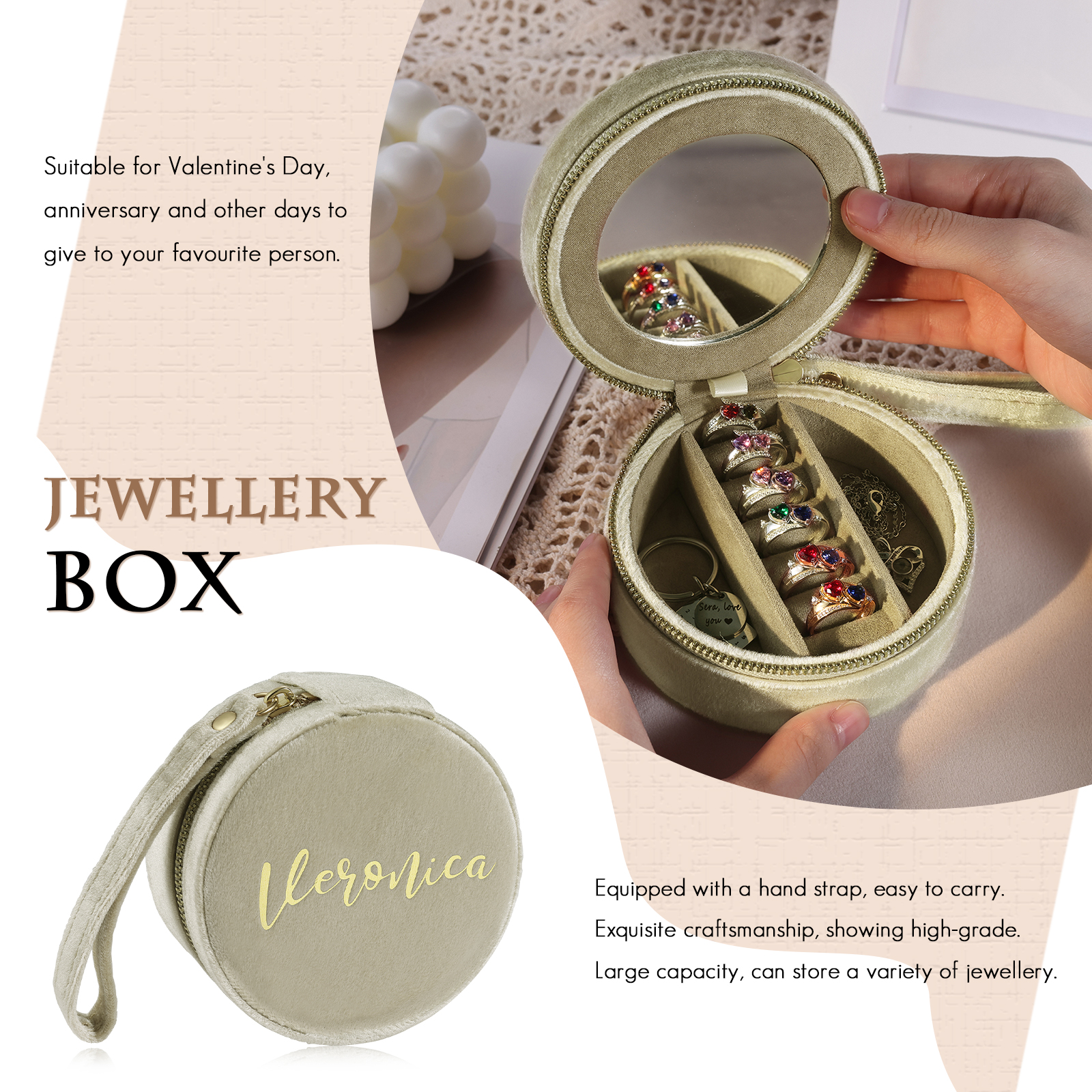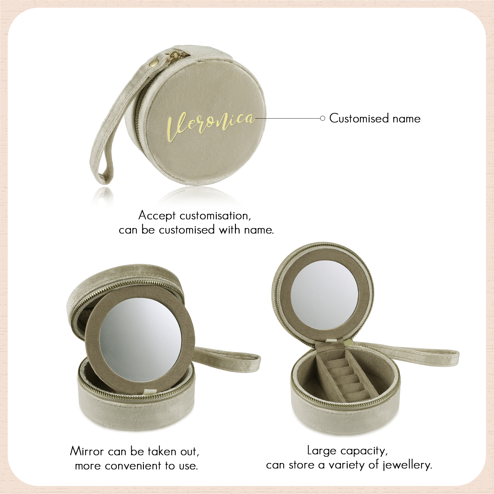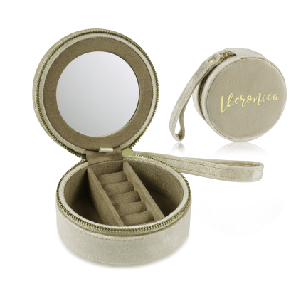 Personalisierter Name Rund Velvet tragbar Schmuckaufbewahrung Mit Spiegel Schmuckzubehör Aufbewahrungsbox für Schmuck