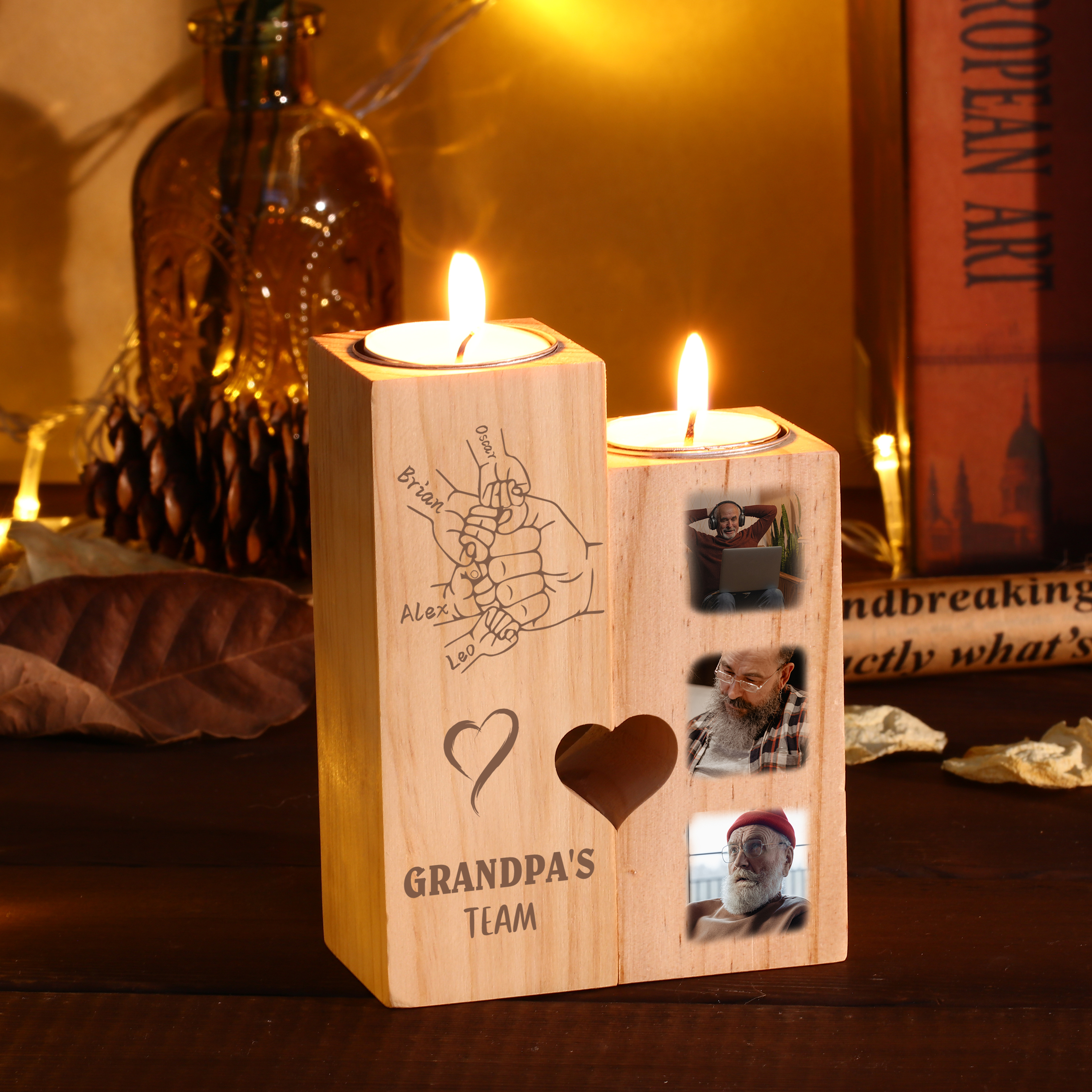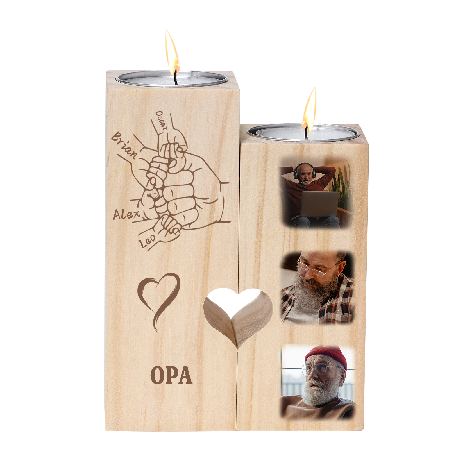Personalisierter Text & 4 Namen & 3 Foto Kerzenhalter-Kerzenständer für Großvater