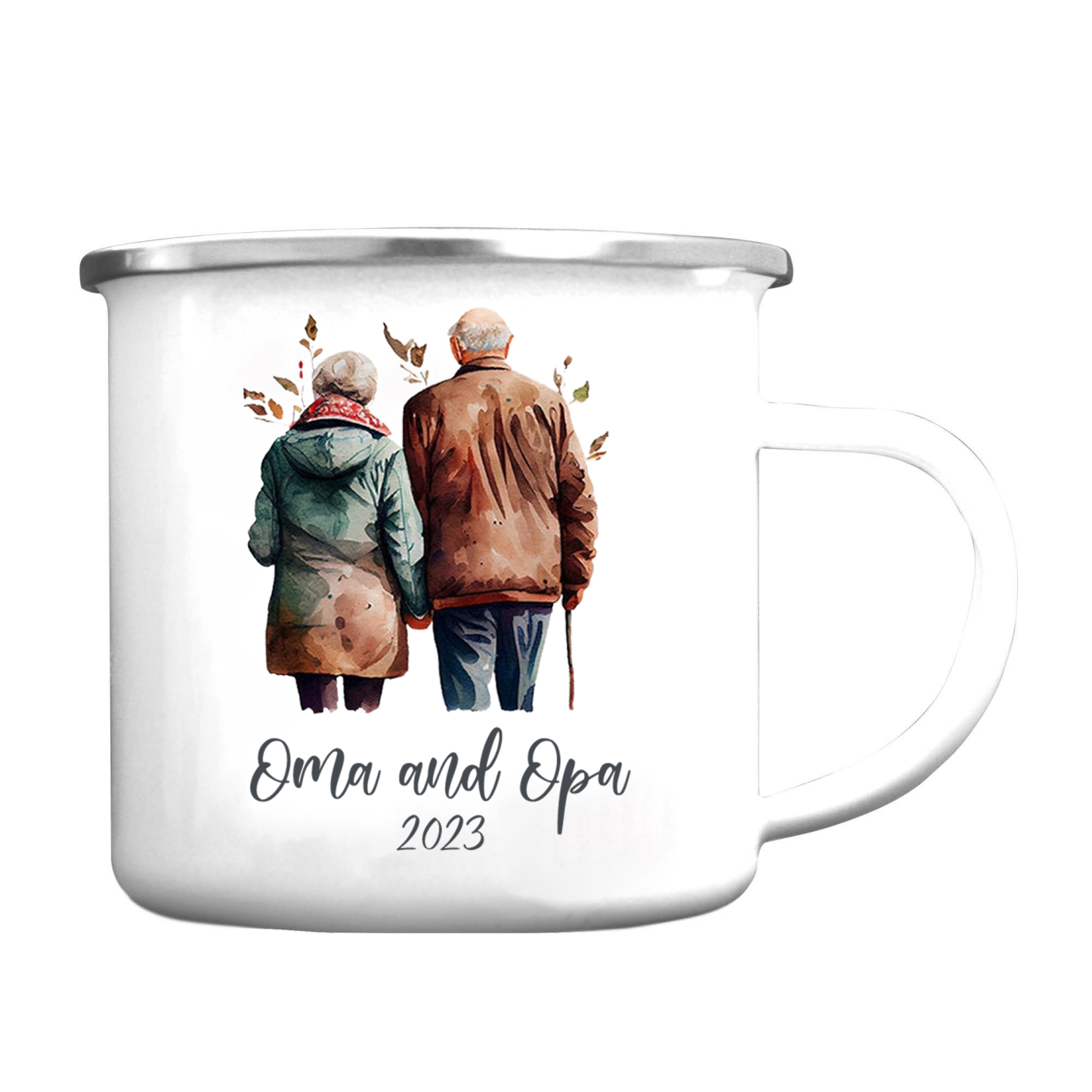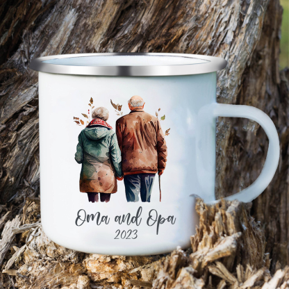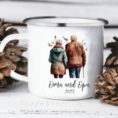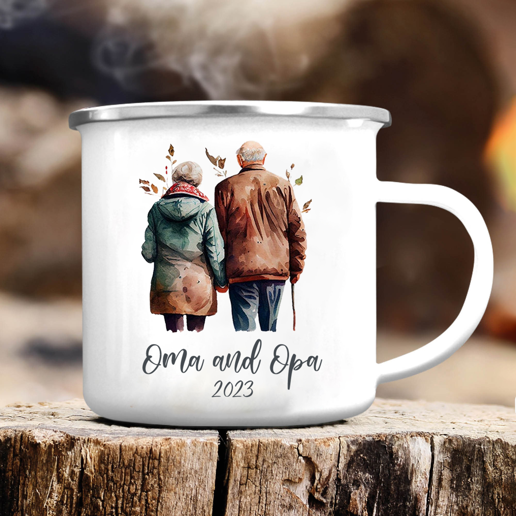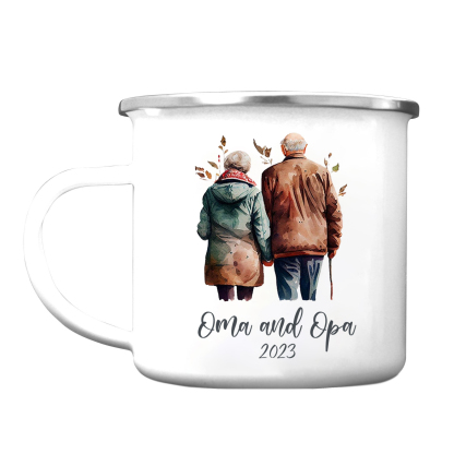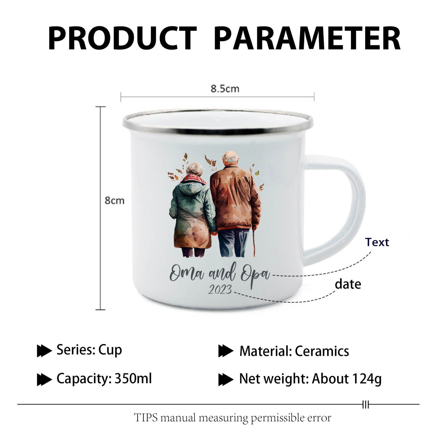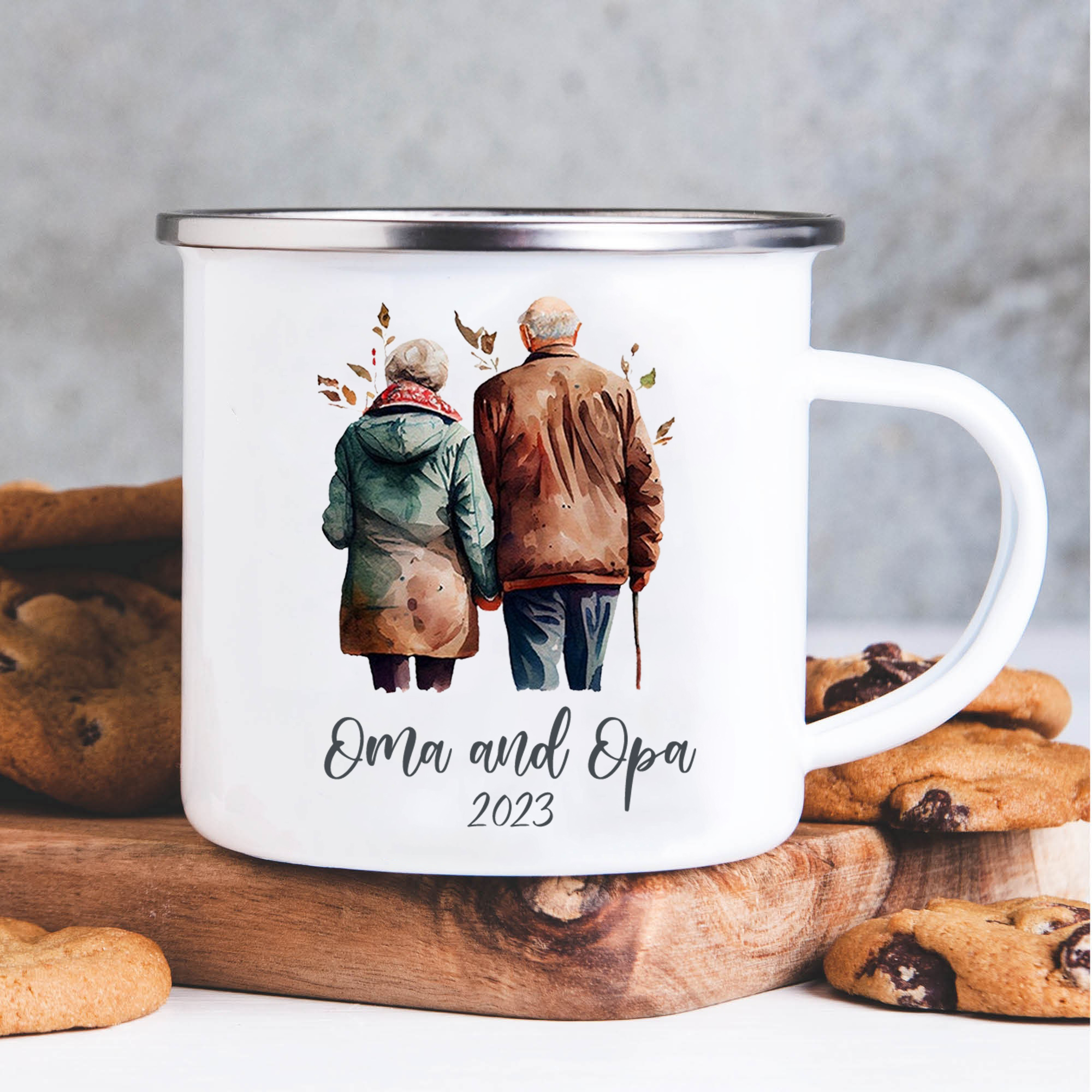 Personalisierter Text & Datum Emaille Tasse-Geschenk zum Großelterntag für Großmutter und Großvater