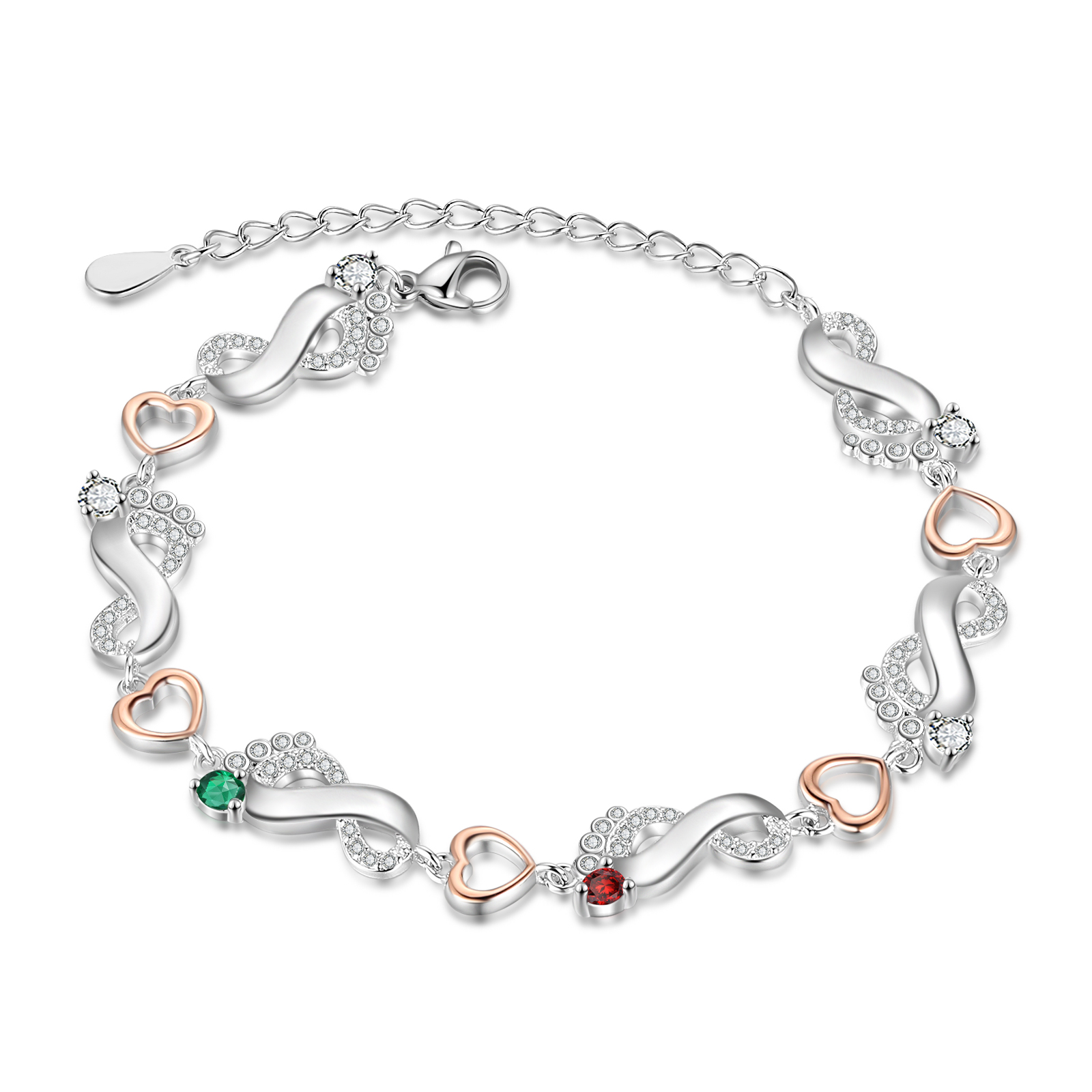 Personalisiertes 2 Namen Herz Babyfüße Armband mit 2 Geburtssteinen