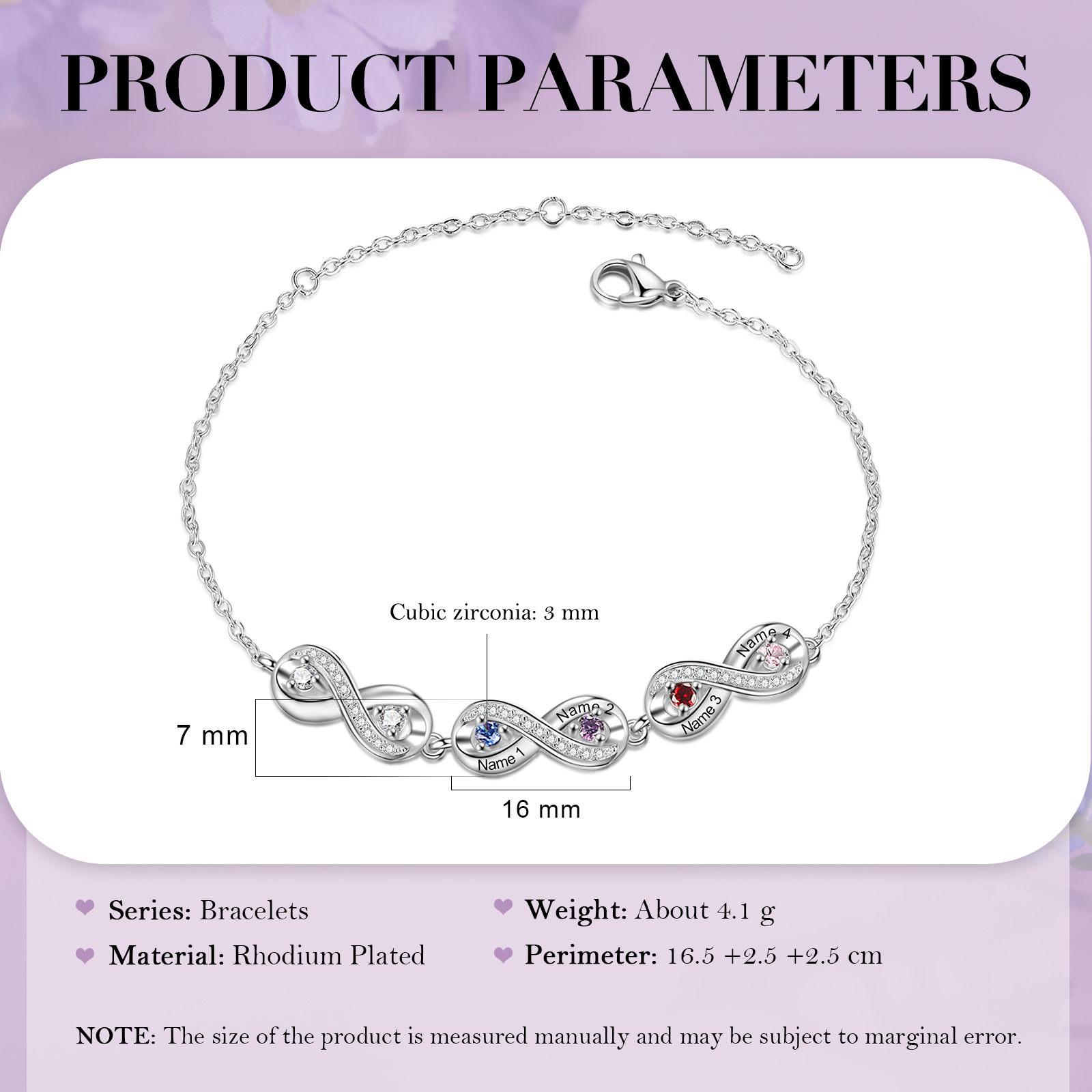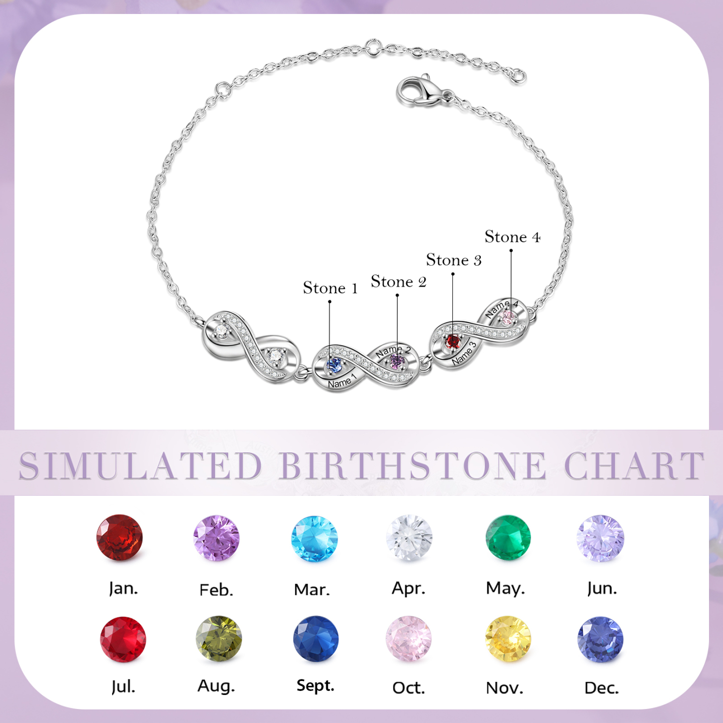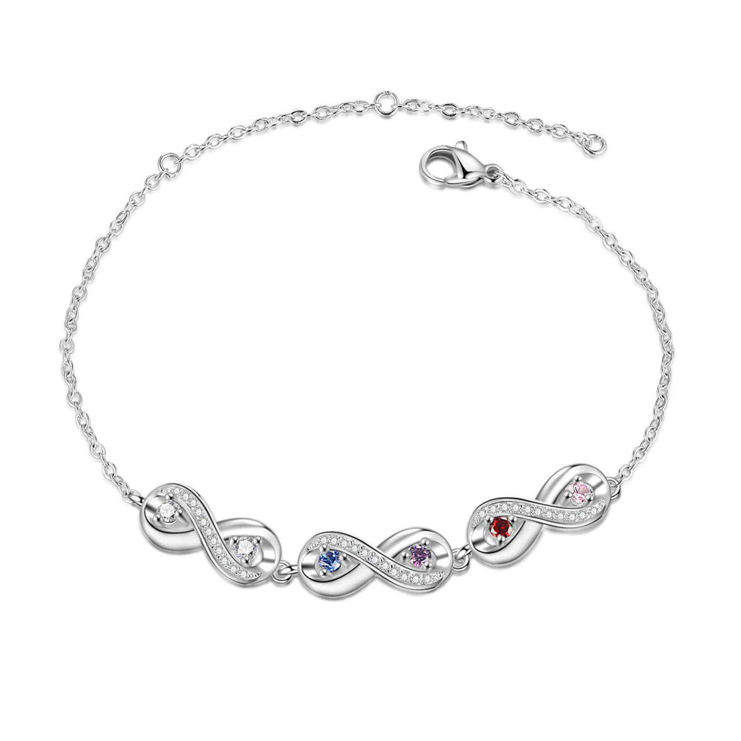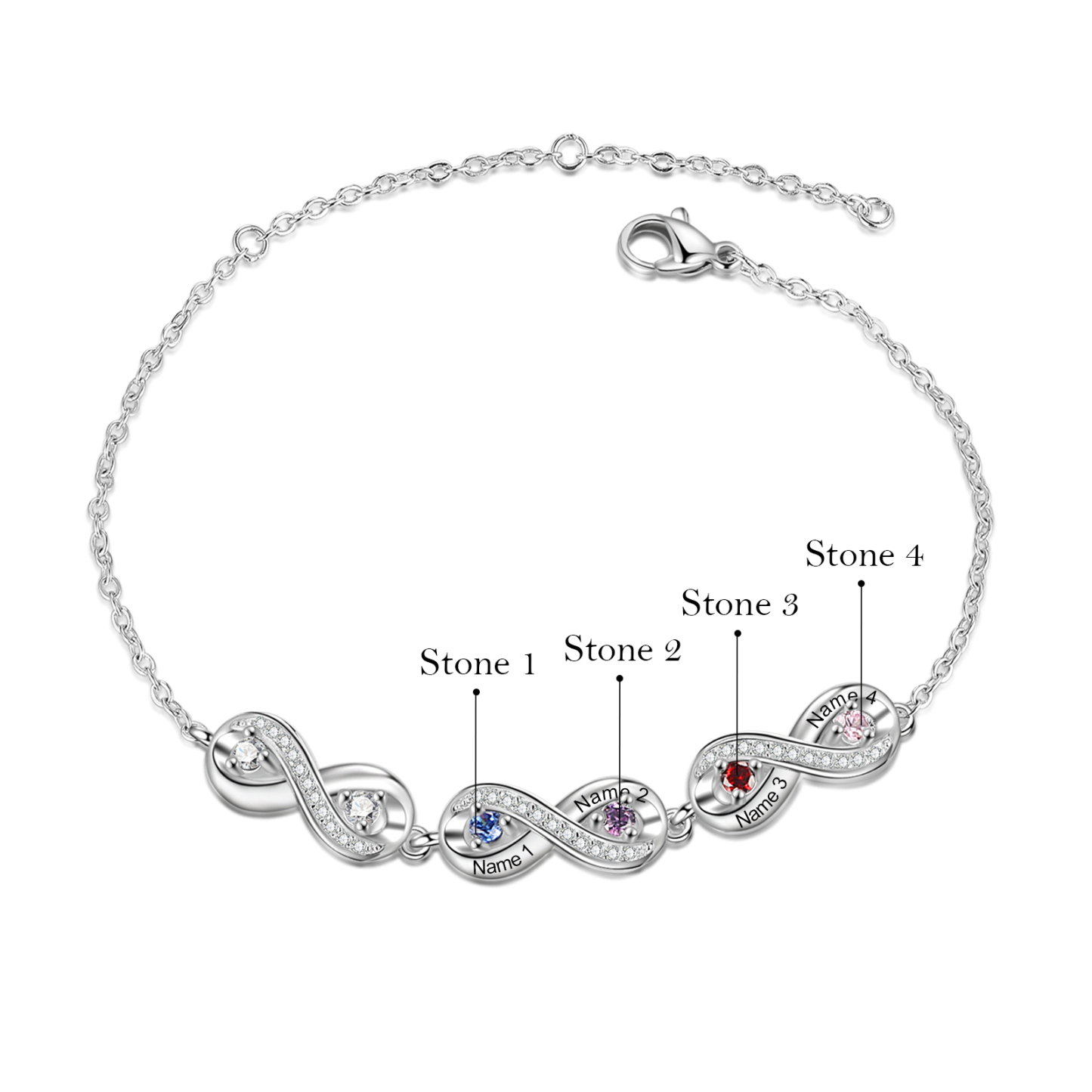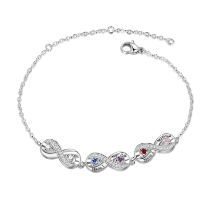 Personalisiertes 4 Namen & 4 Geburtssteine Infinity Armband mit Zirkonia